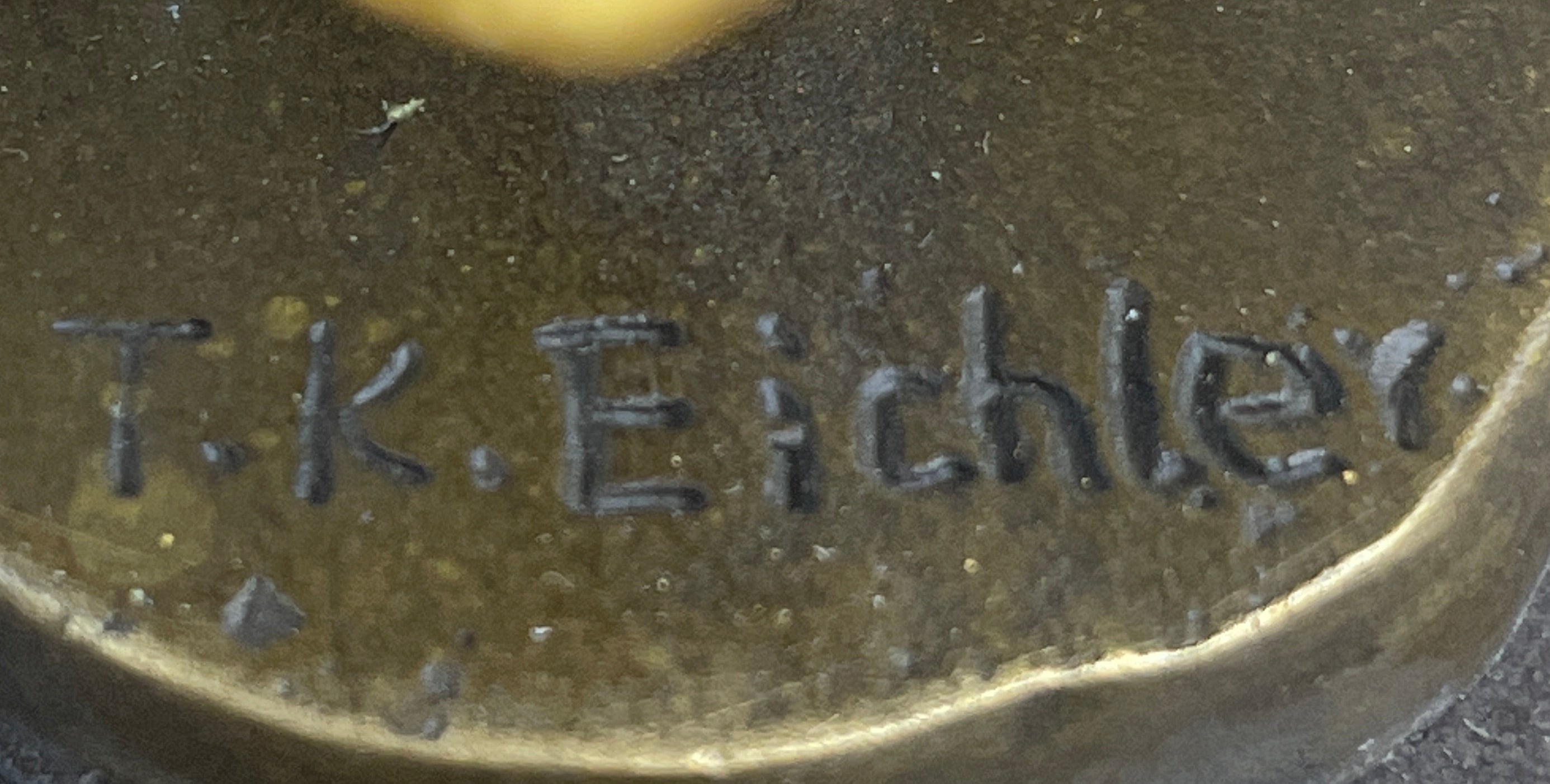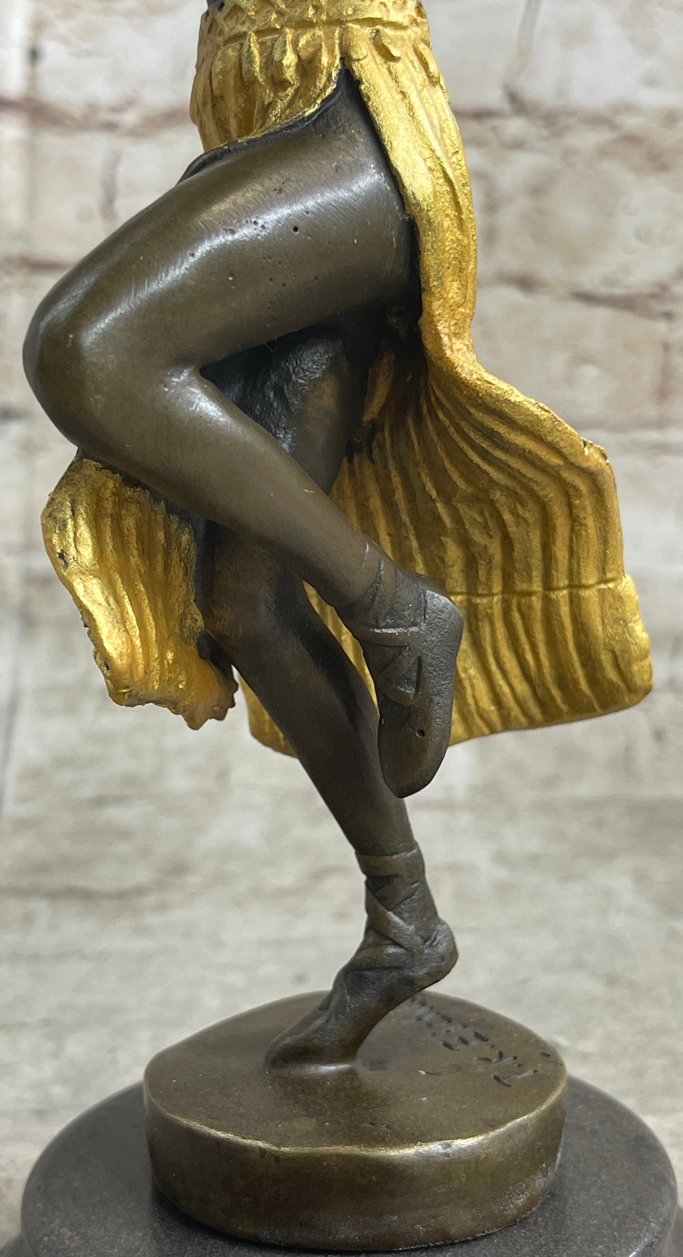 Feeling of motion and excitement conveyed by dancer`s Costome, gesture and facial expression. Smooth quality chasing of figure. Eichler also modeled porcelain dancers for Meissen. This 100% bronze sculpture was crafted using the lost wax method. It is set on a black marble base. It is signed T.K Eichler.Bronze Dimensions with Marble Base: Height 10" x Width 4"