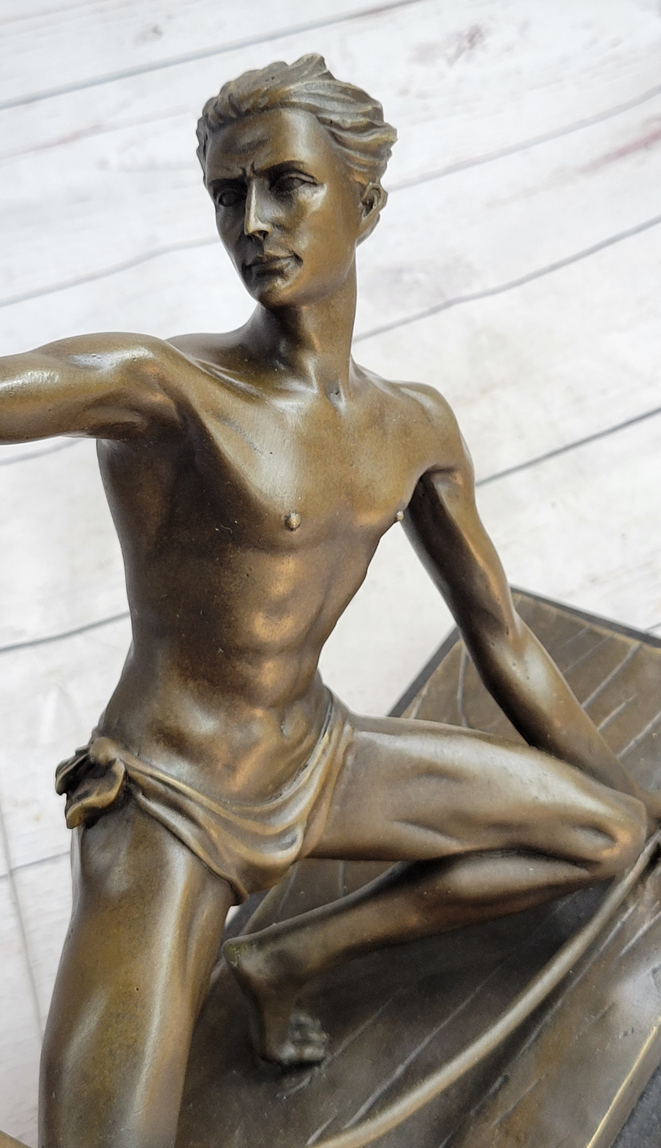 Crafted with meticulous attention to detail, the sculpture highlights the artist's skillful portrayal of the human form. Each carefully constructed muscle in the figure's arms, chest, stomach, and legs is intricately delineated, emphasizing the sculptor's dedication to capturing the intricacies of the human anatomy. The precise detailing extends to the portrayal of the figure's facial features, revealing his clenched jaw and defined cheekbones, imparting a sense of intensity and unwavering resolve.