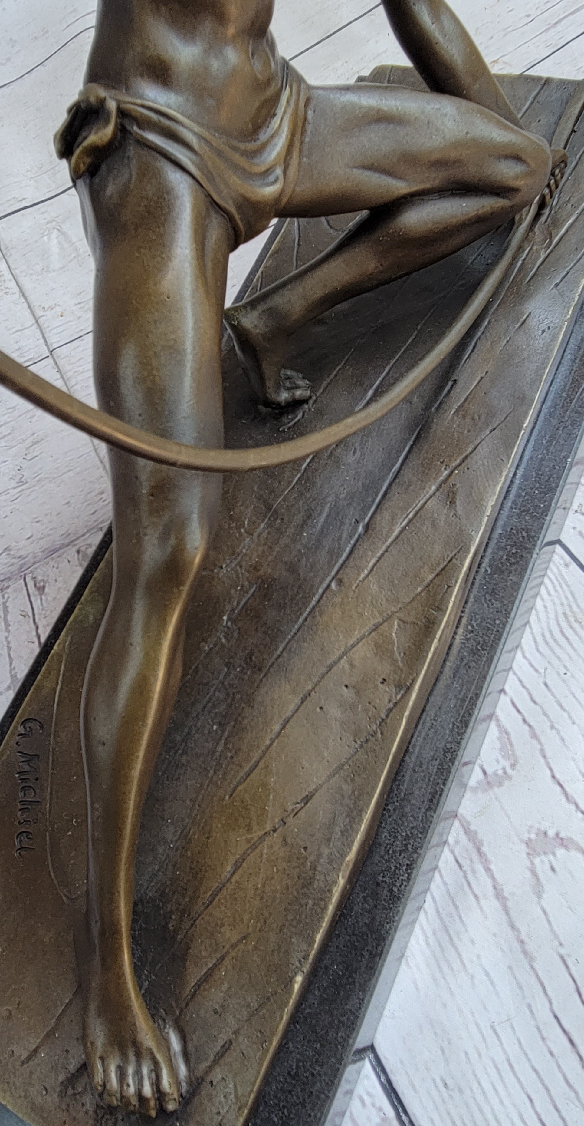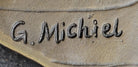 Fashioned entirely from bronze and meticulously shaped by hand, this striking sculpture boasts a captivating two-toned brown patina, elevating its visual appeal and adding depth to its overall aesthetic. Created using the renowned "Lost Wax Method," the sculpture stands as a testament to the artist's mastery and commitment to preserving the timeless tradition of sculptural artistry. Mounted on a sturdy marble base and bearing the signature of G. Michiel, this exceptional piece epitomizes the seamless fusion of strength, grace, and artistic craftsmanship, serving as a testament to the enduring power and beauty of the human form.Bronze Dimensions with Marble Base: Height 14" X Width 16 1/2"