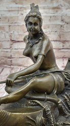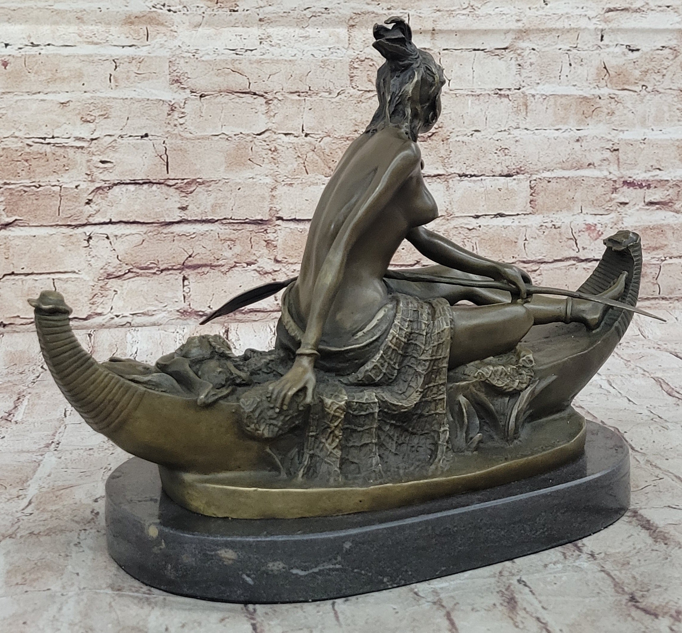 Semi Nude Topless Native American Girl in Canoe Boat Bronze Statue Sculpture Art