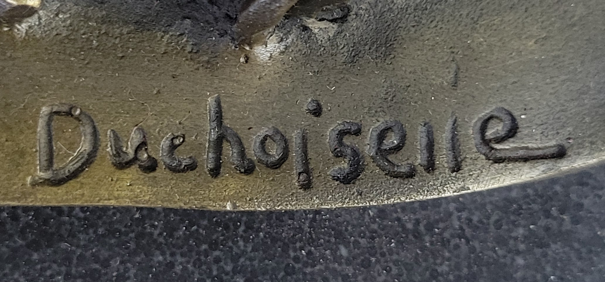 Crafted using the ancient "Lost Wax Method," this sculpture is made of solid 100% bronze, ensuring its durability and quality. The two-tone brown patina finish enhances the sculpture's timeless beauty, highlighting the delicate craftsmanship and attention to detail. The figure is mounted on a solid black marble base, providing a striking contrast that adds to the overall sophistication of the piece. The artist, Duchoiselle, has signed this work, further attesting to its quality and artistic value.