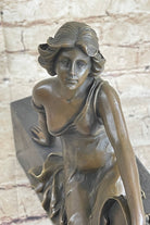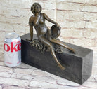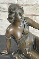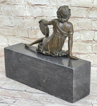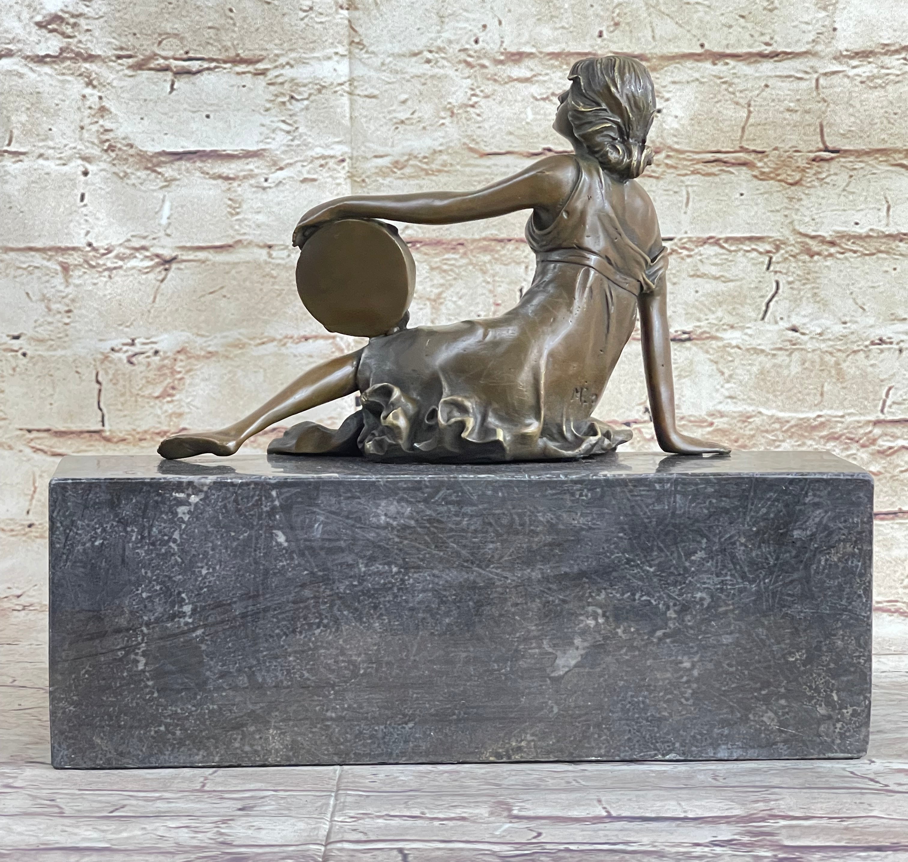 Semi Nude Young Reclining Woman w/ Tambourine - Bronze Sculpture Statue on Marble Base