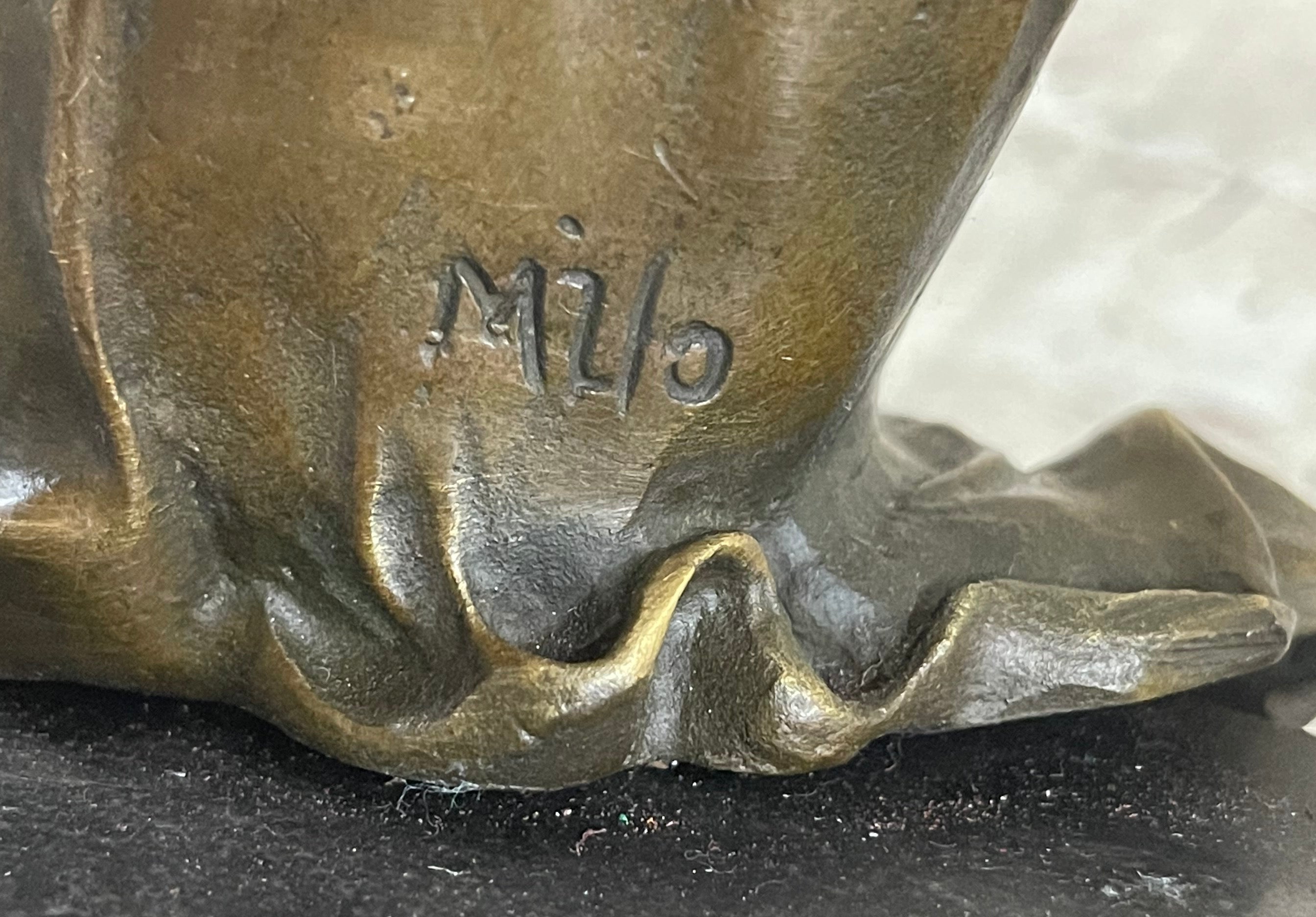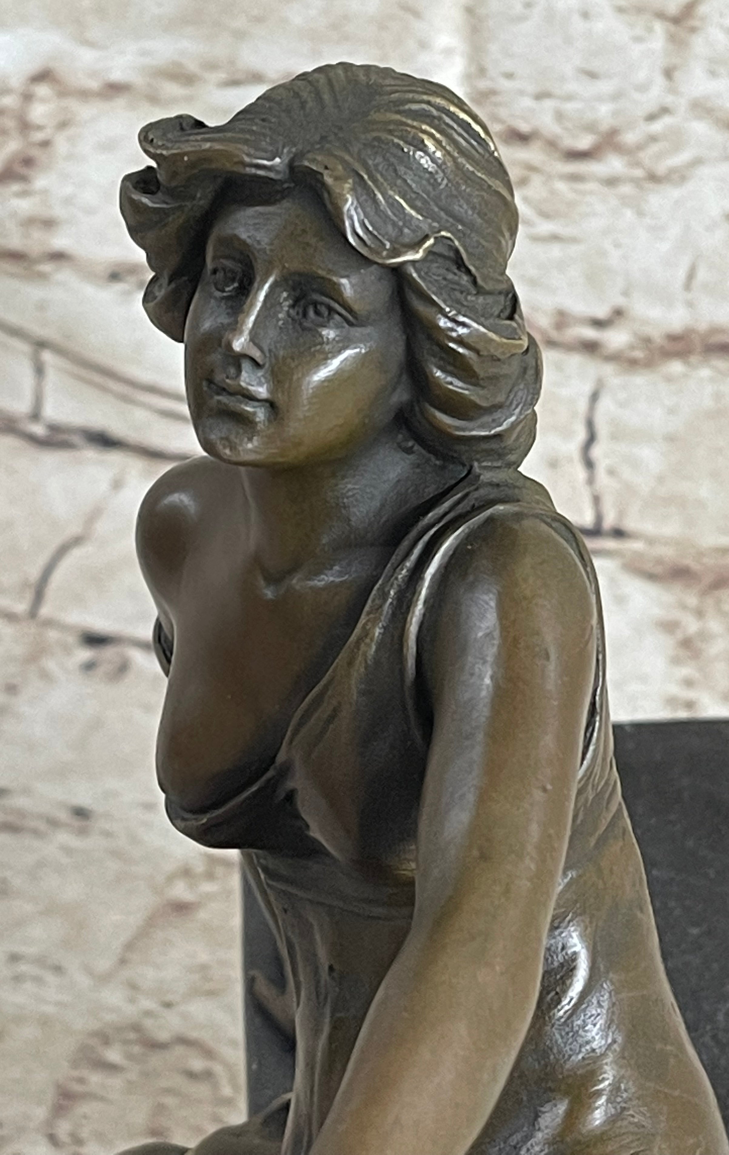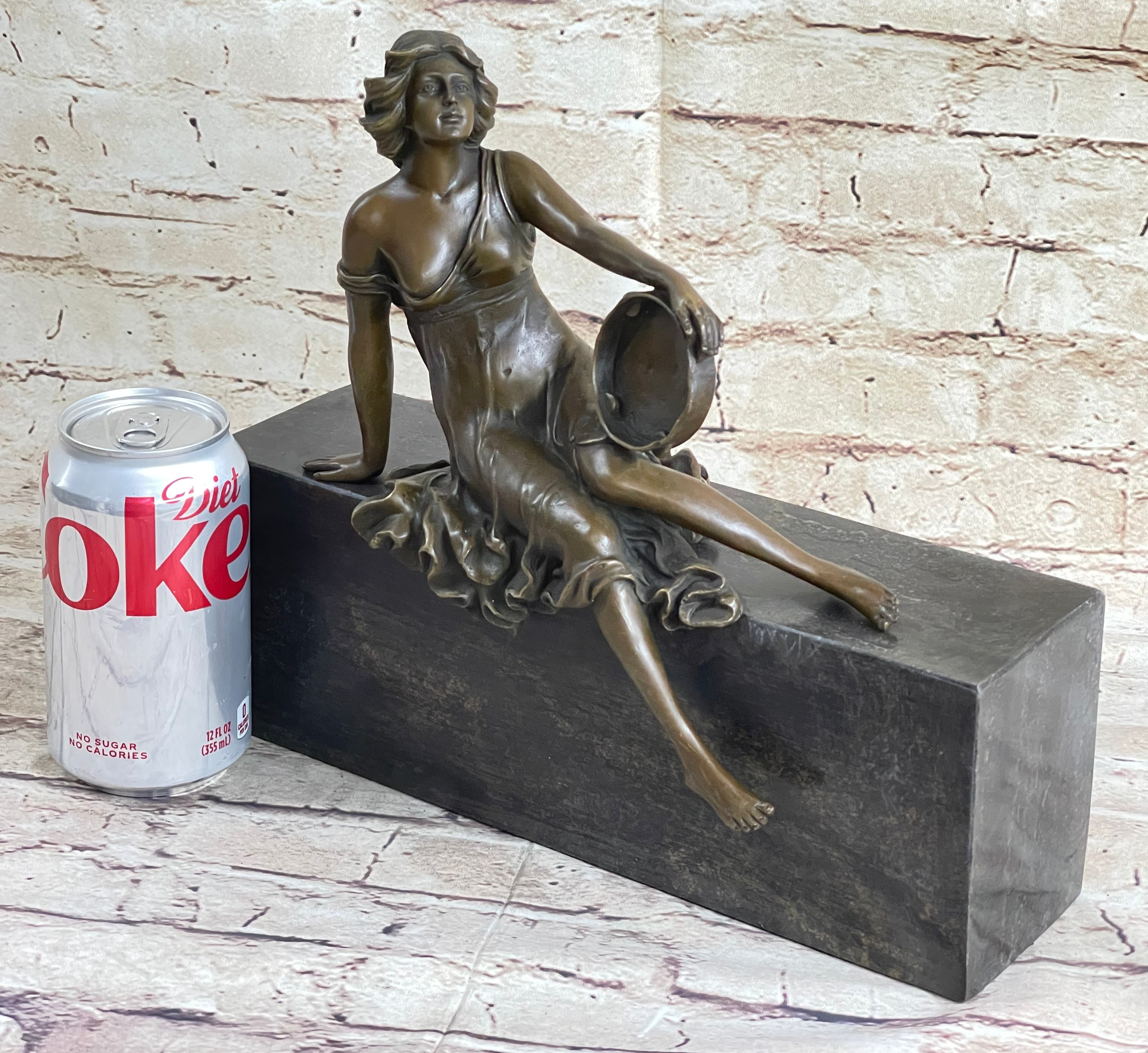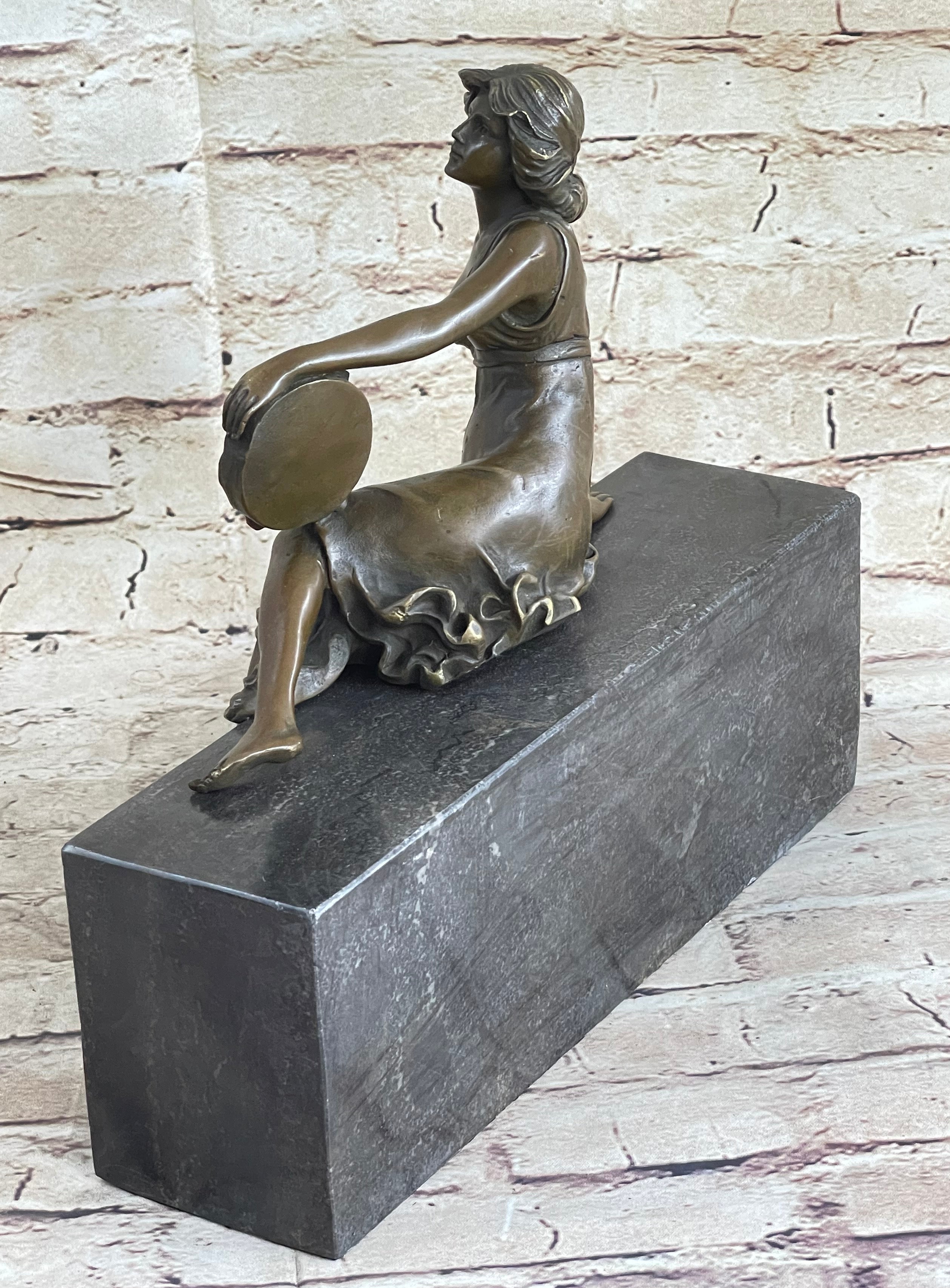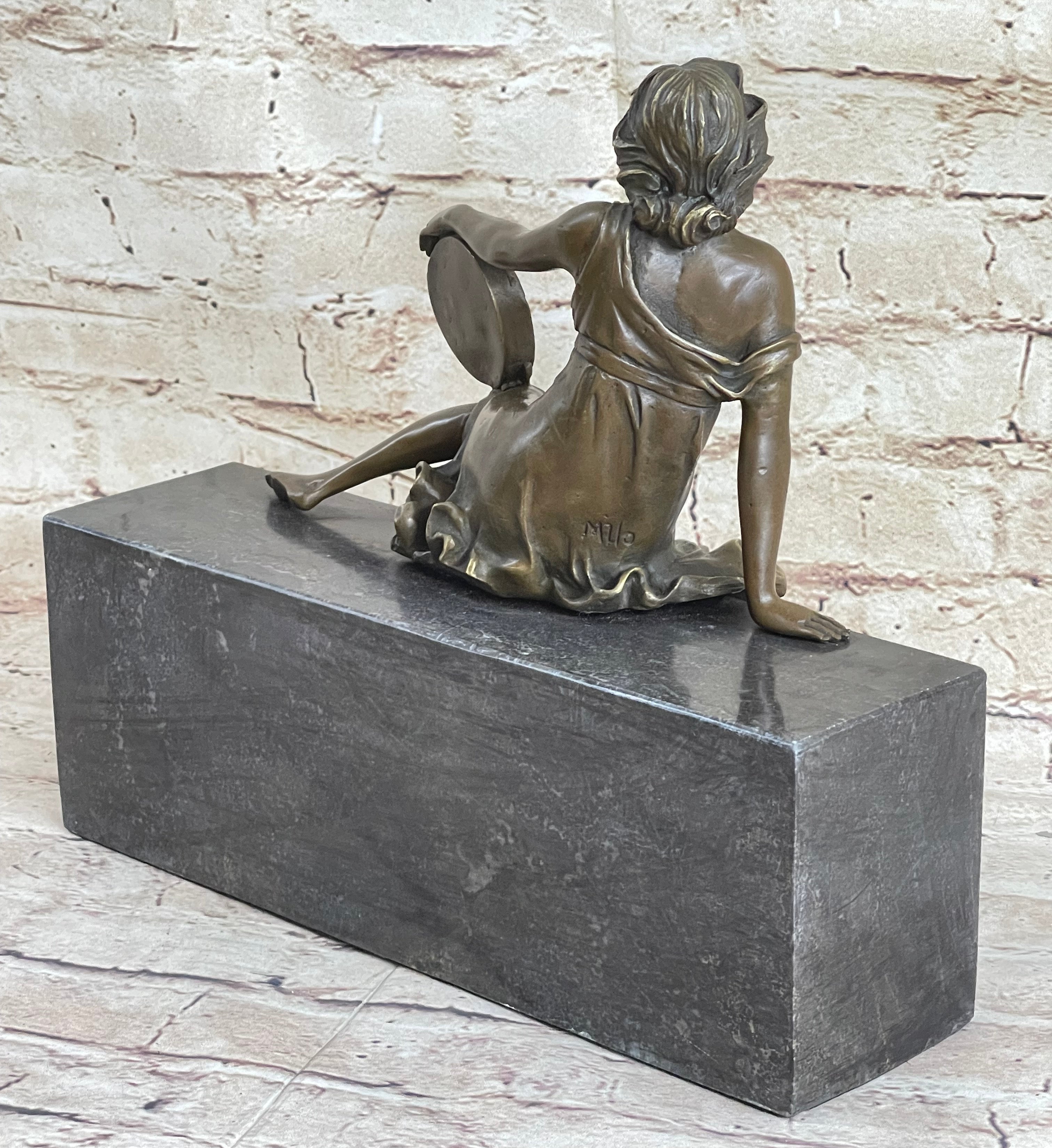 This young maiden sits perched with her tambourine, taking a break from captivating others with her beautiful music and dance. Her flowing dress slips of her shoulders revealing her breasts. This brown patina was cast using the "lost wax method." She is mounted on a black marble base with the artist signature Milo.Bronze Dimensions with Marble Base: Height 10" x Width 11"