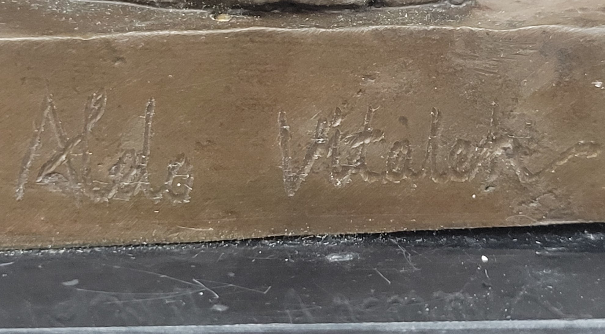 Mounted on a sleek marble base, this sculpture not only stands as a beautiful representation of a bygone era but also as a lasting tribute to the elegance and strength of women. It features the signature of the artist Aldo Vitaleh, ensuring its authenticity and adding to its value as a collectible. This piece is a perfect addition to any art collection, offering both aesthetic beauty and historical significance.Bronze Dimensions with Marble Base: Height 15.5" X Width 5"