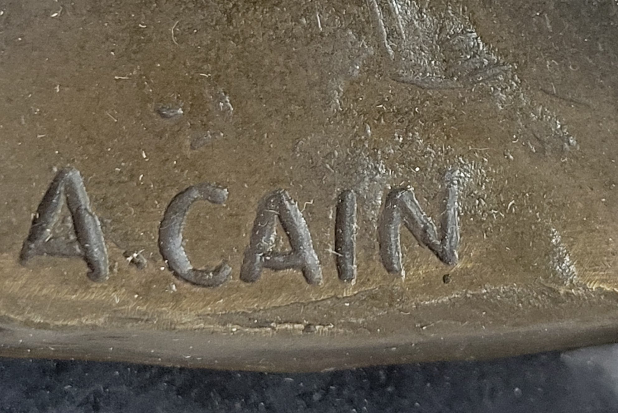 Mounted on a luxurious marble base, this masterpiece bears the signature of the esteemed artist A. Cain and is aptly titled within the bronze. It truly embodies the beauty and skill of its creator.