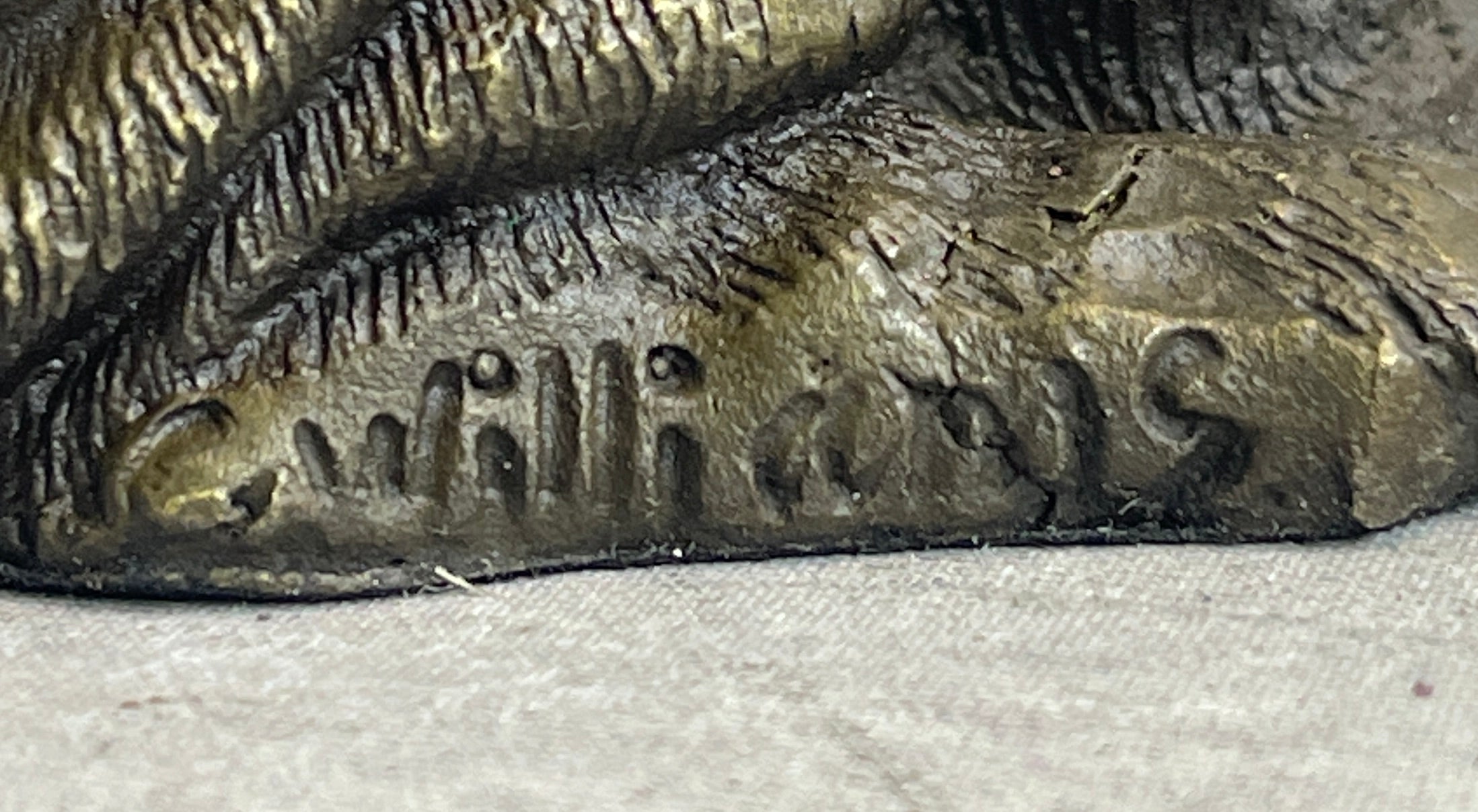 With its striking presence and expert craftsmanship, this Shar-Pei dog bronze statue is the perfect decoration for dog-themed spaces or as an accent piece in your home. The rich bronze tones and intricate details of the sculpture create a sense of warmth and authenticity, making it a conversation starter and a cherished item for dog enthusiasts. Add a touch of artistry and devotion to your living space with this remarkable bronze dog sculpture, signed by the talented artist Williams.Bronze Dimensions :Height 4" X Width 3"