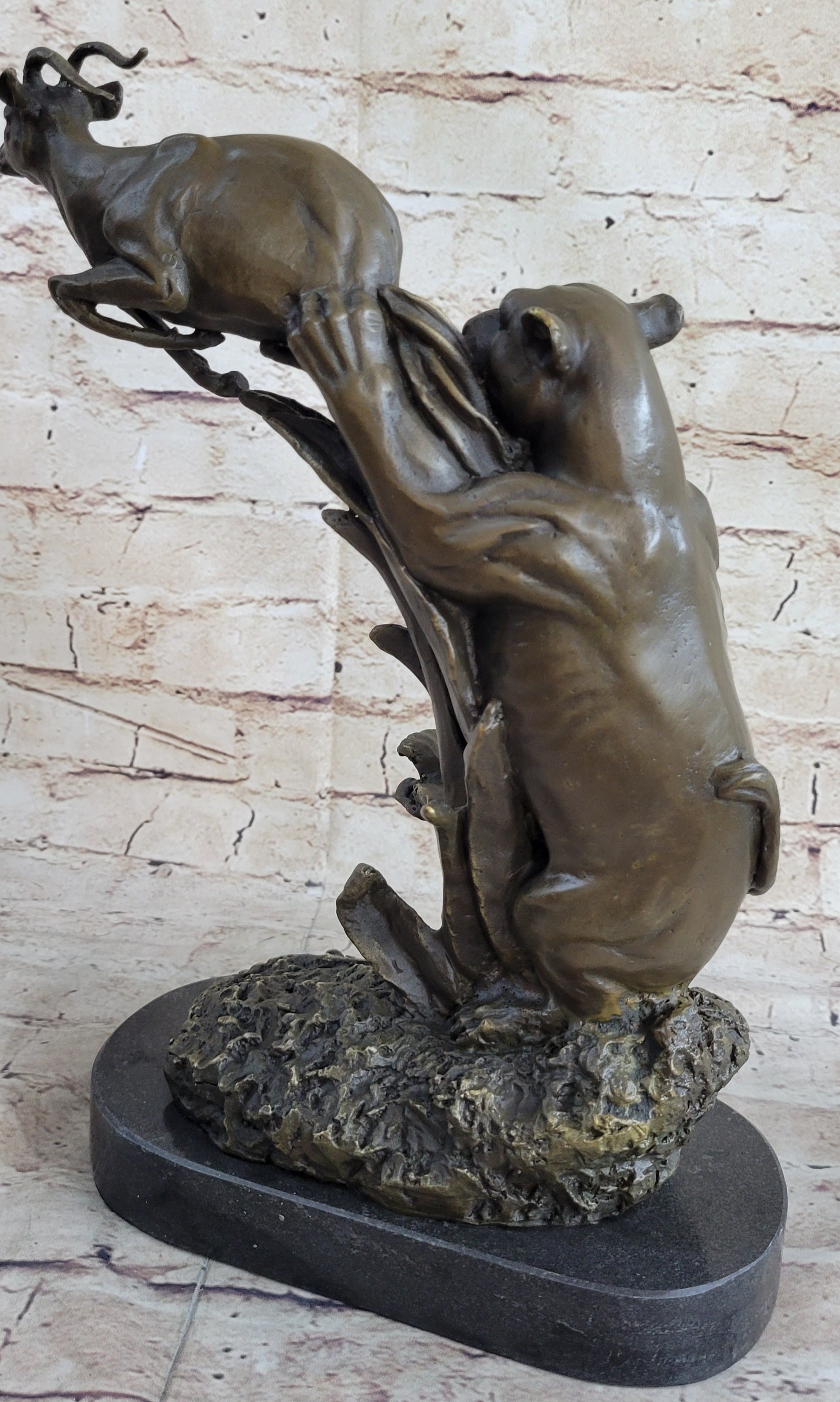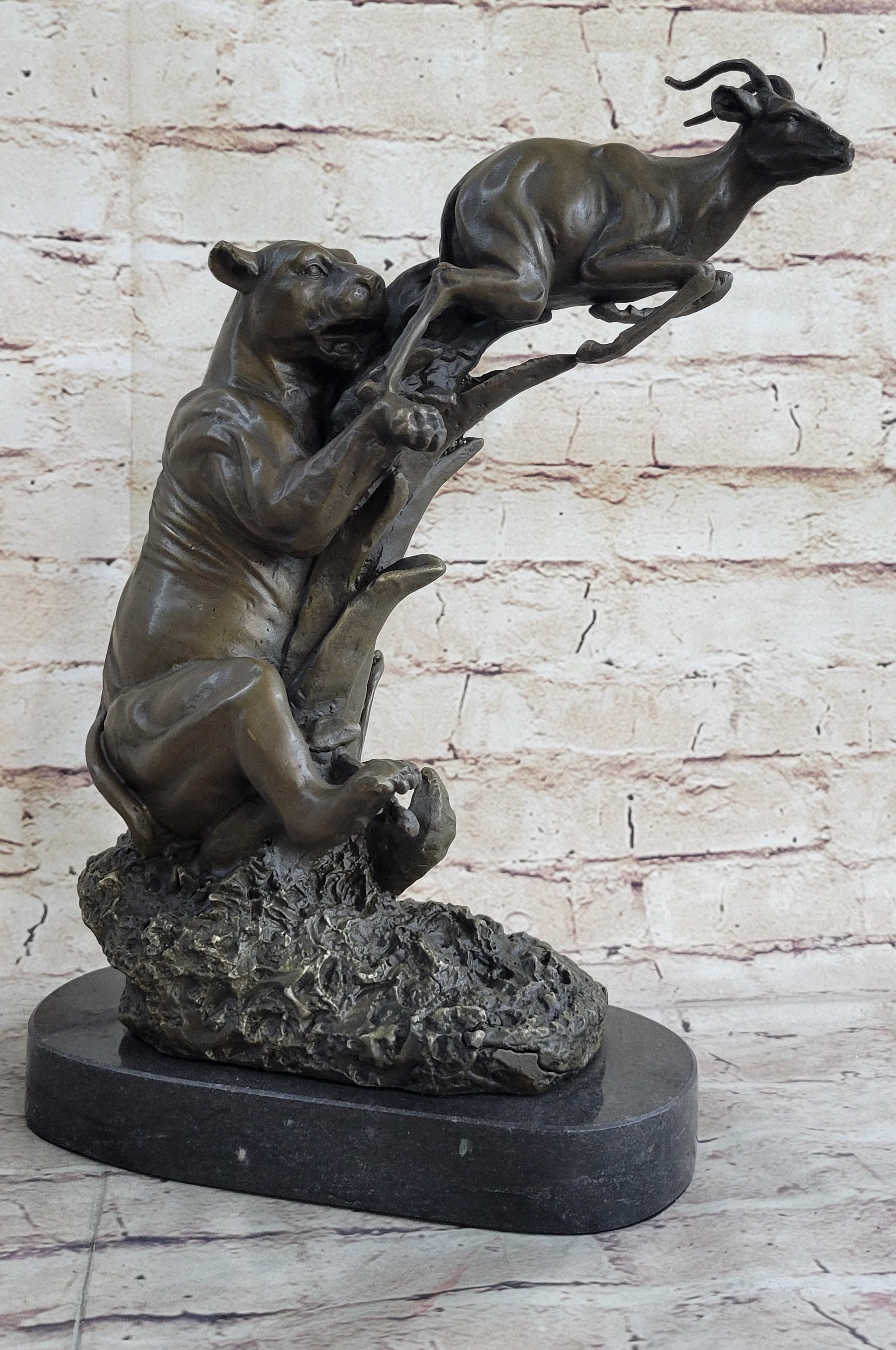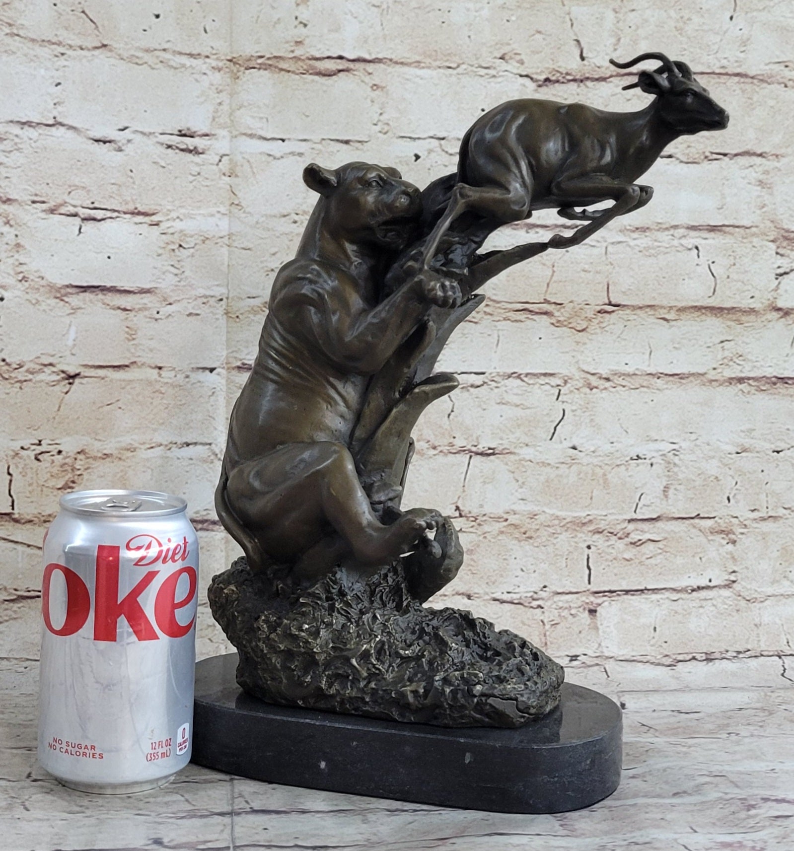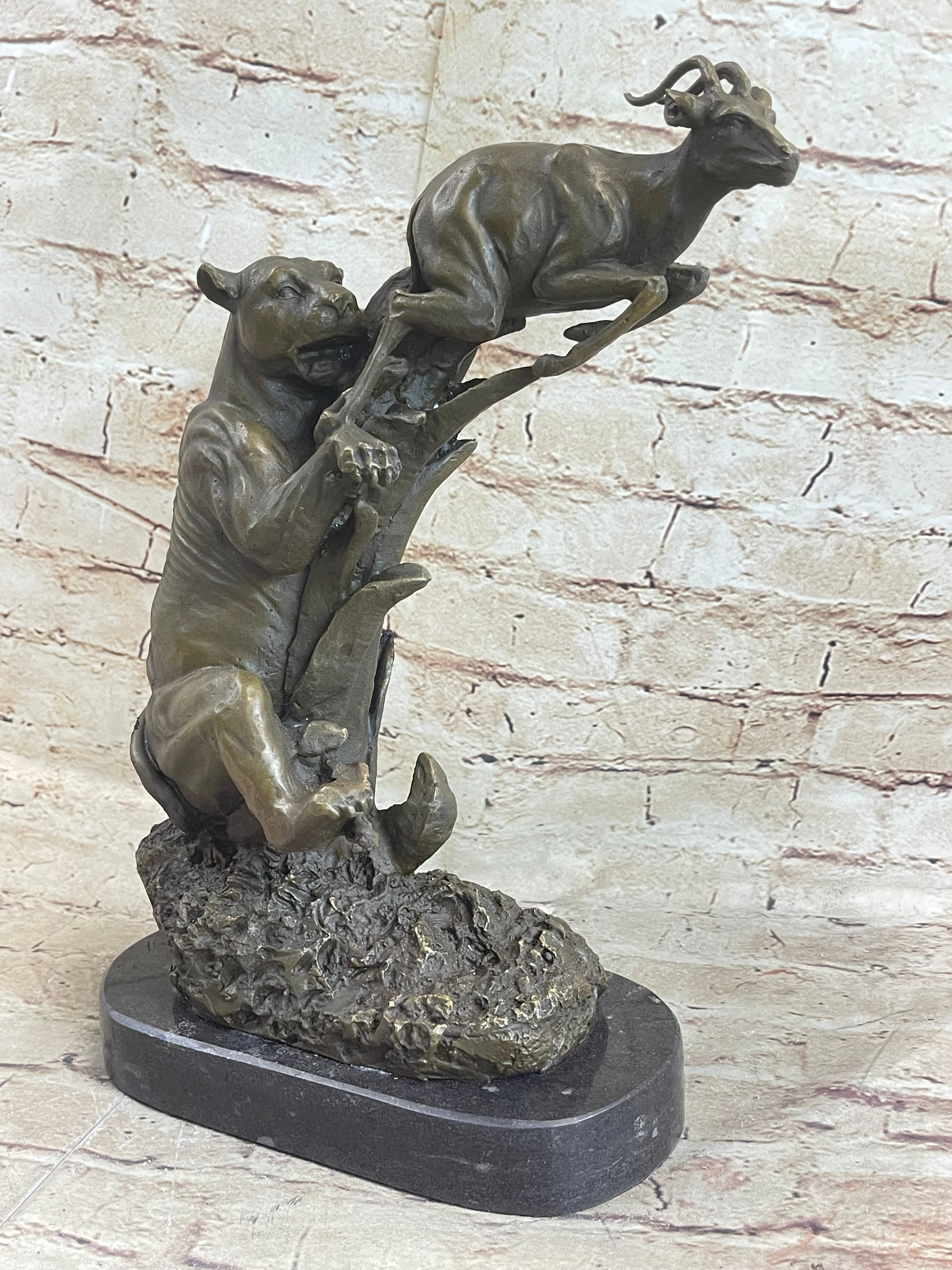 Sign Hot Cast Barye Jaguar attacking Baby Gazelle Bronze Marble Sculpture Figure