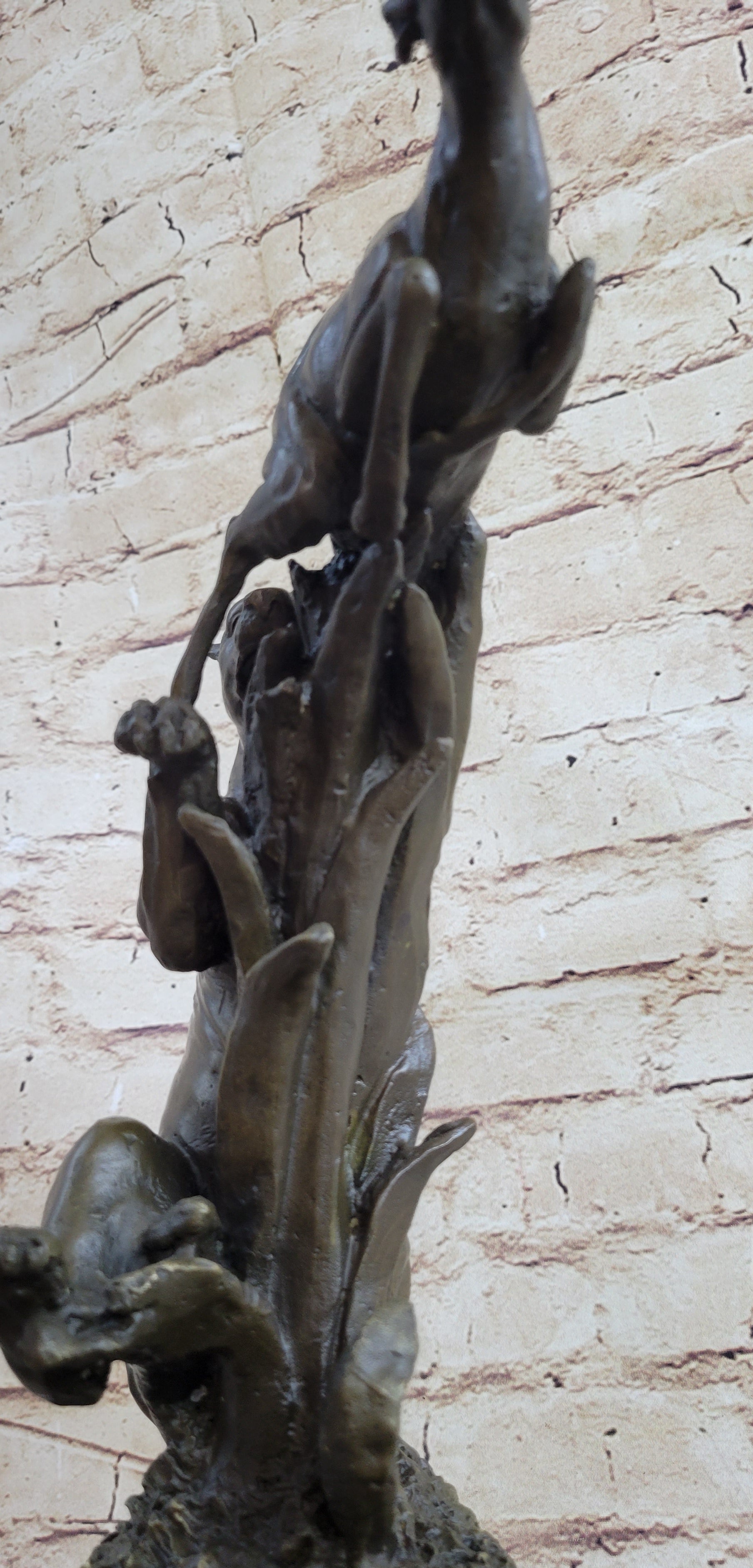 100% handmade and cast from pure bronze, this sculpture is mounted atop a sleek black marble base, adding an element of elegance to the raw natural scene it depicts. Signed by the artist Milo, this artwork is a testament to his mastery in capturing the dramatic moments of wildlife. It is a striking addition to any art collection, sure to provoke thought and admiration for the harsh realities of the natural world.Bronze Dimensions with Marble Base: Height 13" X Width 12"