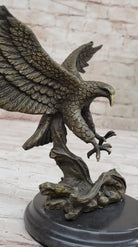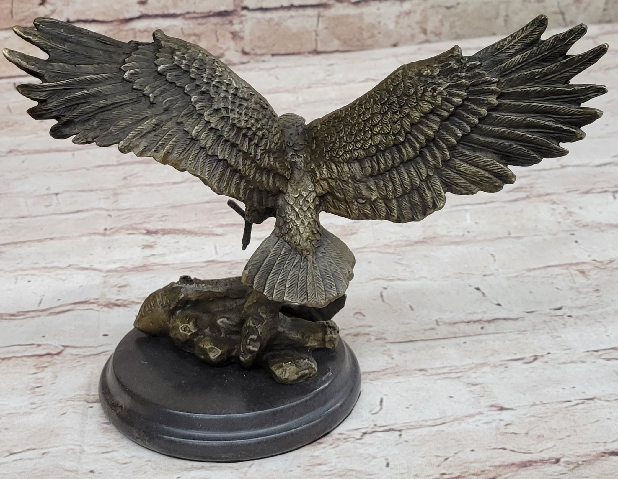 This bronze eagle sculpture serves as a captivating testament to the beauty and symbolism of this majestic bird. As a symbol of freedom and strength, the eagle's presence brings a sense of inspiration and admiration to any space. Whether showcased in a personal collection or gracing the decor of an office, this sculpture reminds us of the values and ideals that the eagle represents. Its exquisite craftsmanship, rendered through the lost wax method, ensures that this piece stands as an enduring and cherished symbol of freedom and power.Bronze Dimensions with Marble Base: Height 8" X Width 9"
