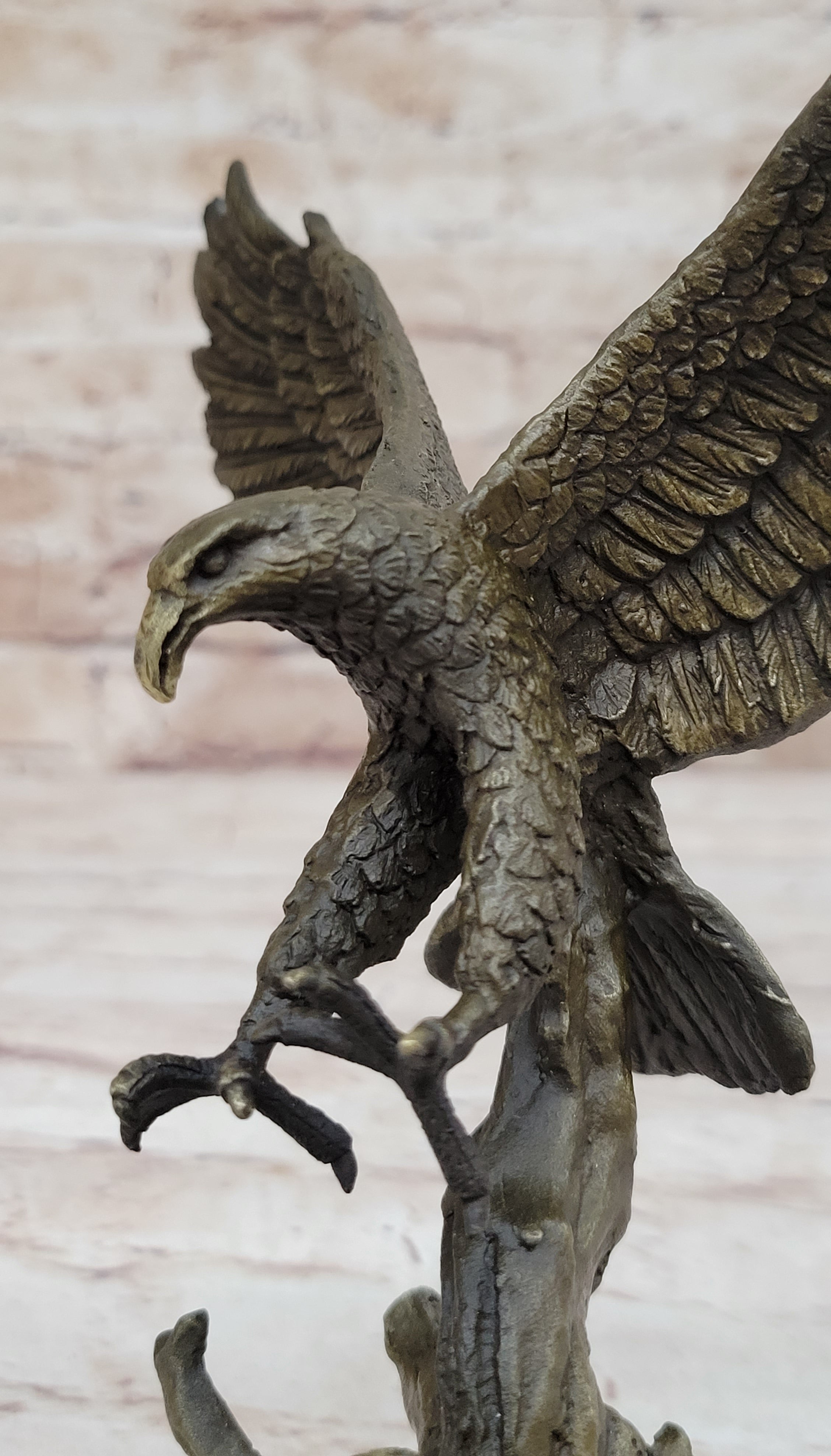 In this captivating bronze sculpture, a small eagle takes center stage as it descends with grace and power, preparing for a majestic landing. The sculpture beautifully captures the moment of anticipation as the eagle's clawed feet extend, poised to secure a firm grip upon landing. Every intricate detail of this magnificent bird has been meticulously crafted, from the expansive wings that flap high in the sky to the eagle's keen gaze focused intently on its target. As a symbol of freedom, the eagle embodies values cherished by many, making it a compelling addition to any home or office.
