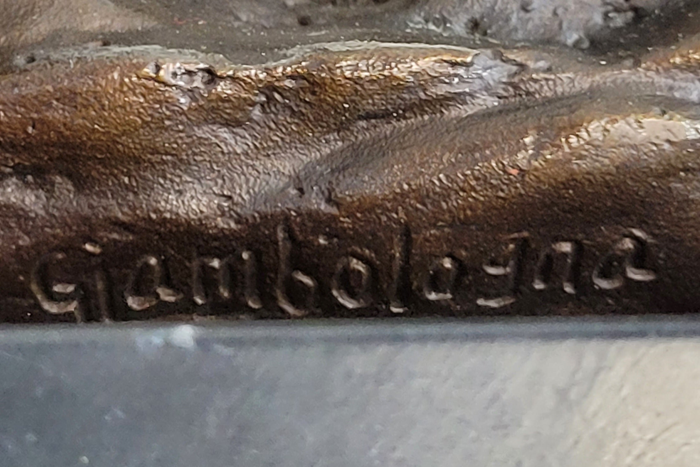Crafted with meticulous attention to detail, this sculpture was cast using the age-old method of lost wax casting, ensuring the preservation of every intricate feature and expression. The brown patina finish adds depth and character to the piece, bringing the sculpted elephants to life with a sense of realism and warmth. Mounted on a black marble base, the artwork is not only a visual delight but also a testament to the skill and artistry of the renowned artist, G. Bologna.