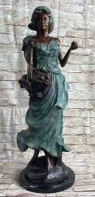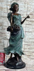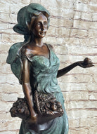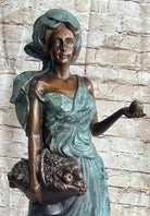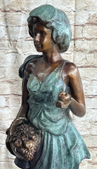 Signed Bronze Sculpture Statue of a Young Woman Holding Basket of Fruits