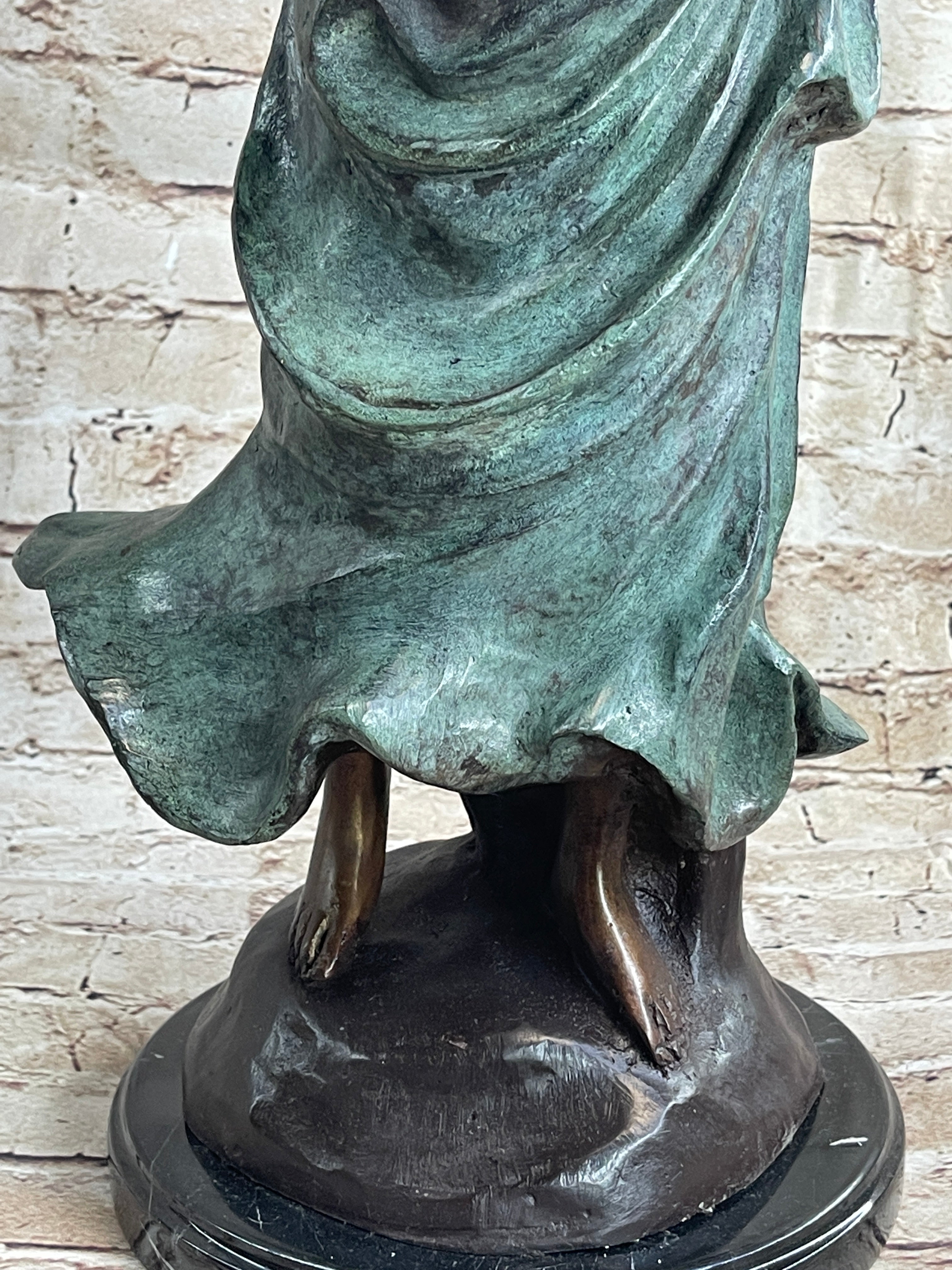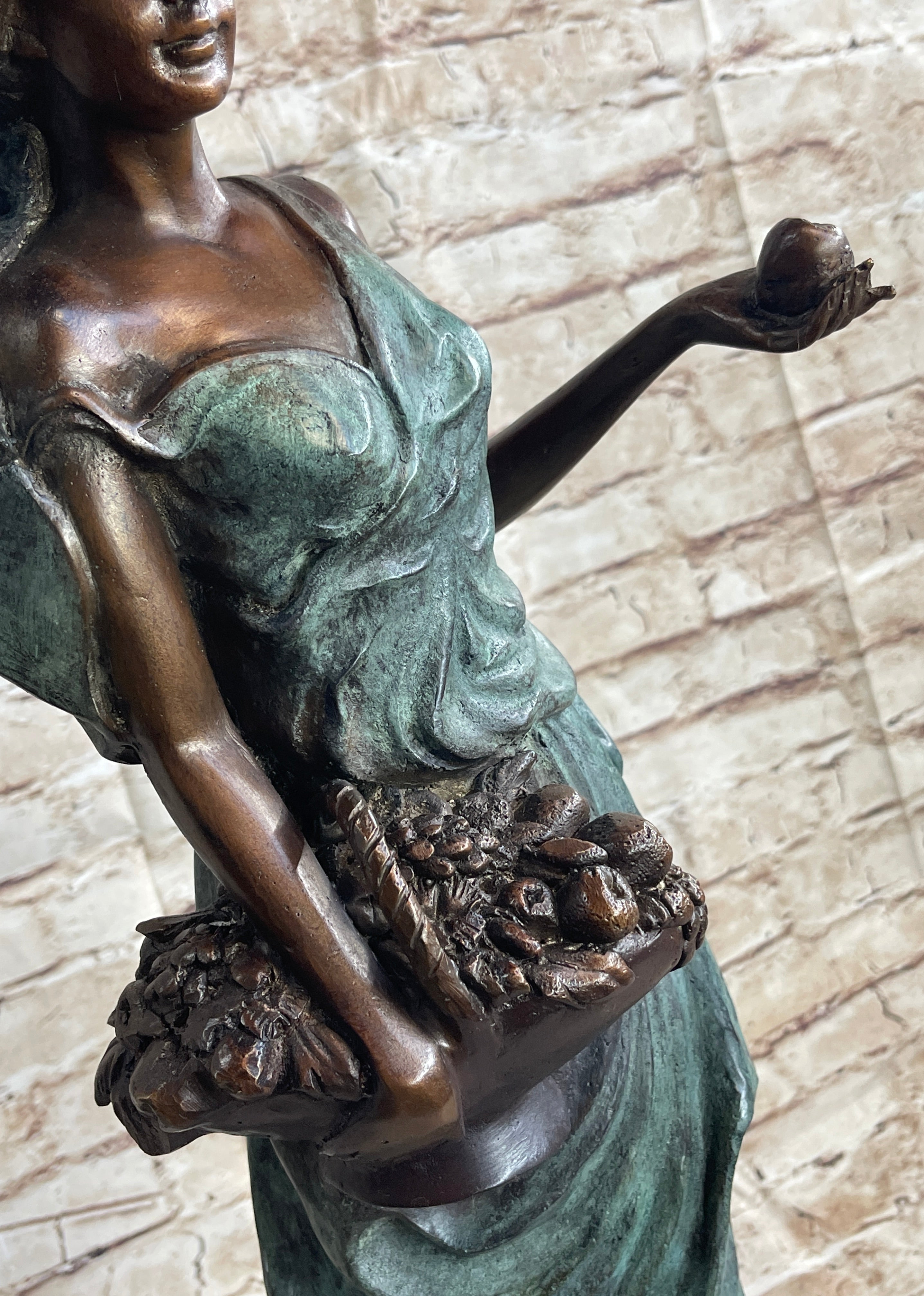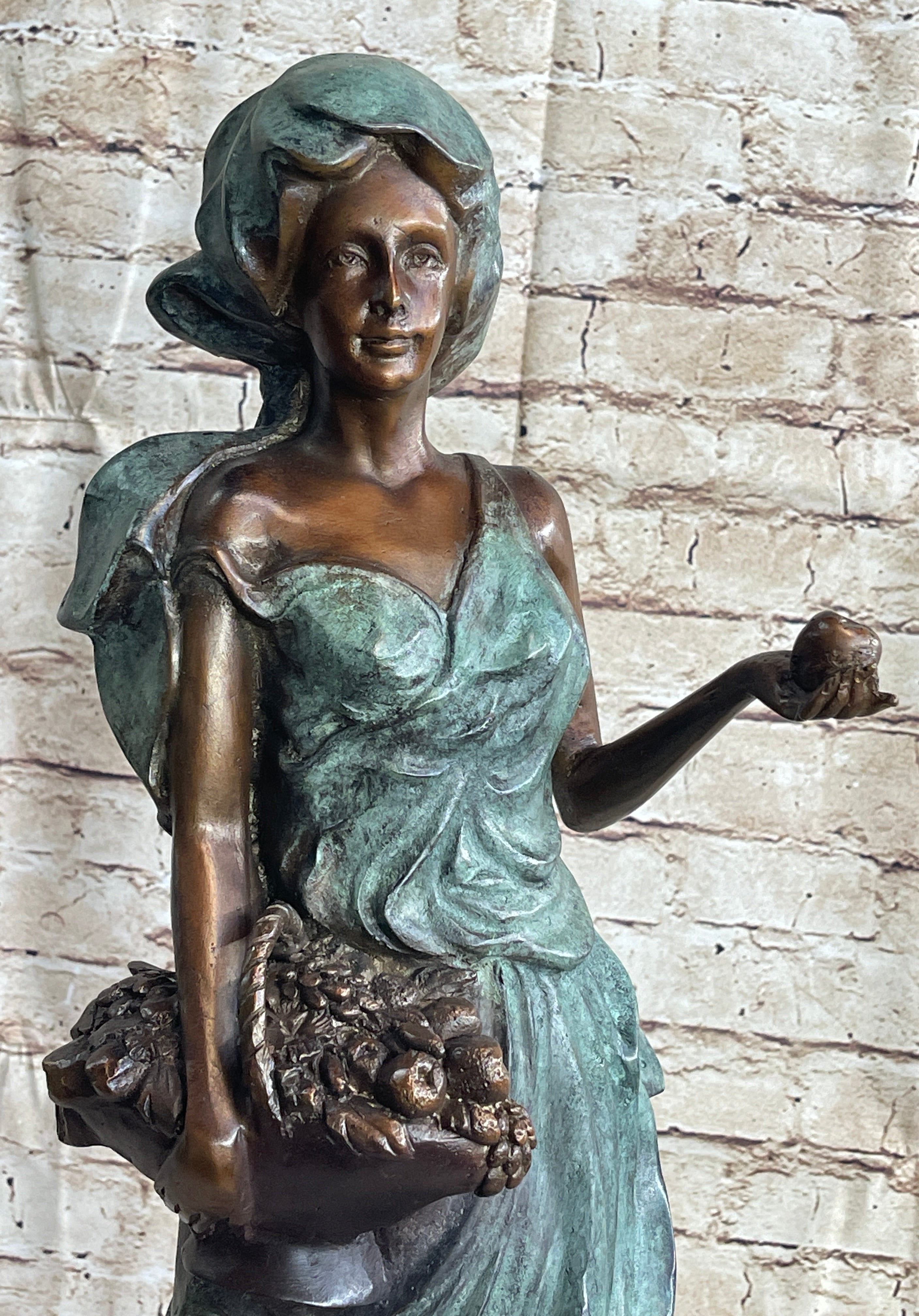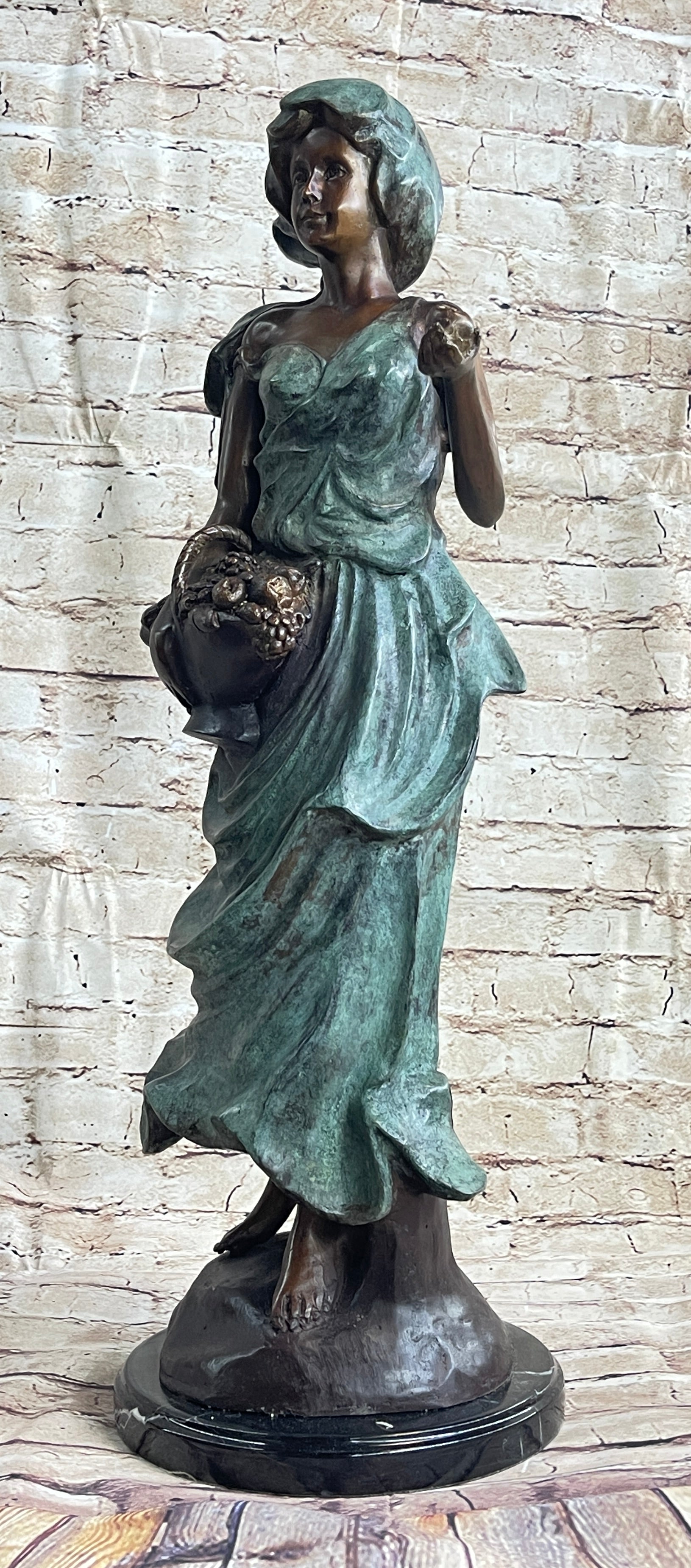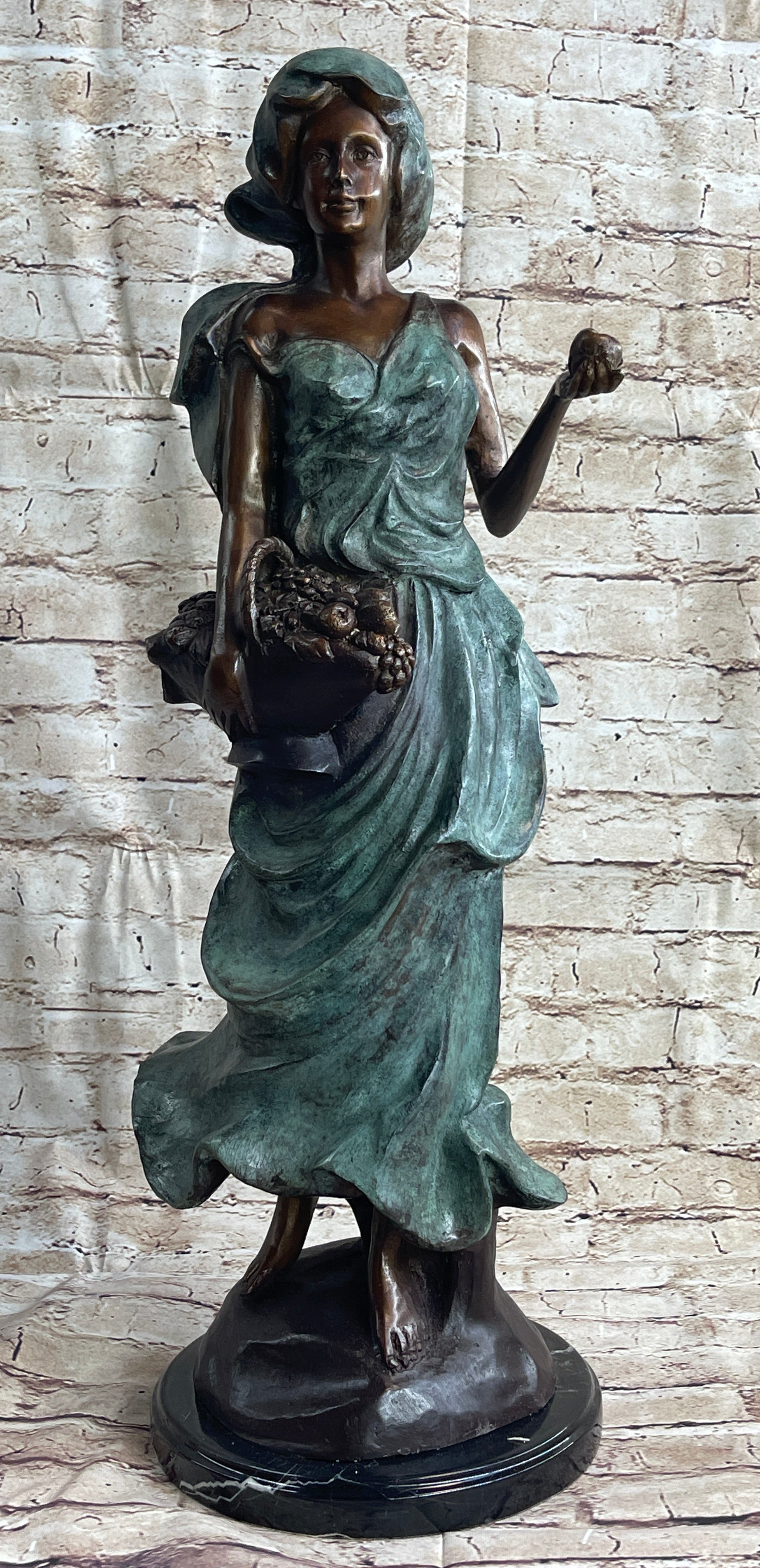 On a warm spring day, she strolls through the garden, picking freshly bloomed flowers and fruit. Her bare feet sinks into the soft dirt and she feels the breeze graze her bare shoulders. Her long goddess dress flows and dusts at the ground. She cradles a basket, which is filled with the life she has collected. She is a two-toned patina, her skin brown and the dress grey. This 100% bronze and handmade sculpture was cast using the "Lost Wax Method" and mounted on a marble base and is signed A. Moreau.Bronze Dimensions with Marble Base:Height 24" x Width 10"