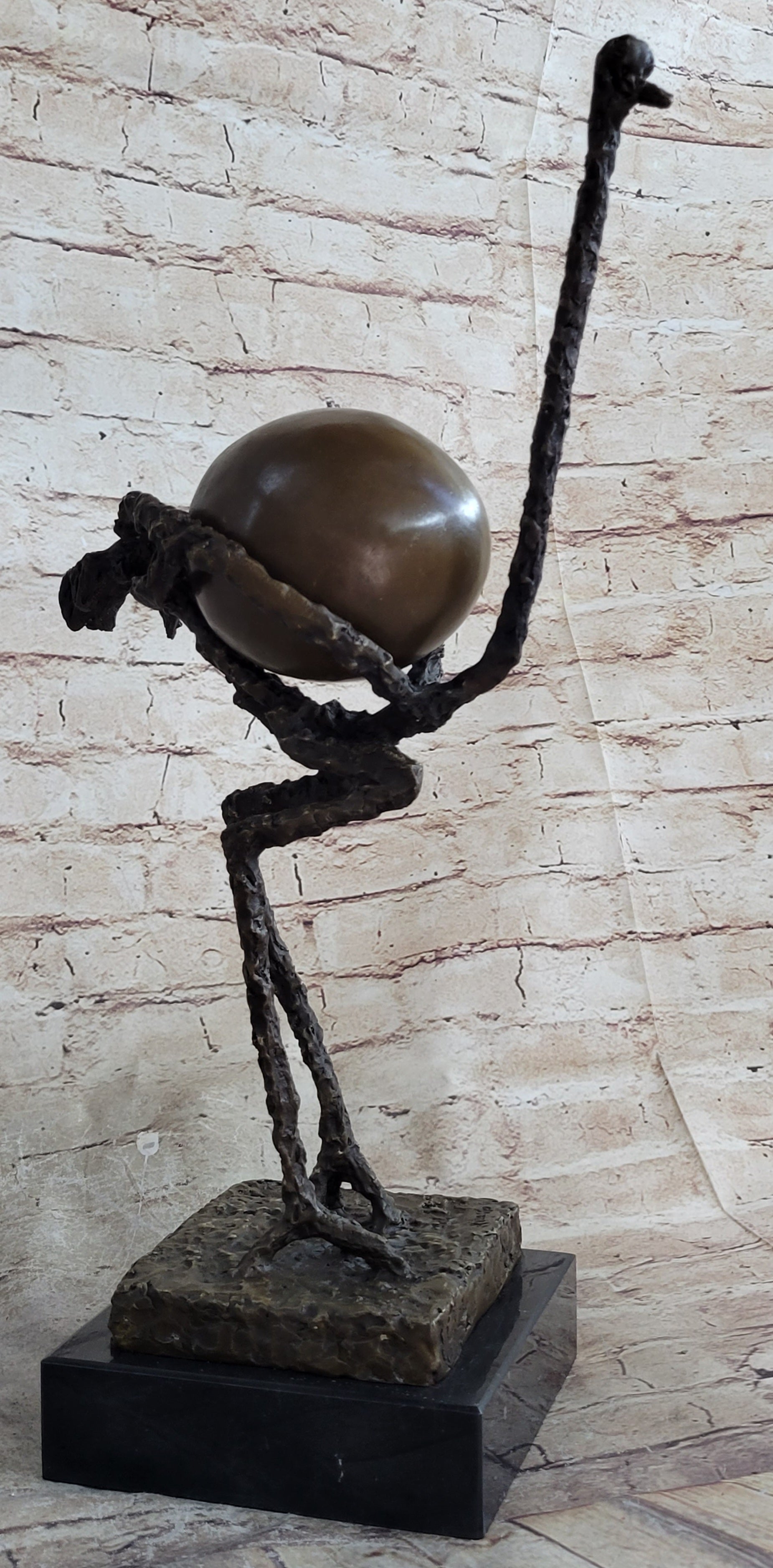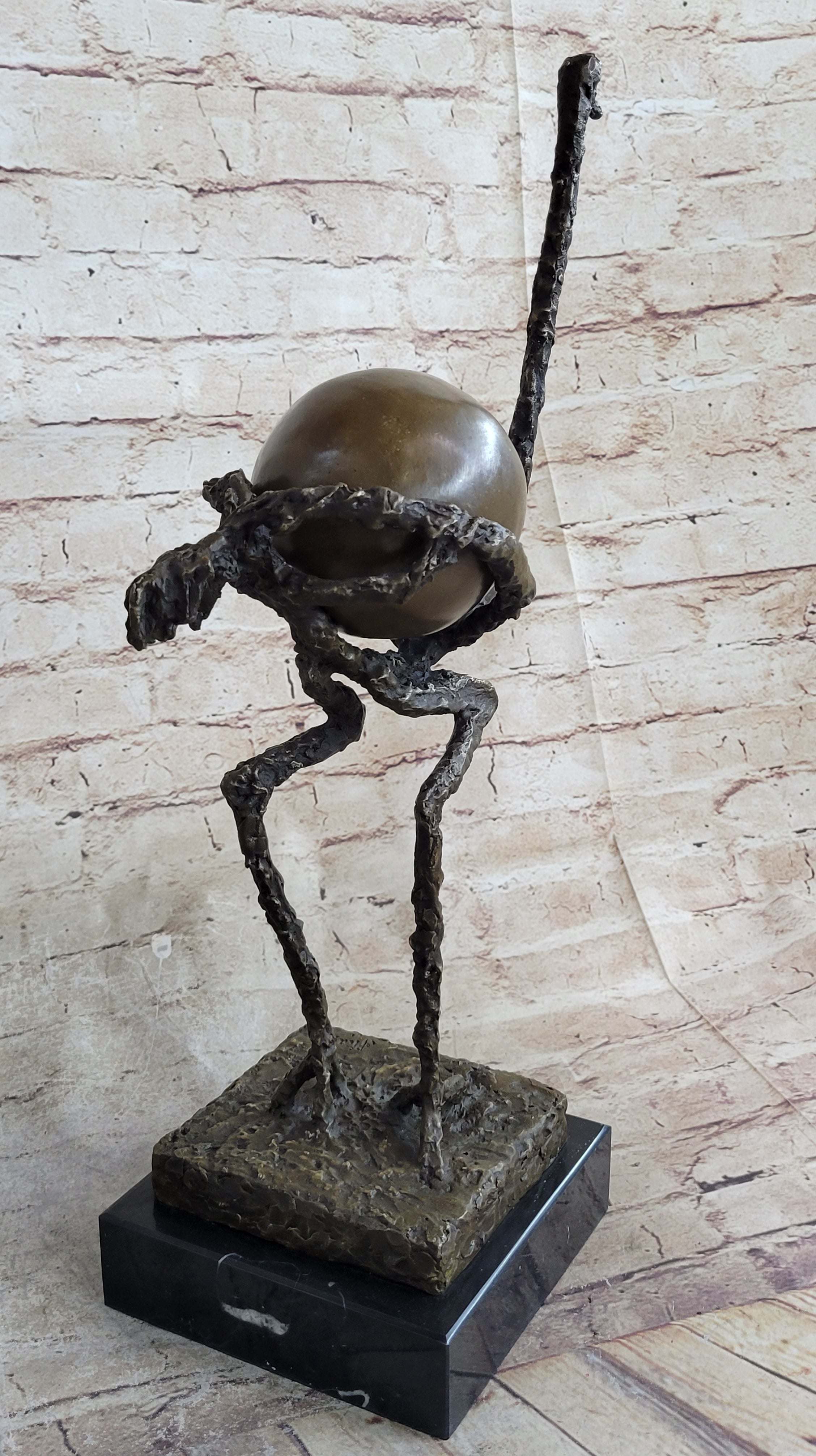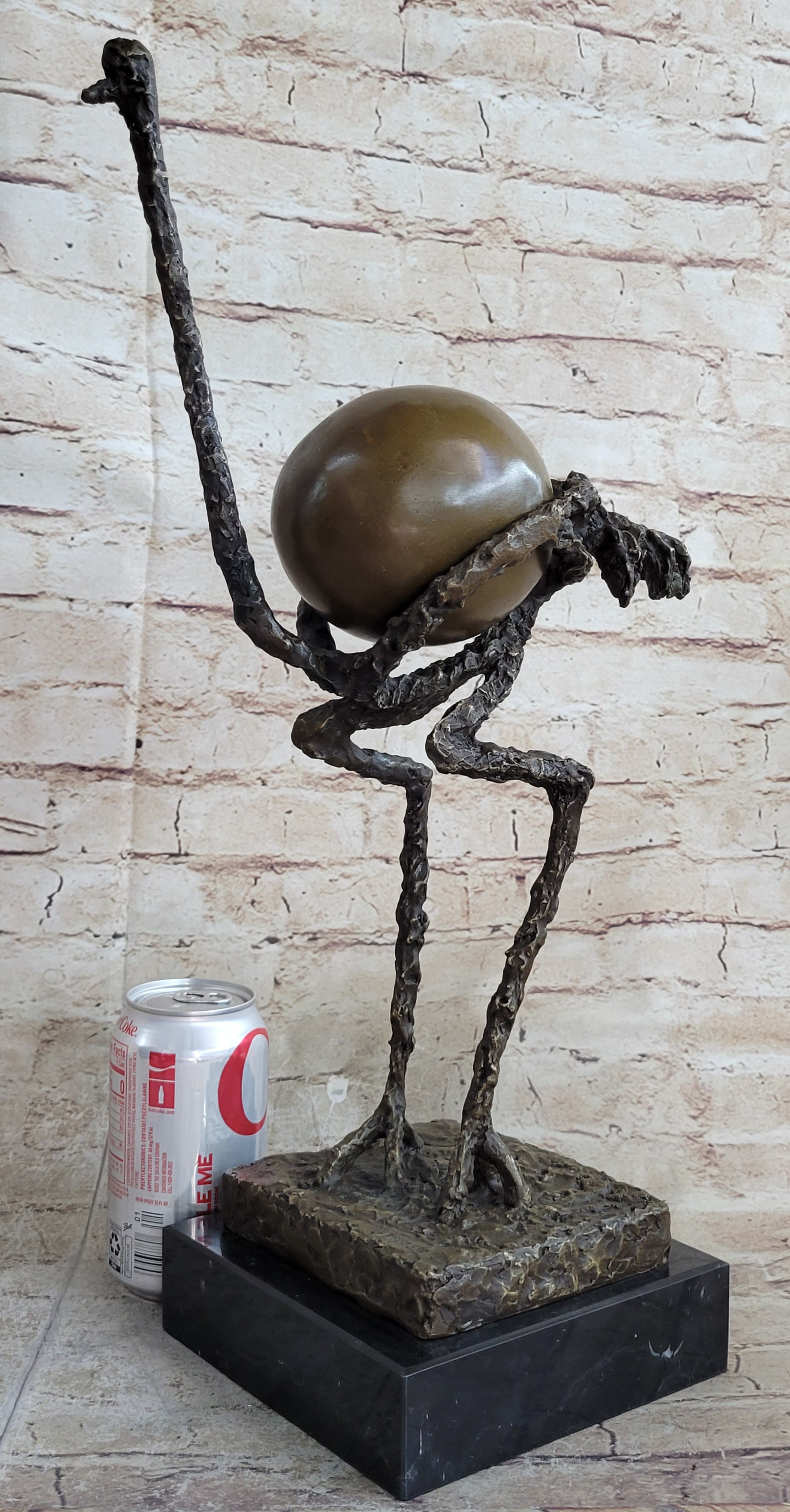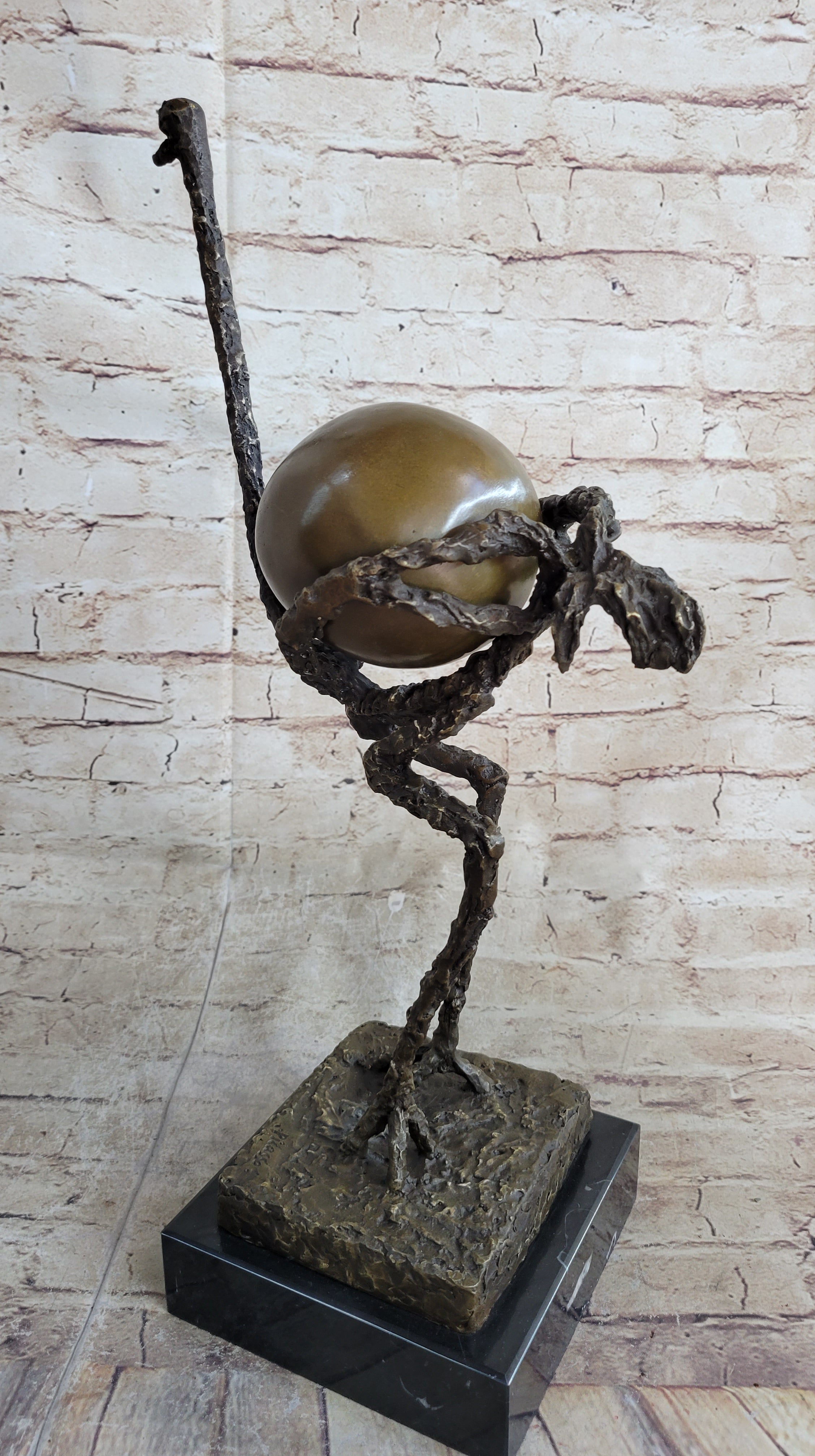 Introducing the "Figurative Abstract Ostrich," a captivating bronze sculpture that embodies the artist's imaginative vision of an ostrich deteriorated by the passage of time, gradually reduced to its skeletal frame. The sculpture showcases a fascinating interplay of textures, with a distinctive appearance resembling wet concrete, contrasting against the smooth, rounded ostrich egg serving as its body.