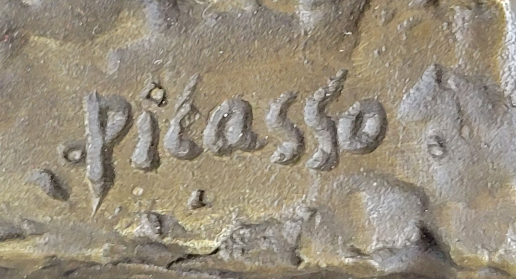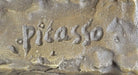 The "Figurative Abstract Ostrich" is elegantly mounted upon a sleek black marble base, enhancing its visual impact and providing a stable foundation. As a testament to its authenticity and artistic value, the sculpture proudly bears the signature of the renowned artist, Picasso.