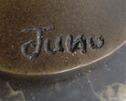 An abstract beauty poses for a portrait. She stretches her long round body. She kneels and curls an arm upward. Like a classic pin-up, she pushes her chest out, tilts her head up and is ready for her close up. 100% bronze and handmade, this brown patina sculpture was cast using the "Lost Wax Method" and mounted on a marble base and is signed by artist Juno.Bronze Dimensions with Marble Base: Height 17" x Width 7"