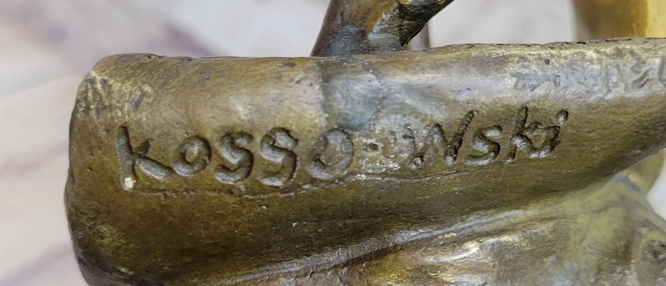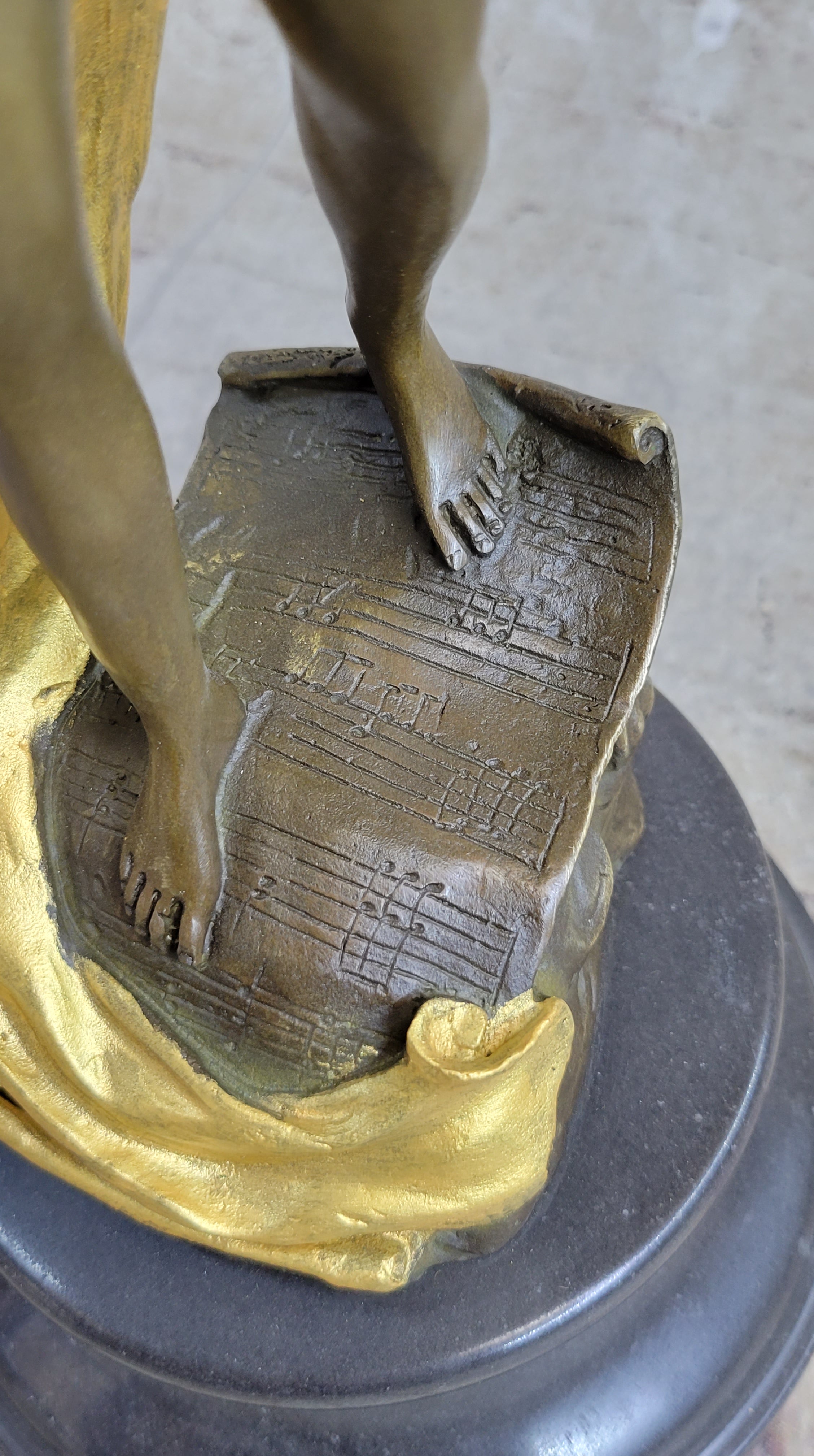 Introducing an enchanting bronze statue that captures the essence of a young woman's musical prowess. As she concludes a powerful ballad on her violin, her music notes come alive, swirling through the air that surrounds her, gently lifting her hair off her face. With her goddess-like dress cascading over her nude curves, her slim frame is elegantly revealed. She mesmerizes all who steal a moment to listen, as her hypnotic notes resonate with beauty and emotion. With fervor, she drags her bow across the strings, infusing her performance with passion. And for the final note, she boldly rips the bow off the strings, triumphantly holding it high in the air. This exceptional sculpture is meticulously handmade with 100% bronze, showcasing the artist's dedication to craftsmanship. The two-tone patina finish adds depth and dimension to the piece, highlighting its intricate details. Created using the revered "Lost Wax Method," the sculpture captures every nuance and expression, preserving the artist's vision with utmost precision. The statue is elegantly mounted on a round marble base, providing a stable foundation and complementing its artistic presentation. It proudly bears the signature of the talented artist Kossowski, adding to its authenticity and value. Embrace the allure and captivating beauty of this bronze sculpture, allowing its harmonious blend of music and art to resonate within your space. A remarkable addition to any collection or decor, this piece is sure to captivate the hearts and imaginations of art enthusiasts and music lovers alike.