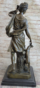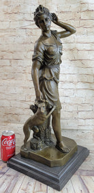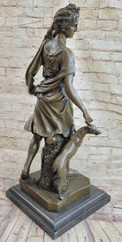 This stunning bronze sculpture captures the grace and strength of Artemis, the revered Hellenic goddess of the hunt, wild animals, and the wilderness. As a protector of young girls and a symbol of virginity and childbirth, Artemis was deeply respected in Greek mythology. Traditionally depicted with a bow and arrows, she embodied the spirit of the untamed forest. In this exquisite representation, Artemis is portrayed valiantly walking through a dense woodland, gently tucking a loose strand of hair back into place while a loyal hunting dog eagerly follows at her feet.