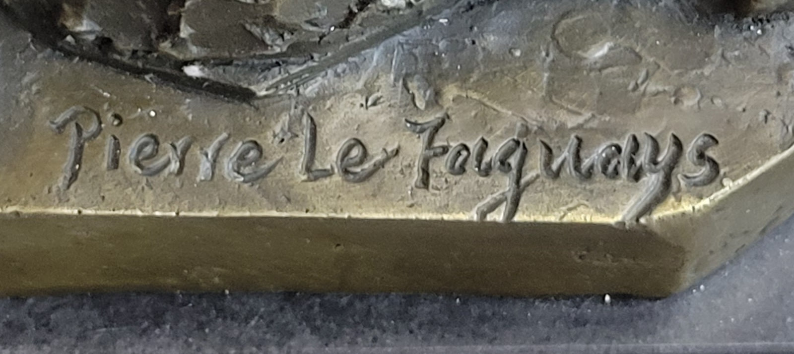 Created using the ancient lost-wax casting method, this handmade bronze sculpture boasts a rich brown patina finish, ensuring its timeless beauty and durability. It is mounted on a polished black marble base and bears the signature of artist Pierre Le Faguays, adding to its authenticity and collectible value. This captivating piece is an essential addition for lovers of Greek mythology, fine art, and classical sculpture, making it a perfect statement piece for any space.Bronze Dimensions with Marble Base: Height 26" x Width 10"