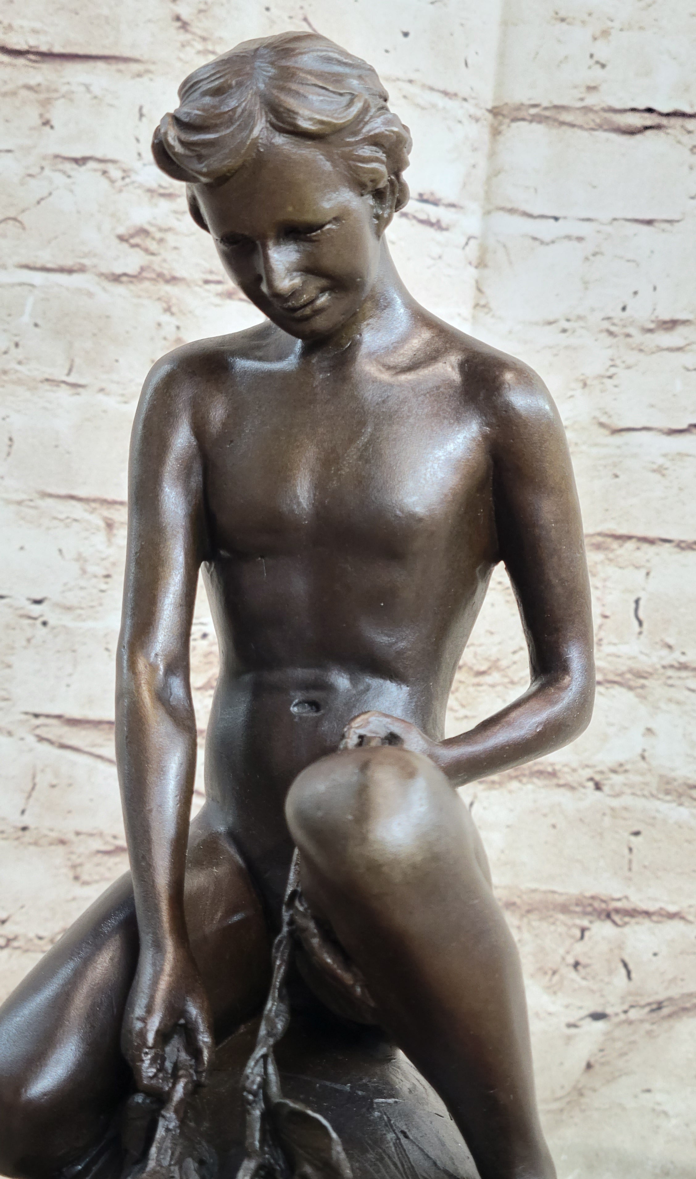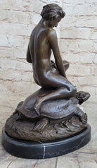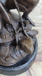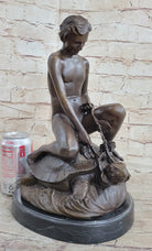 Signed Mercie Nude Boy Riding Turtle Bronze Sculpture Marble Base Figurine Decor