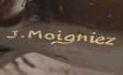 Crafted using the esteemed "Lost Wax Method," the bronze sculpture stands as a testament to the artist's meticulous attention to detail and commitment to capturing the lion's form and spirit with exceptional precision. Mounted gracefully on a sleek black marble base, the sculpture emanates a sense of sophistication and stability, providing a solid foundation for the artwork's powerful presence. The two-tone brown patina finish enriches the sculpture's texture and depth, emphasizing the lion's formidable features and enhancing the overall composition with an air of timeless elegance. The sculpture proudly bears the signature of J. Moigniez, underscoring its quality and artistic value.