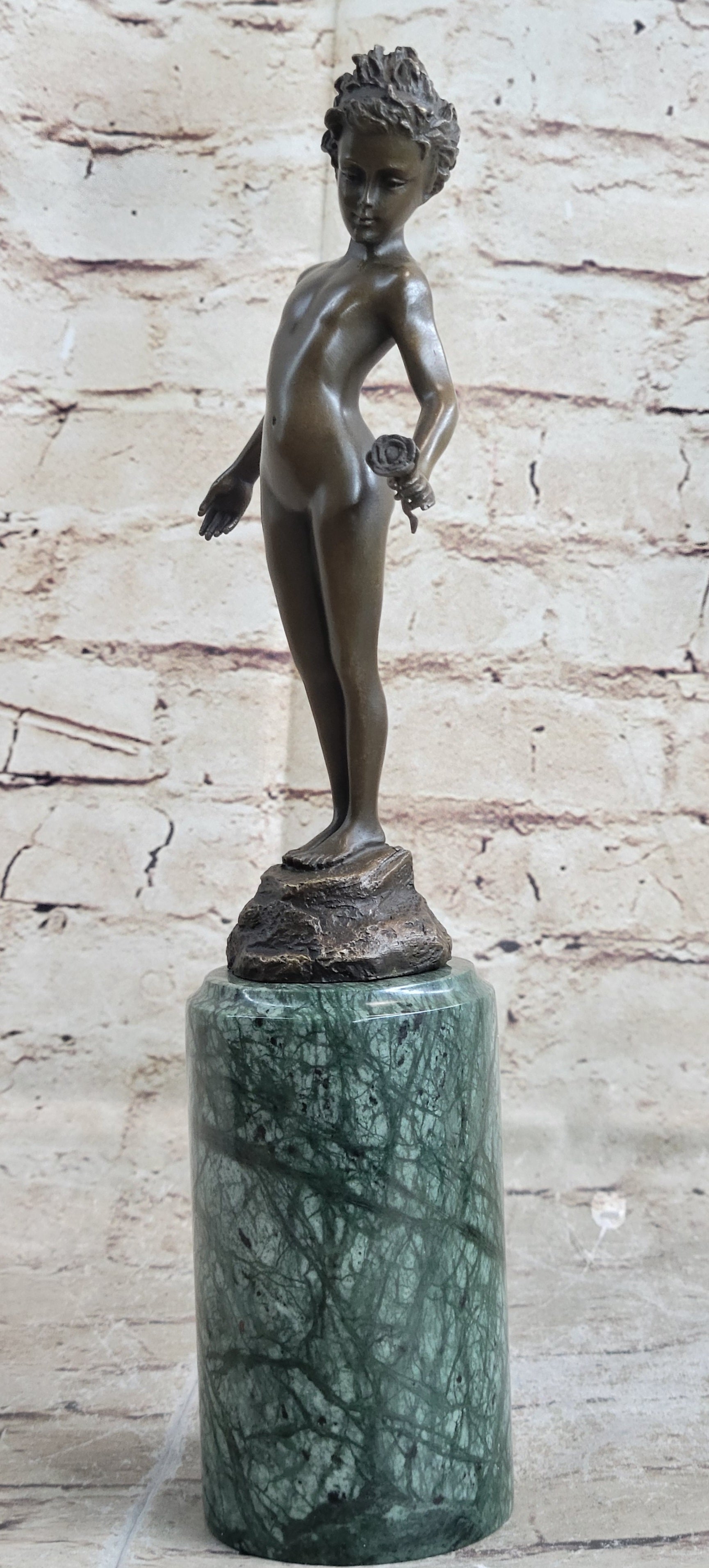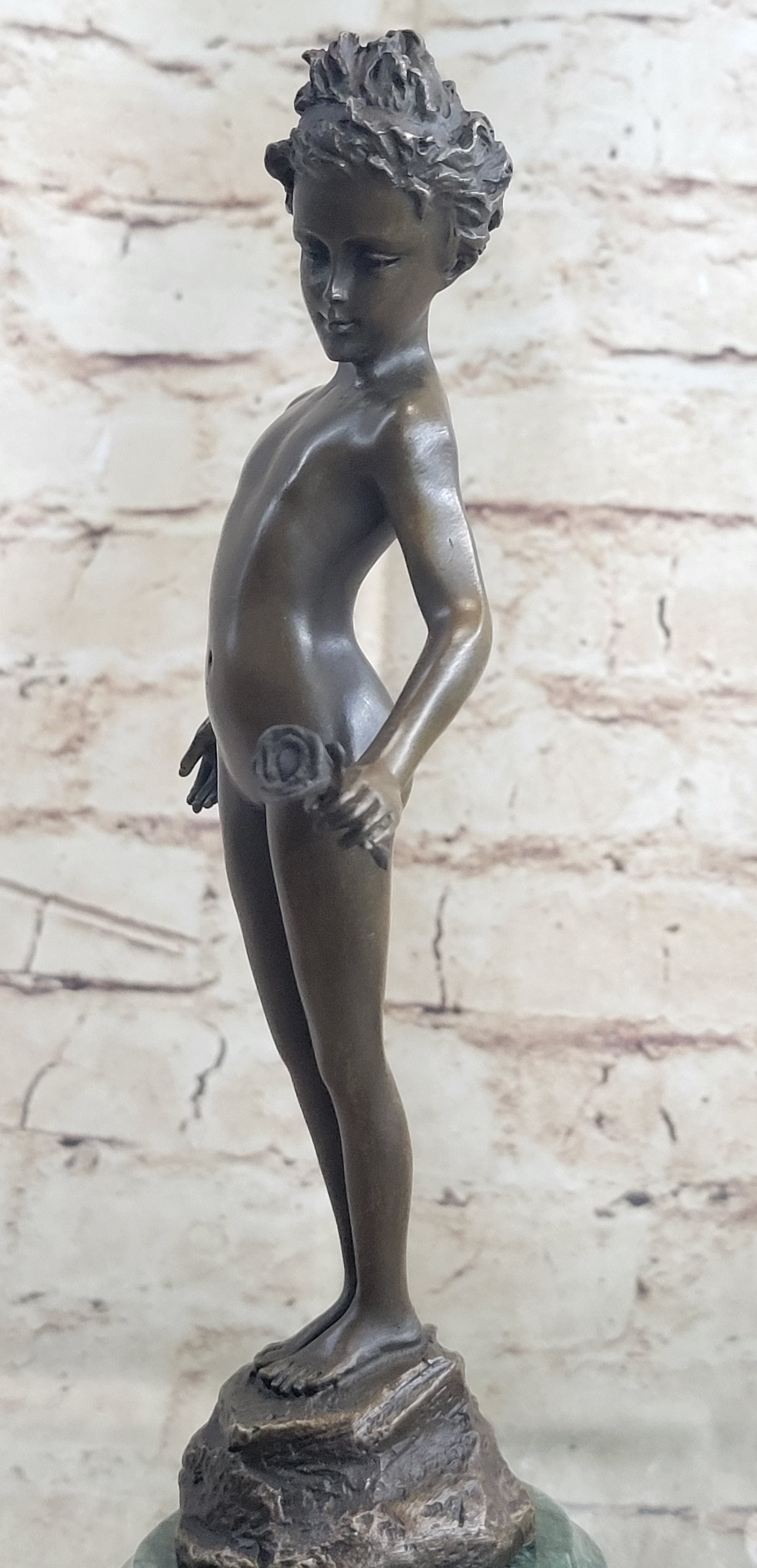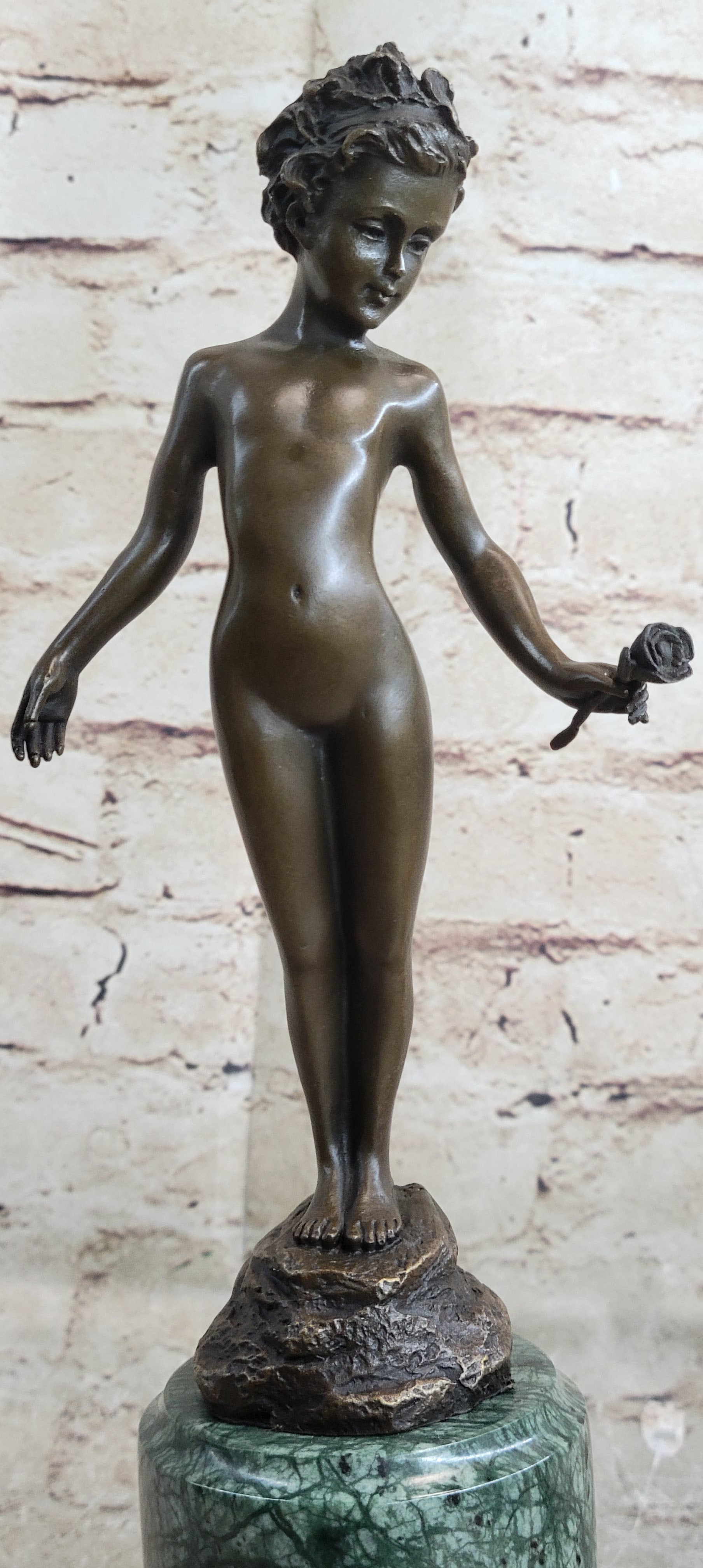 This stunning bronze sculpture depicts a beautiful and confident young girl standing tall with her chest puffed out. In her hand, she holds a single lone-stemmed flower, offering it to the world with grace and poise. Her wild curly hair adds to her natural beauty, while her slender figure exudes confidence and strength.