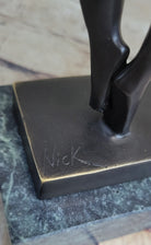 Crafted with unparalleled skill and precision using the time-honored lost wax method, this abstract basketball player sculpture stands elegantly on a round black marble base, elevating its visual appeal and creating a striking focal point wherever it is placed. The sculpture bears the distinctive signature of the esteemed artist Nick, underscoring the craftsmanship and artistic excellence that defines this remarkable piece of art.Bronze Dimensions with Marble Base: Height 12.5" X Width 3.5"