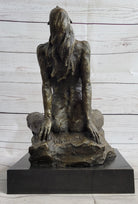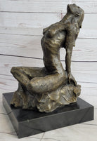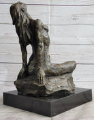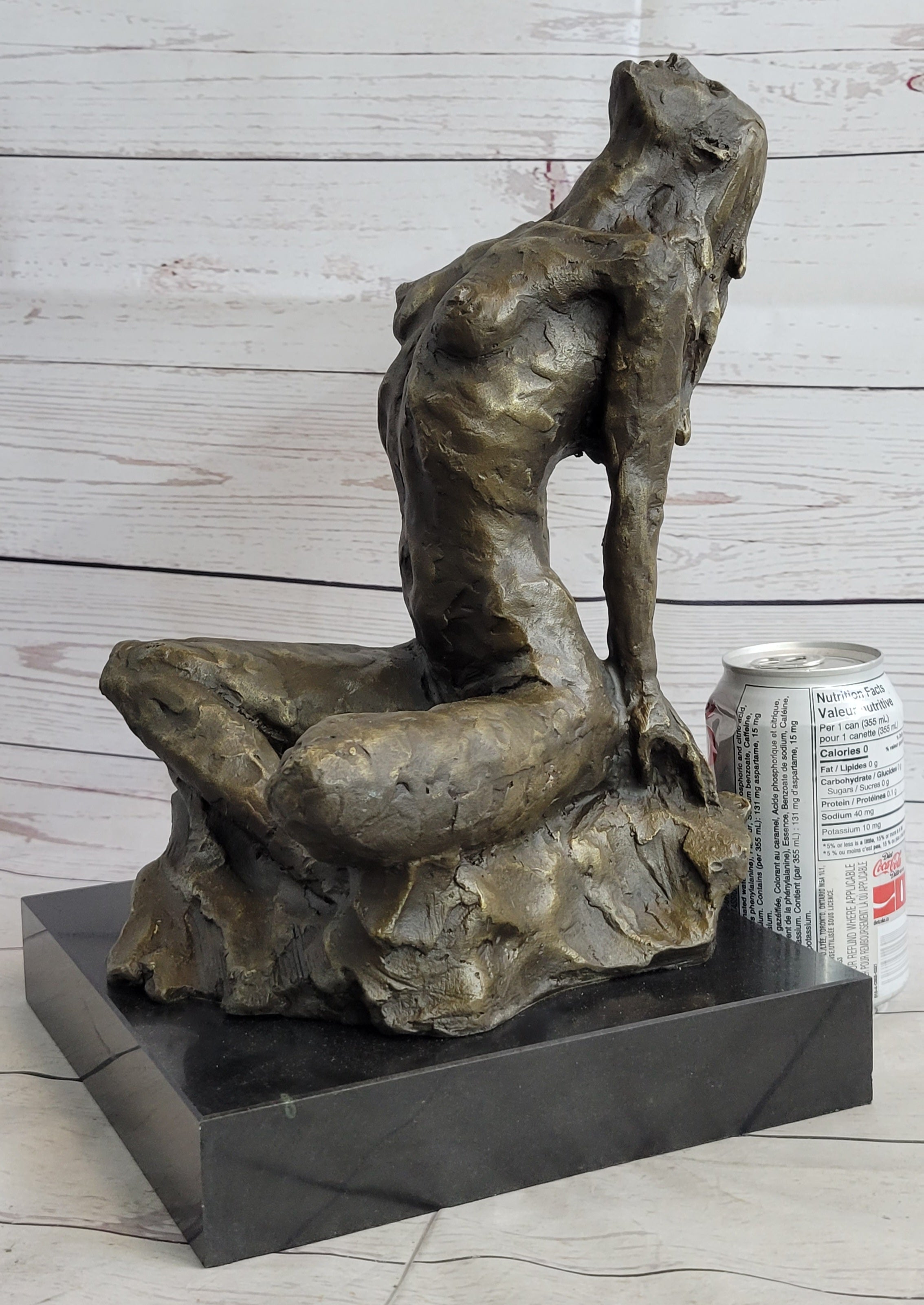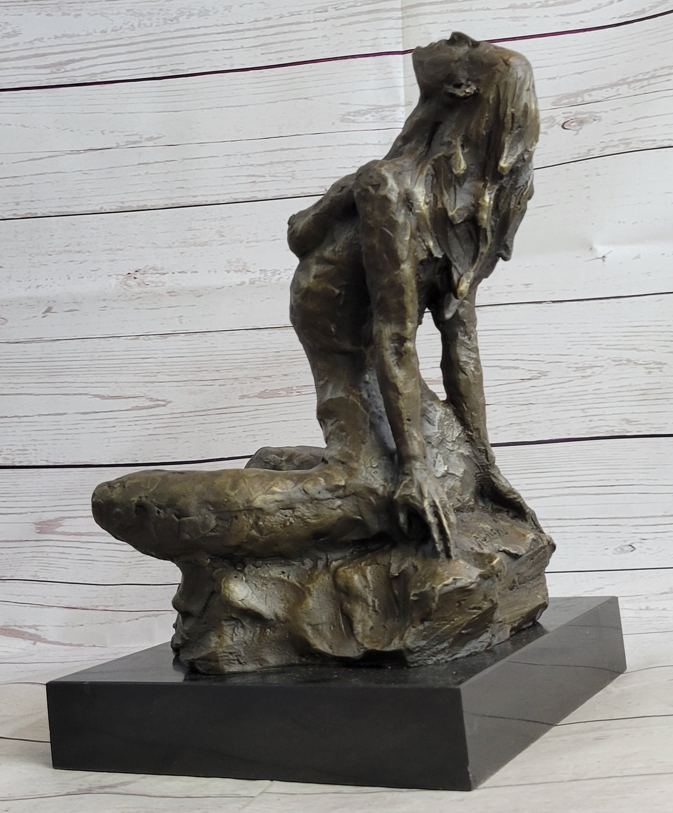 The raw beauty of this piece is heightened by its uniquely textured, ragged, stone-like surface, which provides a striking contrast to the smooth contours of her form. This interplay of textures creates a palpable tension between the refined and the primal, underscoring the sculpture’s carnal and rugged character.