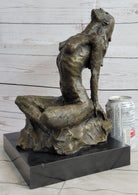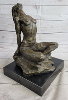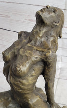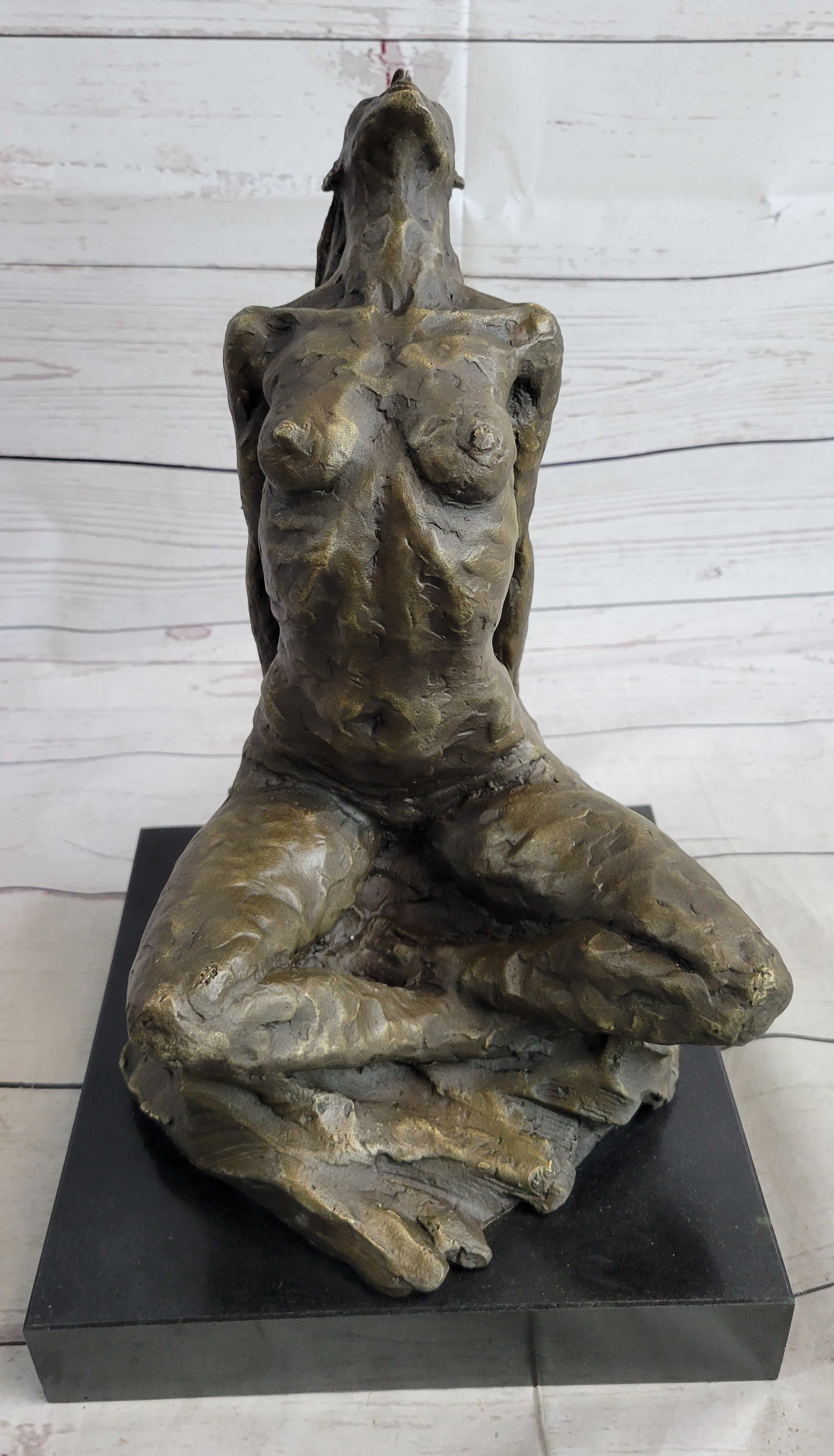 This evocative bronze sculpture portrays a nude woman in a moment of unguarded ecstasy. Seated cross-legged in the classic lotus position, she tilts her head back and arches her back in a display of pure pleasure. Her hands, placed behind her for support, accentuate the graceful curves of her body while capturing an intimate, almost transcendent state.