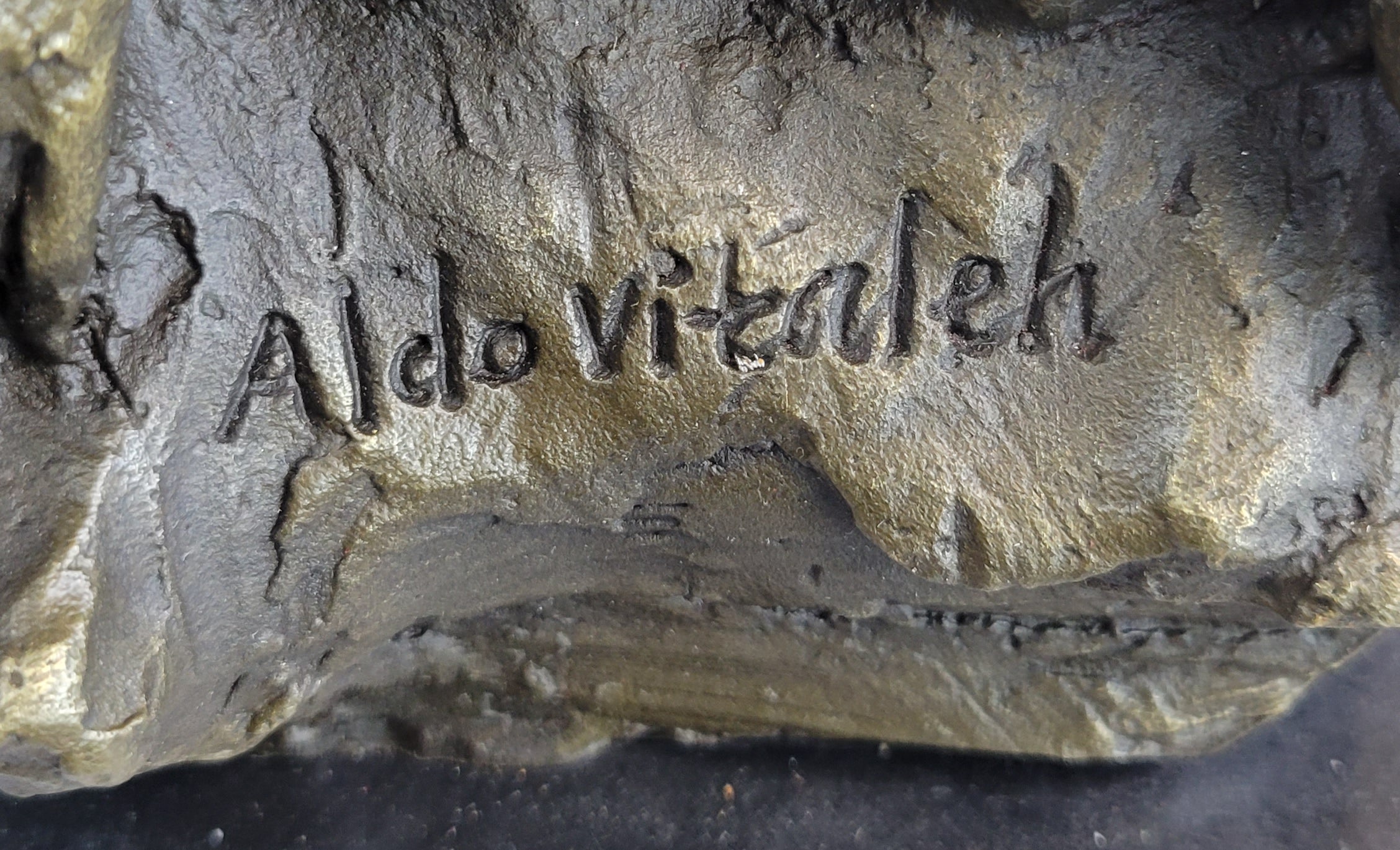 Meticulously handcrafted using the ancient lost-wax casting method, this 100% bronze work stands proudly on a sleek black marble base. Signed by Aldo Vitaleh, it is a masterful exploration of sensuality and artistic expression—a truly remarkable piece destined to become a cherished centerpiece for any art collection.Bronze Dimensions with Marble Base: Height 13" X Width 8"