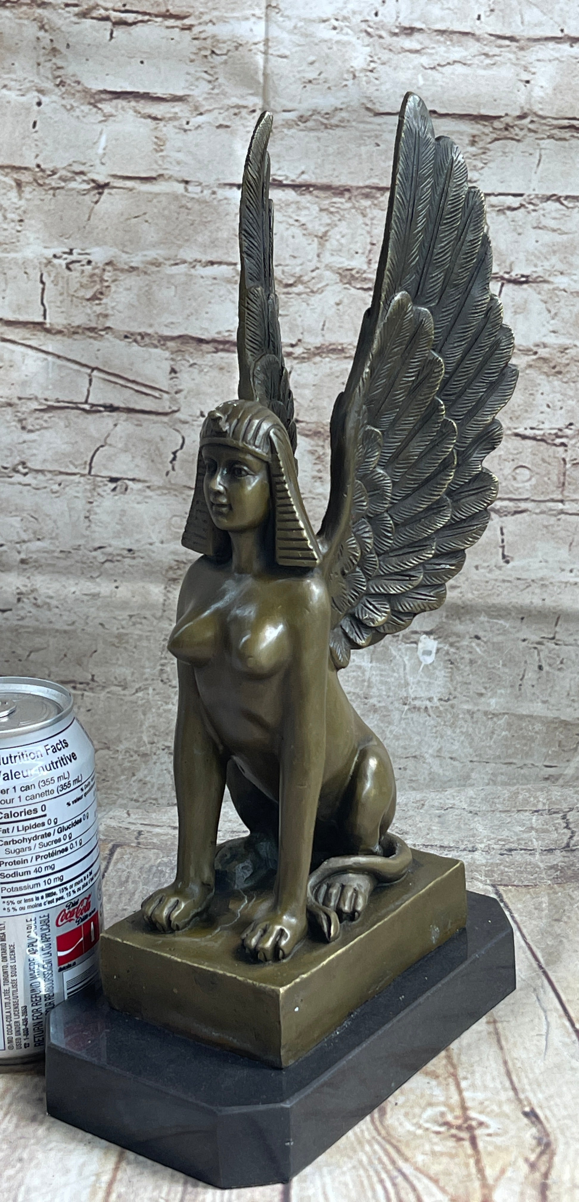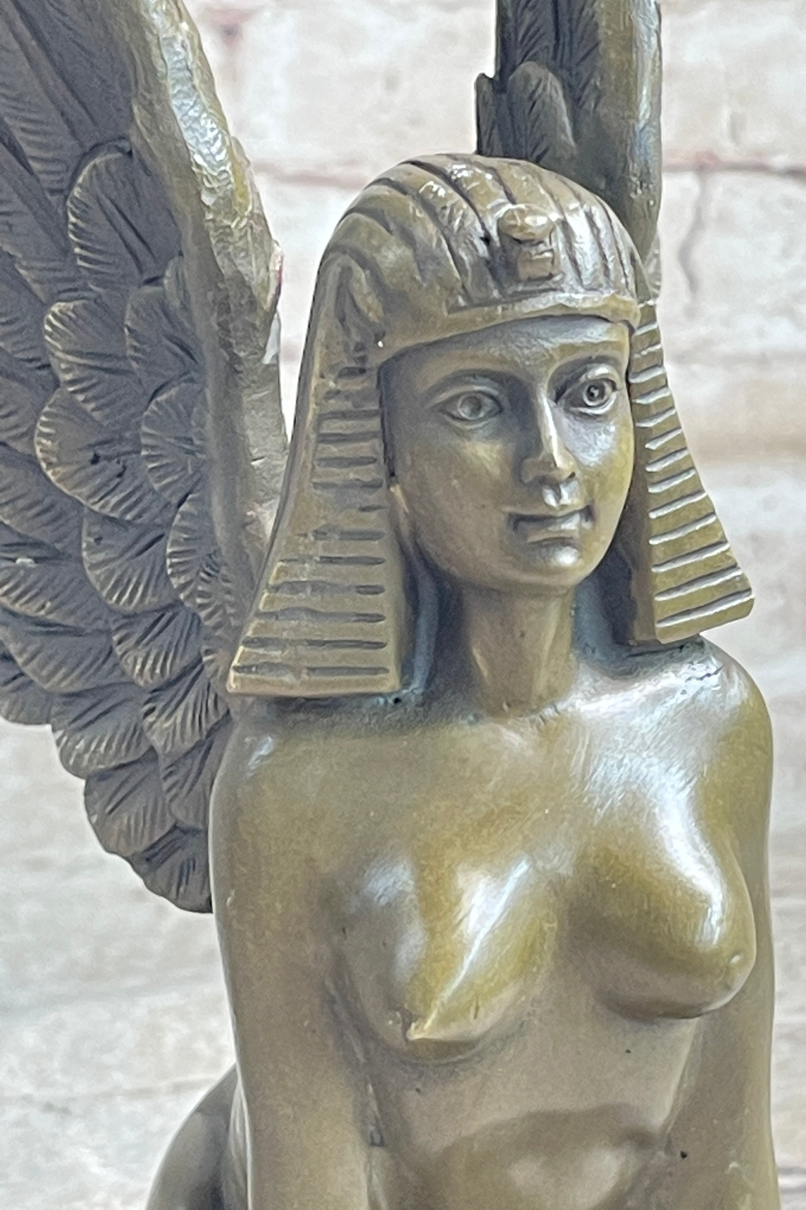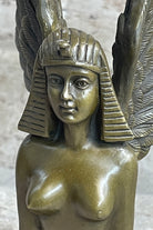 This fine art bronze sculpture captures the essence of the Sphinx's mystique and power. Hand-tooled with precision using the lost wax casting method, the sculpture showcases intricate details, from the golden bronze finish of her skin tones to the flowing tresses of her hair. Her voluptuous figure and regal face add to the allure and grace of the artwork.