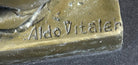 Mounted on a unique pedestal that depicts the Sphinx as the feet of the pedestal, guarding the woman above, this sculpture is not just a decorative piece but a symbol of mystery and strength. The dark brown polish enhances the beauty of the bronze, while the black marble base provides a stable foundation for display. Signed by the artist Aldo Vitaleh, this sculpture is destined to become a cherished family heirloom, embodying the timeless allure of Greek mythology and fine artistry.Bronze Dimensions with Marble Base: Height 12" X Width 7"
