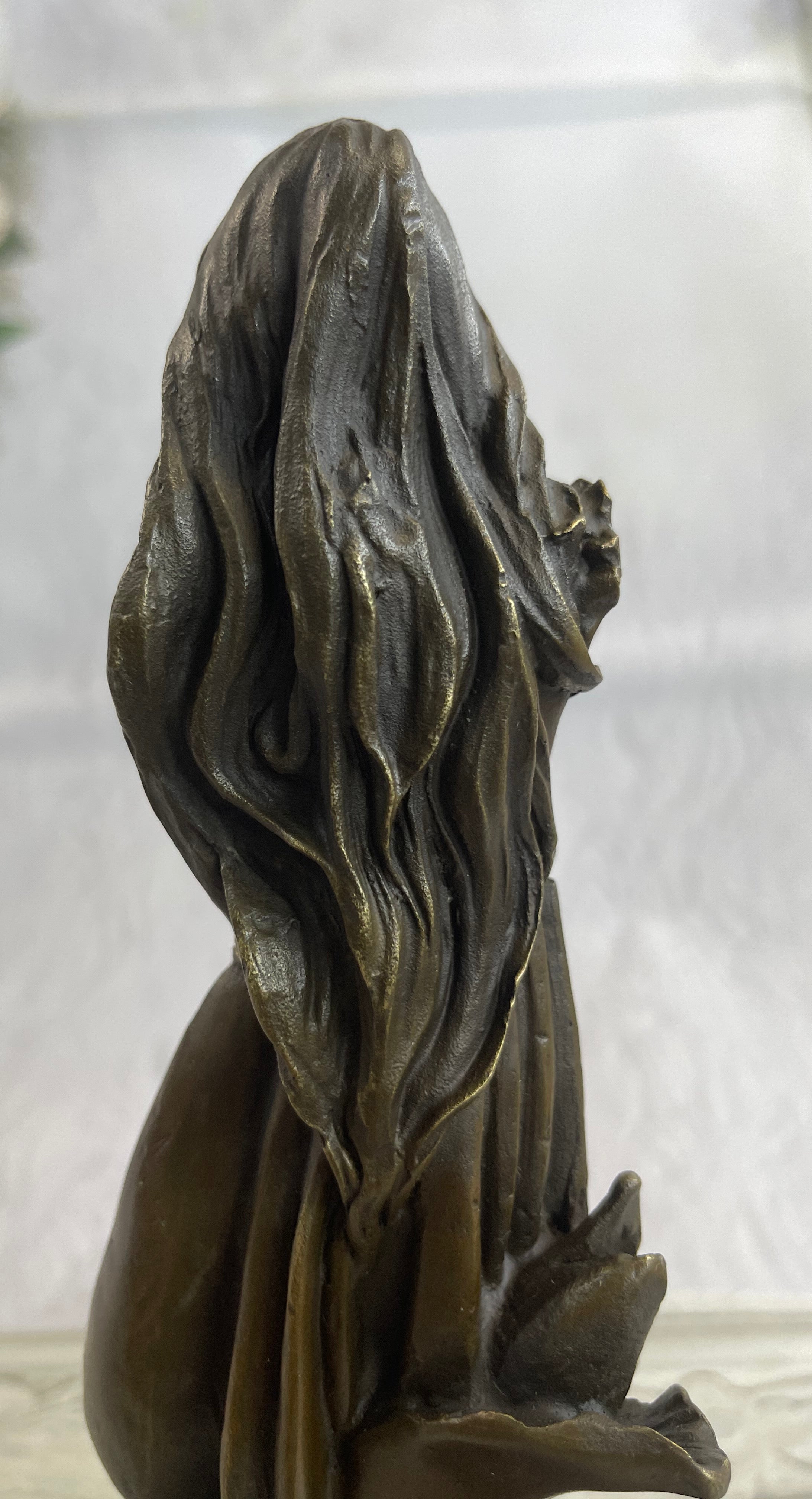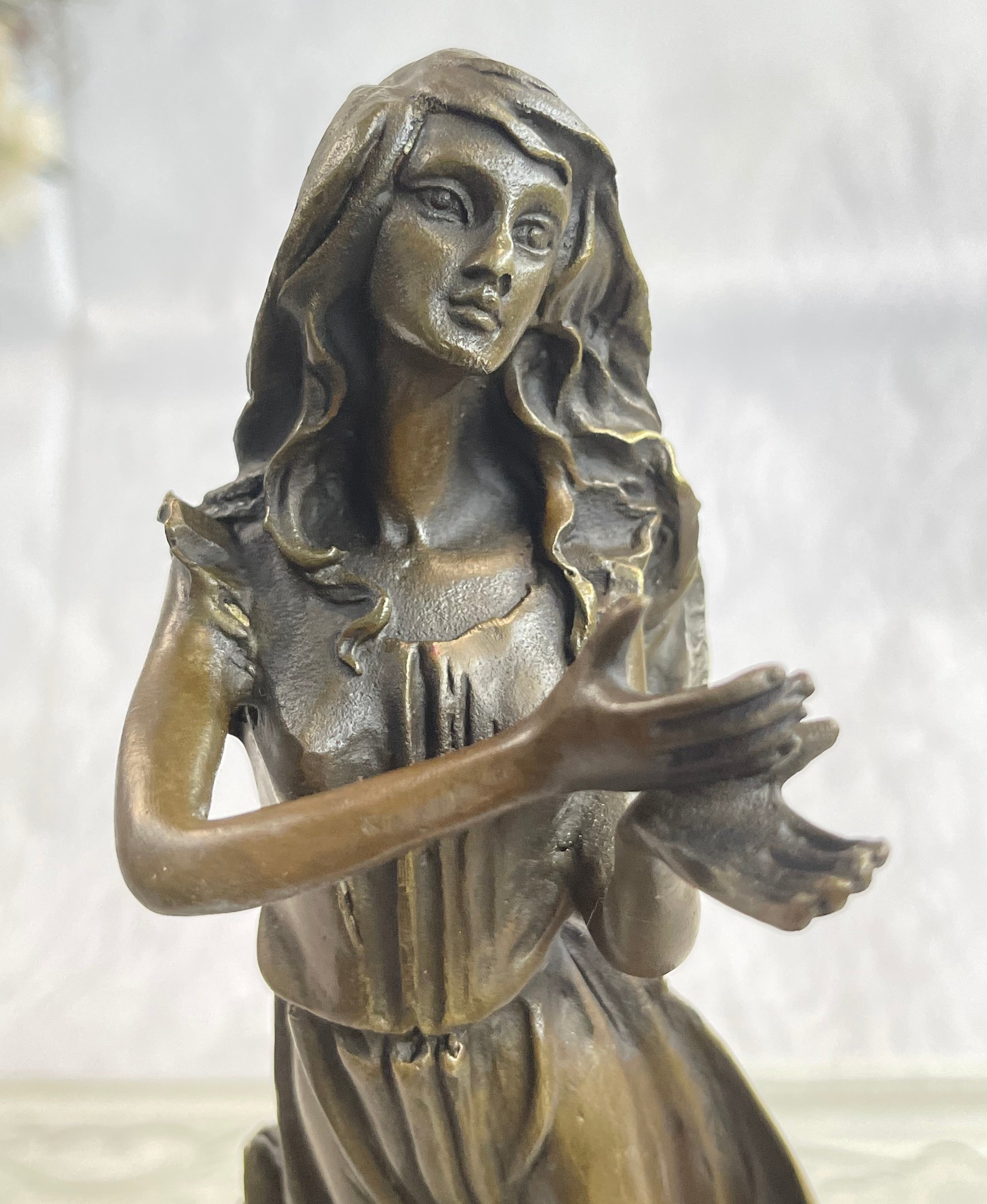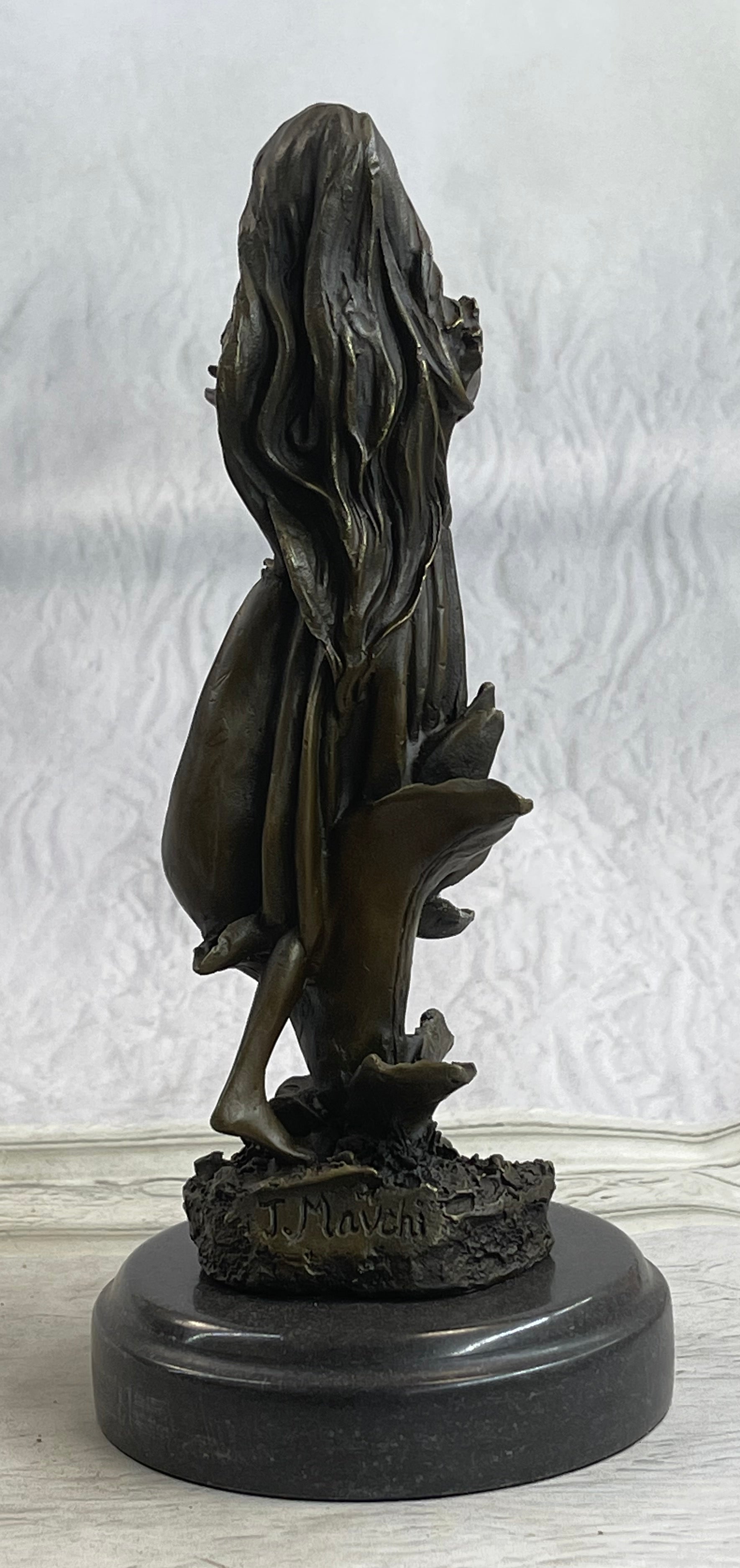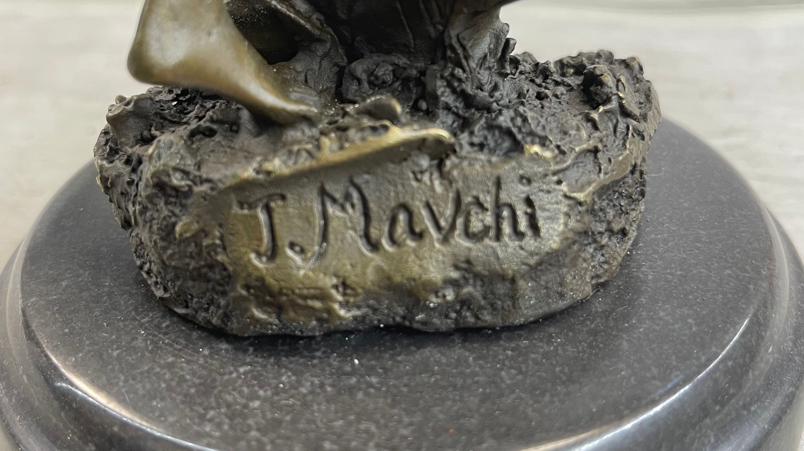 Handcrafted from 100% bronze, this sculpture is created using the traditional "Lost Wax Method", ensuring precision and detail. The rich brown patina enhances its depth and character, while the marble base provides a touch of refinement. Signed by artist J. Mavchi, this stunning piece embodies elegance, artistry, and the essence of peaceful contemplation..Bronze Dimensions with Marble Base: Height 10.5" X Width 4.5"