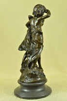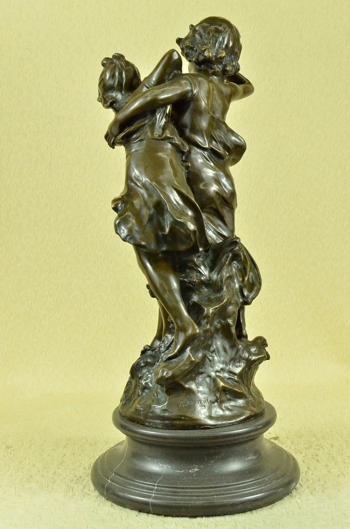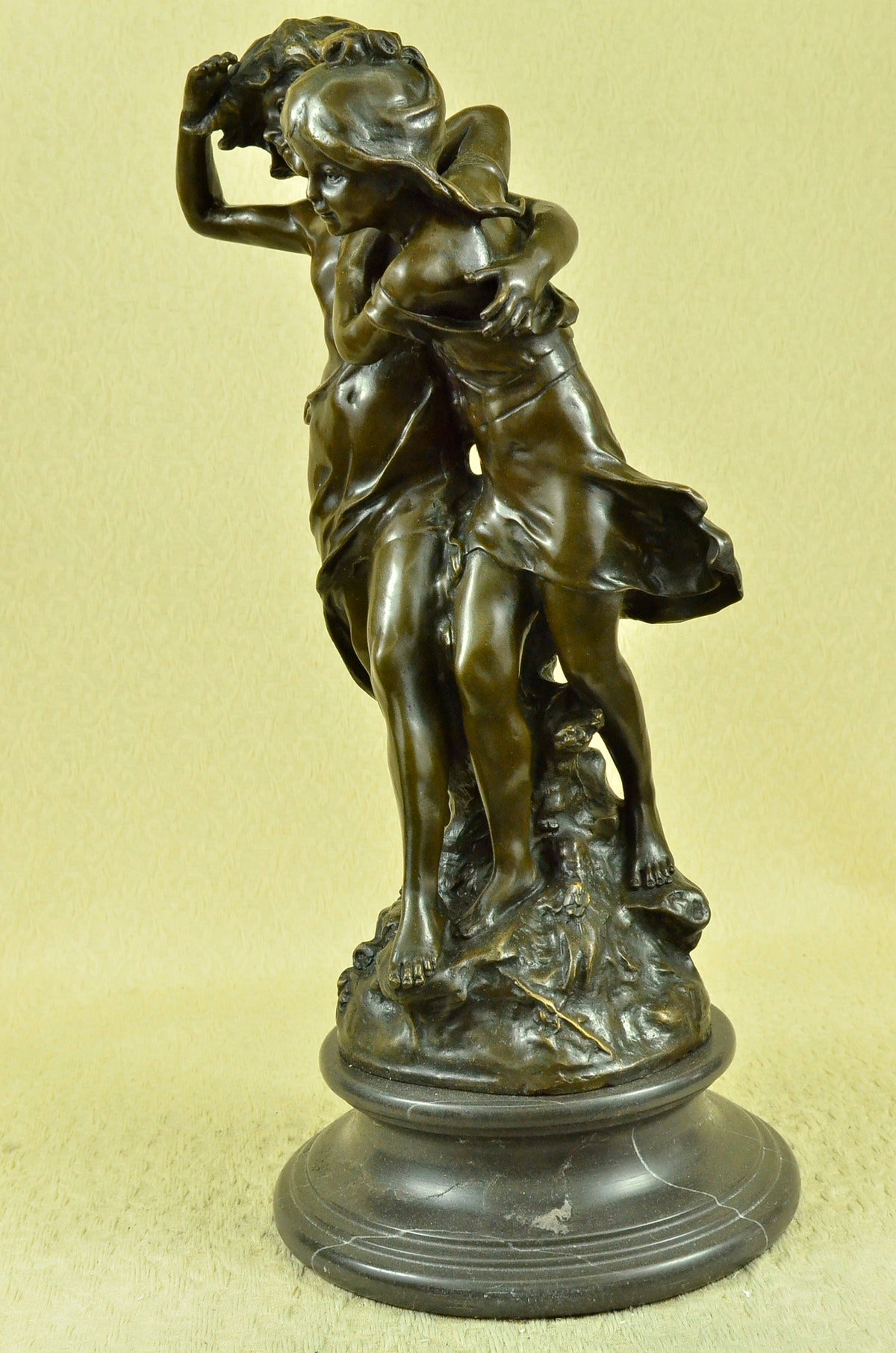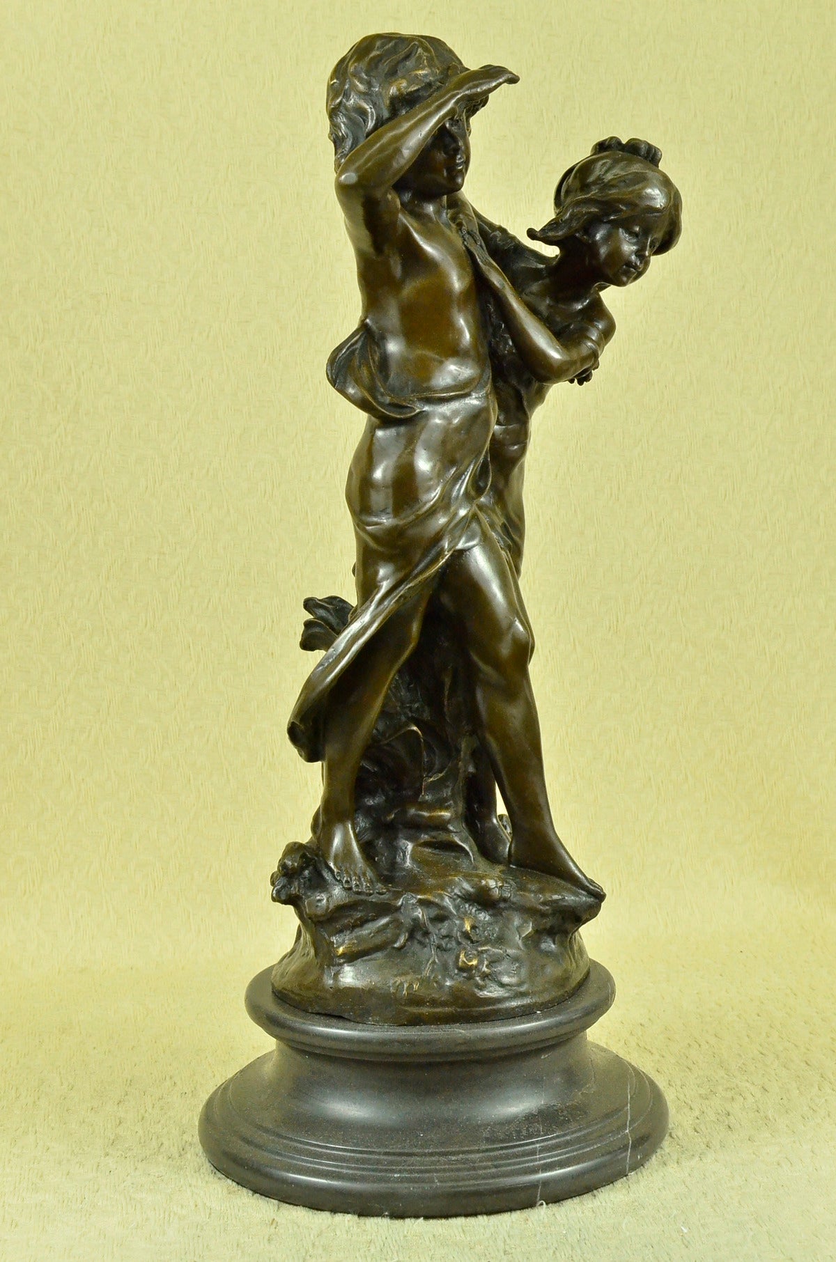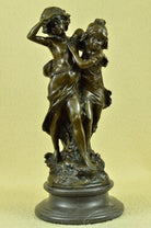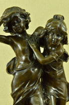 Signed Original Boy and girl Walking Outdoor Bronze Sculpture Marble Base Statue
