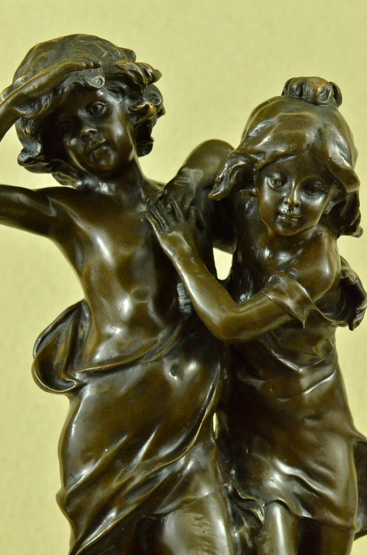 This enchanting bronze sculpture portrays the innocence and curiosity of childhood as two children walk together outdoors. With their clothes blowing in the wind, they are captivated by something ahead and below, prompting the girl to stretch away from her friend to get a closer glimpse.