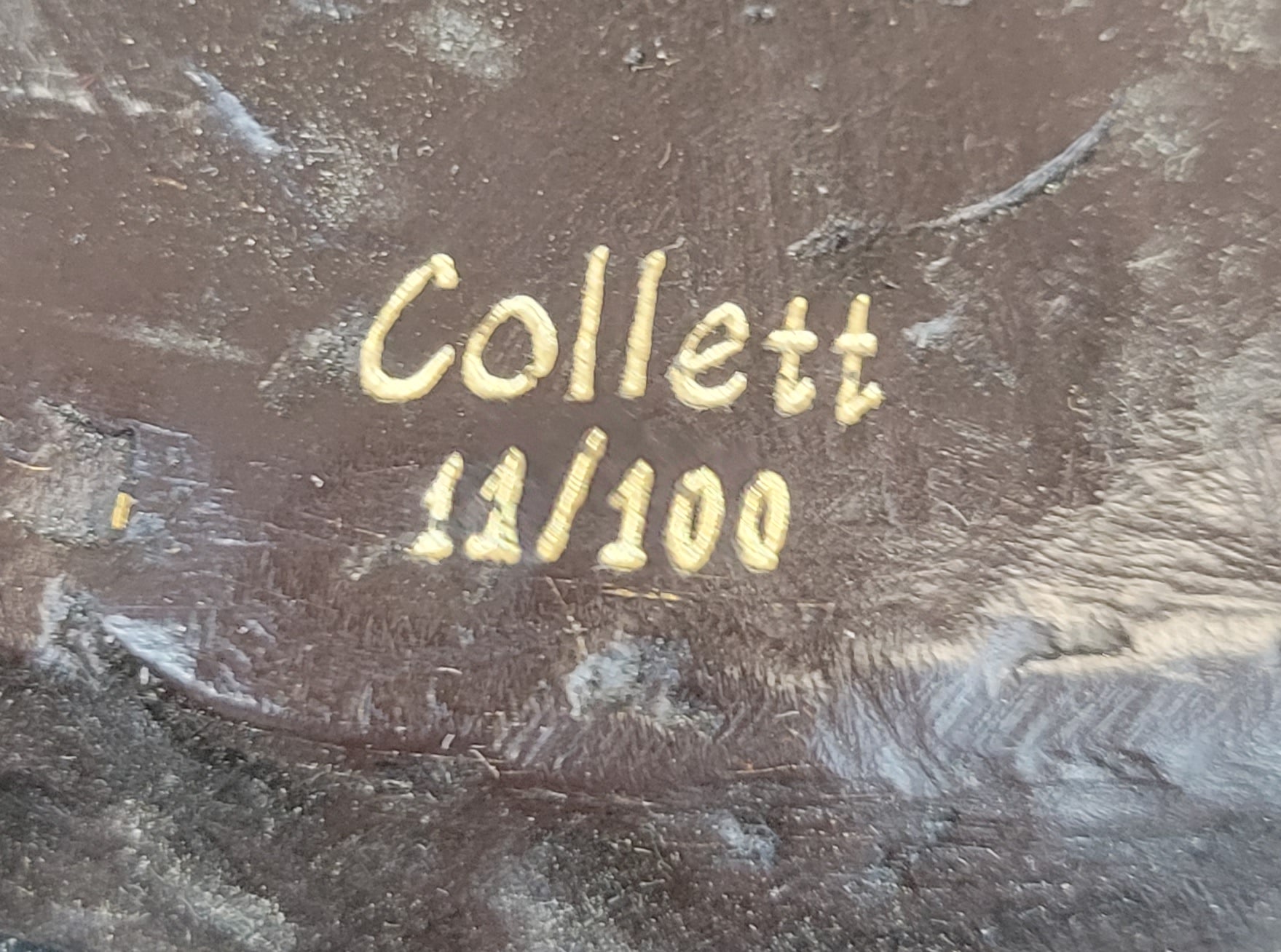 Handcrafted with precision, this statue is created using the time-honored and intricate lost wax method, reflecting the artist's dedication to preserving the essence of the gymnast's movements. The sculpture boasts a beautiful patina texture, enhancing the artistry of her attire with a cleanly aged green finish. Poised upon a smooth marble base, this limited edition piece stands as a testament to both the athleticism and artistry of rhythmic gymnastics. It bears the artist Collett's signature and a unique serial number, affirming its authenticity and place in a select collection.
