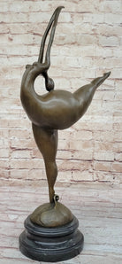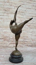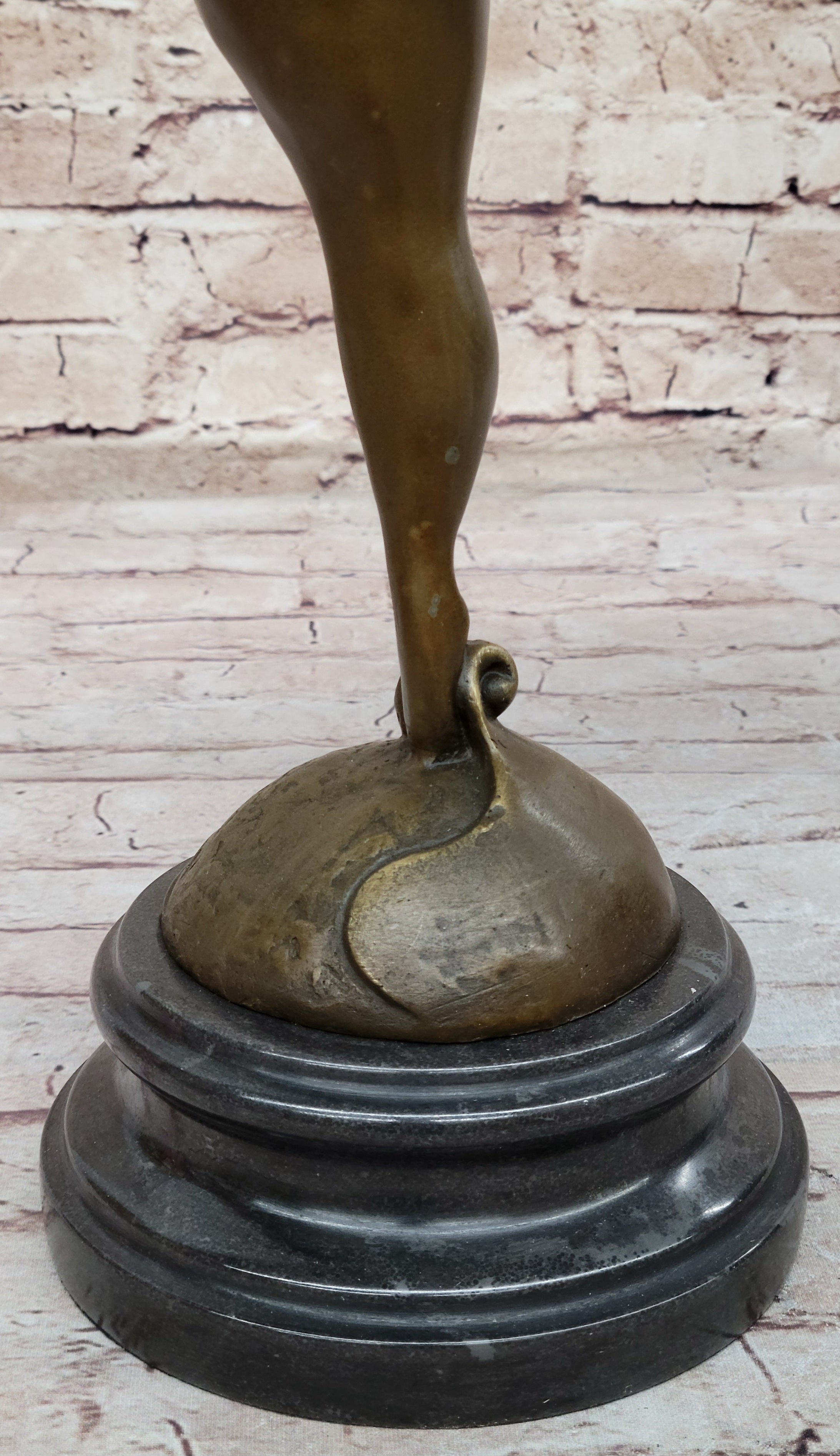 Mounted on a black marble base, the sculpture gains stability and a visually striking presentation that complements its overall aesthetic. The artist, Milo, leaves his signature, adding a personal touch and recognizing the skilled craftsmanship behind this captivating depiction of movement and femininity. The sculpture becomes more than a representation; it transforms into a celebration of form, movement, and the enduring allure of the female body, making it a noteworthy addition to any art collection.Bronze Dimensions with Marble Base: Height 21" X Width 7"