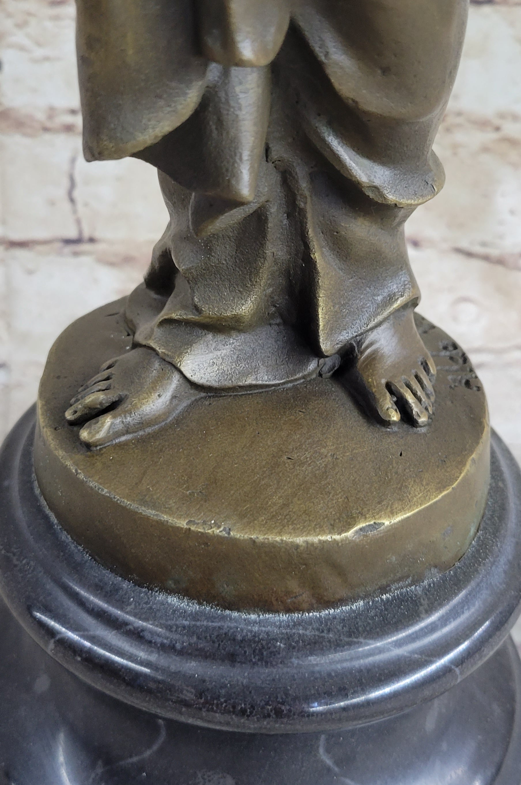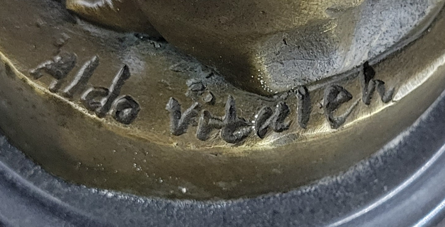 Handcrafted using the traditional lost-wax casting method, the sculpture features a warm brown patina that enhances the richness of the bronze. It is mounted elegantly on a polished black marble square base, providing stability and a refined contrast to the dynamic figure. The piece is signed by the artist Aldo Vitaleh, making it a truly remarkable and collectible work of art.Bronze Dimensions with Marble Base: Height 19" X Width 5.5"