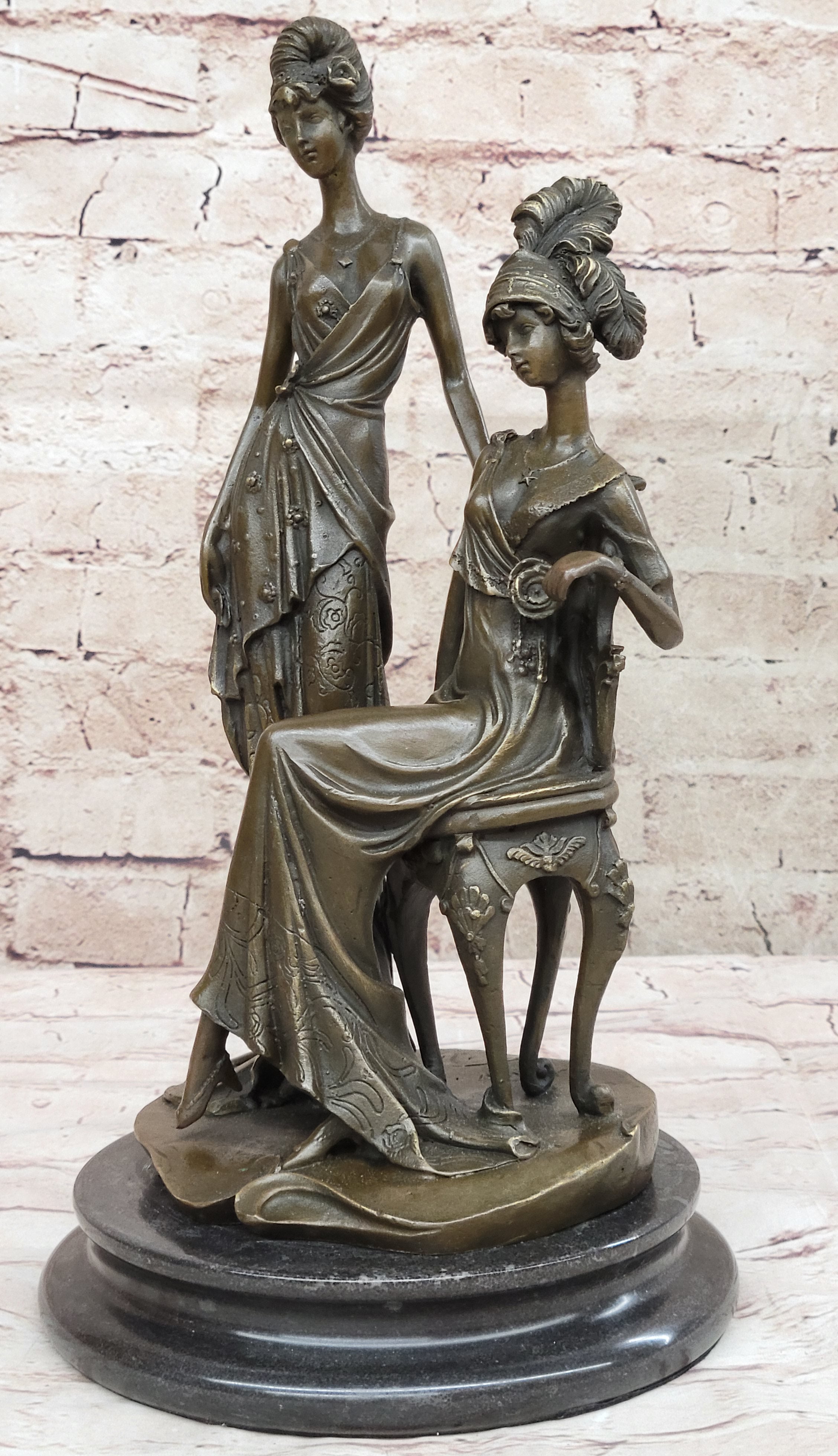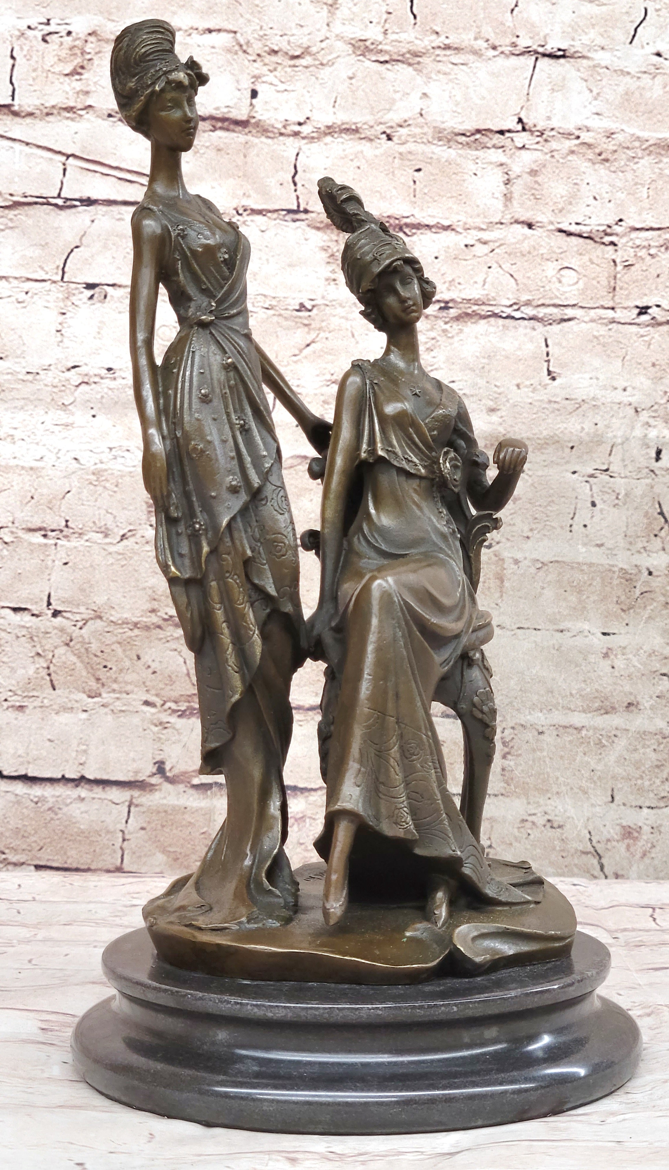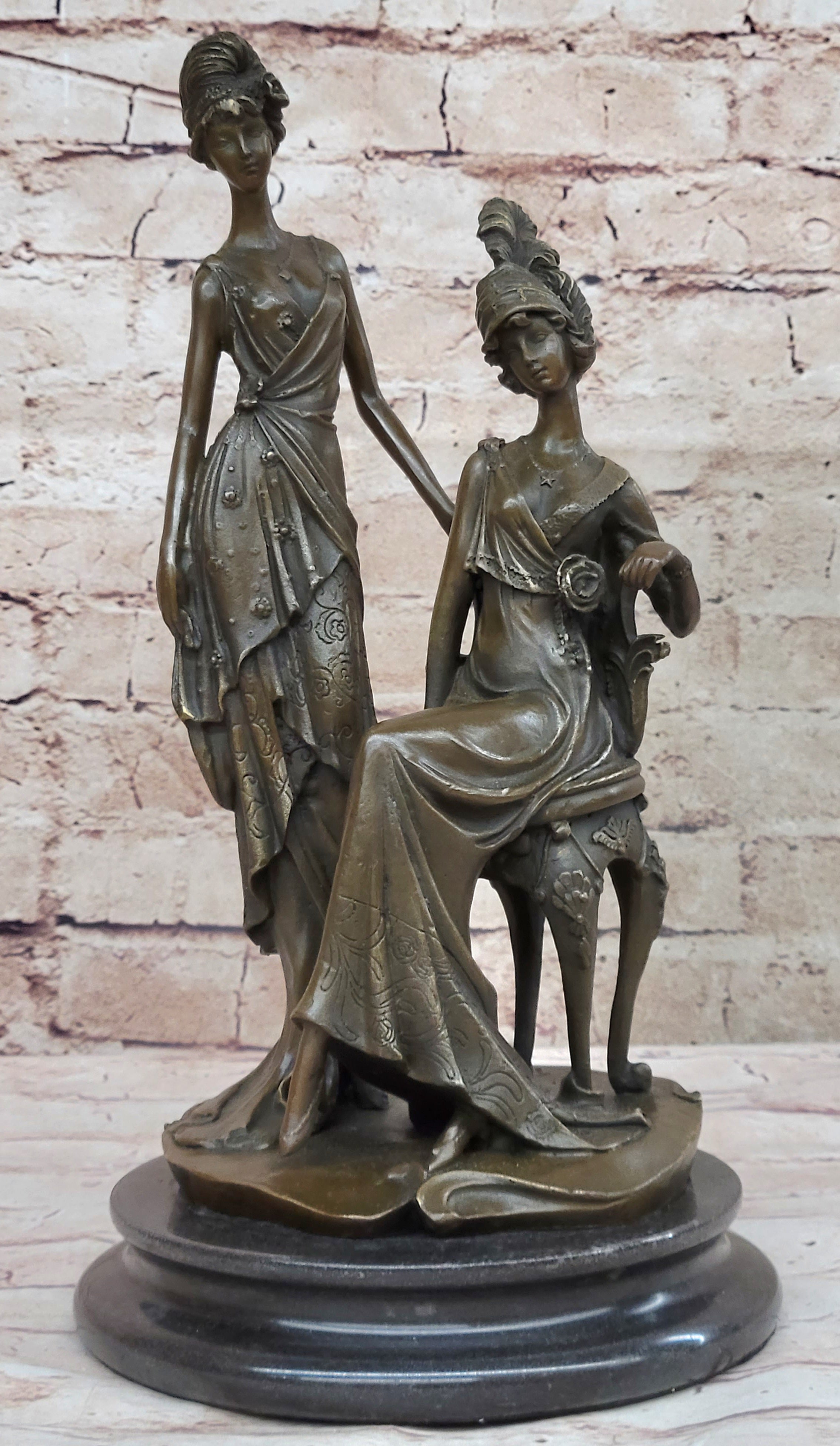 Immerse yourself in the glamour of the 1920s with this stunning bronze sculpture capturing the essence of two women in exquisite detail. Ideal for a refined living room or a young lady's bedroom, this sculpture showcases one woman in a poised standing position, while the other is gracefully seated on a chair during their photoshoot. The artist has intricately carved every element, from the floor-length dresses that cascade down to the floor, to the intricate necklace, waist belt, overcoat, and Charleston hat. The meticulous attention to detail brings their image to life, reflecting the artist's exceptional skill. Crafted using the esteemed "Lost Wax Method," this sculpture exhibits a captivating brown patina that enhances its beauty. Mounted on a sleek marble base, this 100% bronze artwork is entirely handmade, showcasing the artist's dedication and talent. It bears the signature of the esteemed artist Mavchi, adding a touch of authenticity and value to this remarkable piece.Bronze Dimensions with Marble Base: Height 14 1/5" X Width 8"