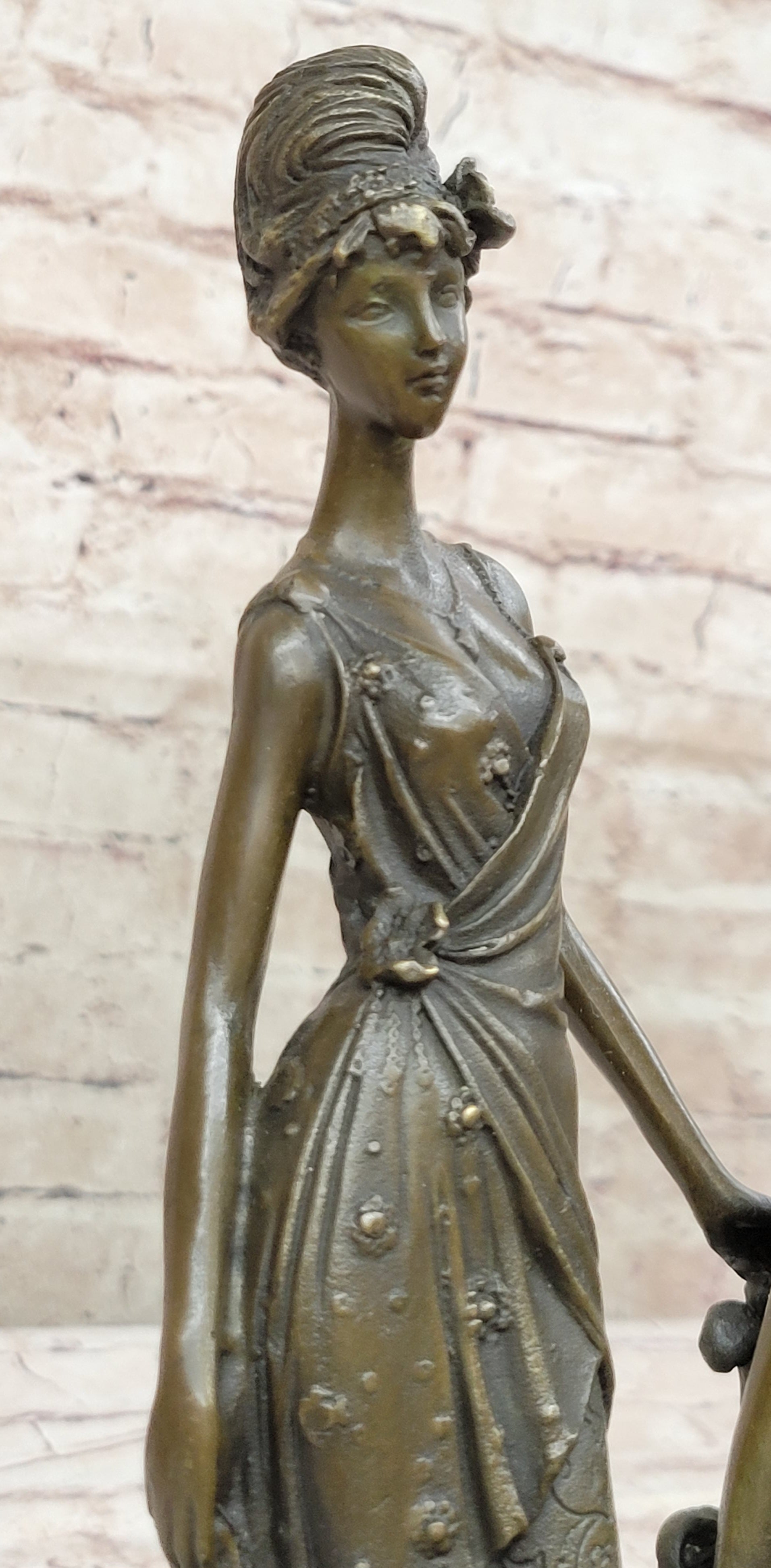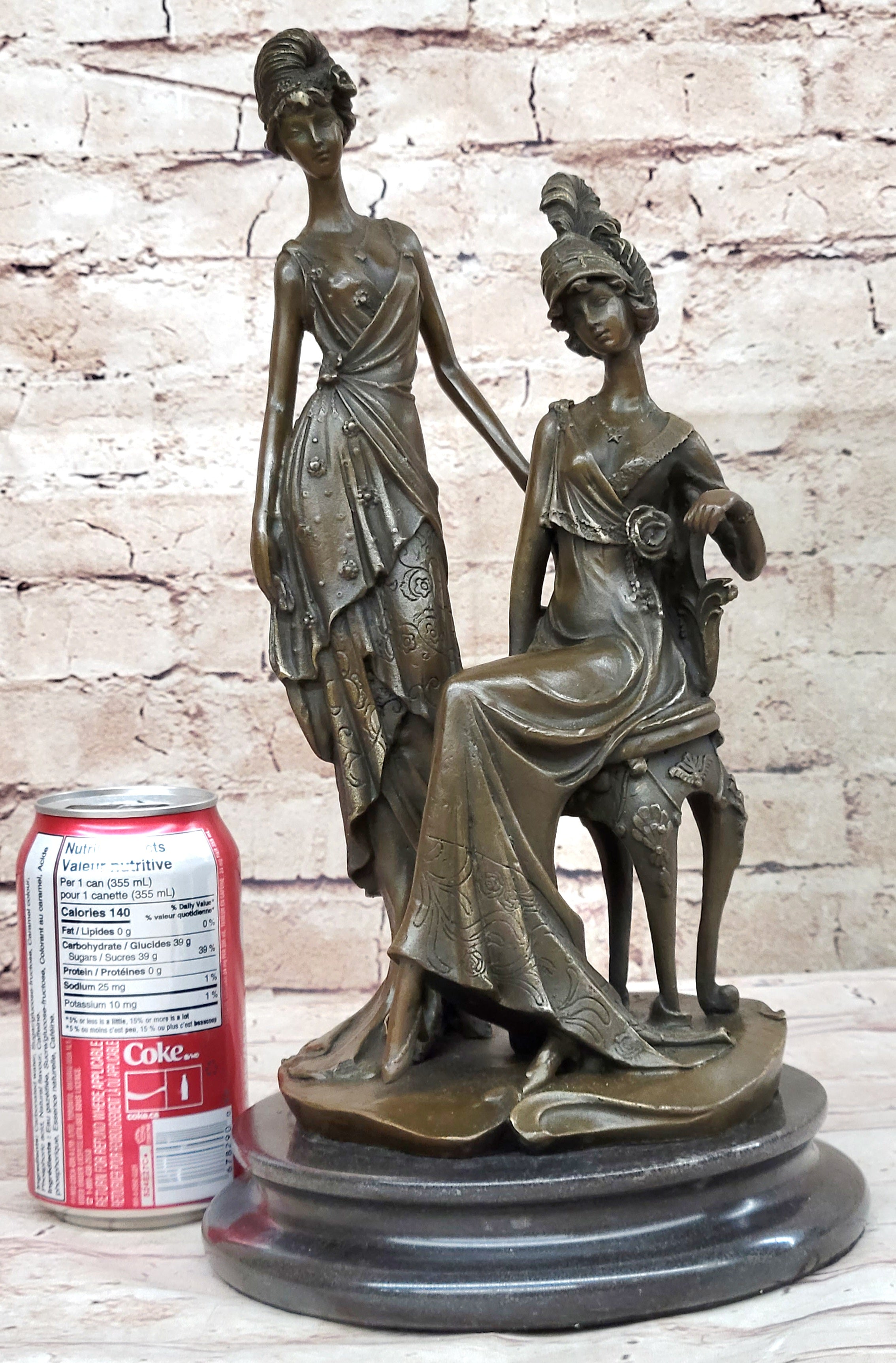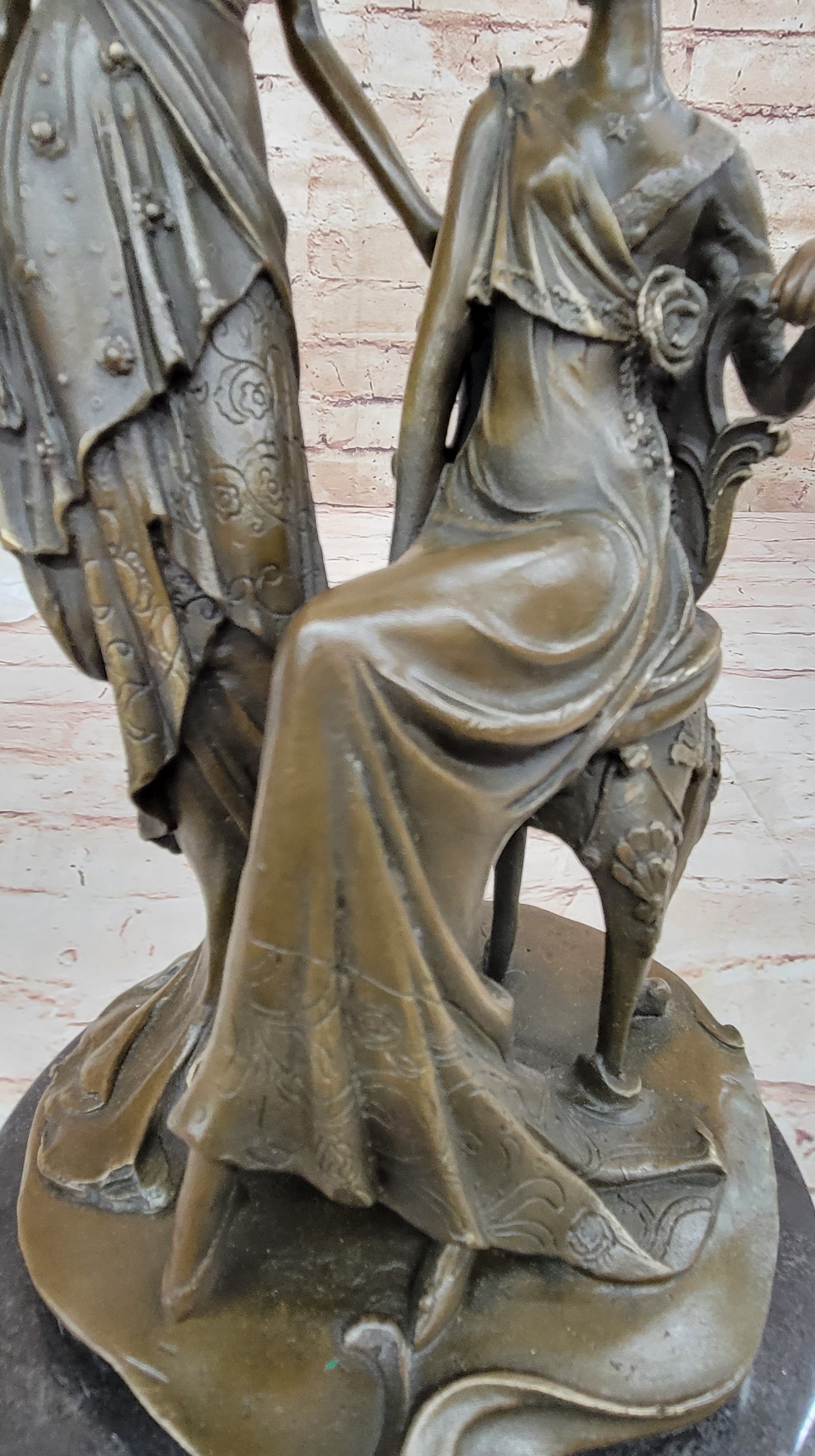 Immerse yourself in the glamour of the 1920s with this stunning bronze sculpture capturing the essence of two women in exquisite detail. Ideal for a refined living room or a young lady's bedroom, this sculpture showcases one woman in a poised standing position, while the other is gracefully seated on a chair during their photoshoot. The artist has intricately carved every element, from the floor-length dresses that cascade down to the floor, to the intricate necklace, waist belt, overcoat, and Charleston hat. The meticulous attention to detail brings their image to life, reflecting the artist's exceptional skill. Crafted using the esteemed "Lost Wax Method," this sculpture exhibits a captivating brown patina that enhances its beauty. Mounted on a sleek marble base, this 100% bronze artwork is entirely handmade, showcasing the artist's dedication and talent. It bears the signature of the esteemed artist Mavchi, adding a touch of authenticity and value to this remarkable piece.Bronze Dimensions with Marble Base: Height 14 1/5" X Width 8"