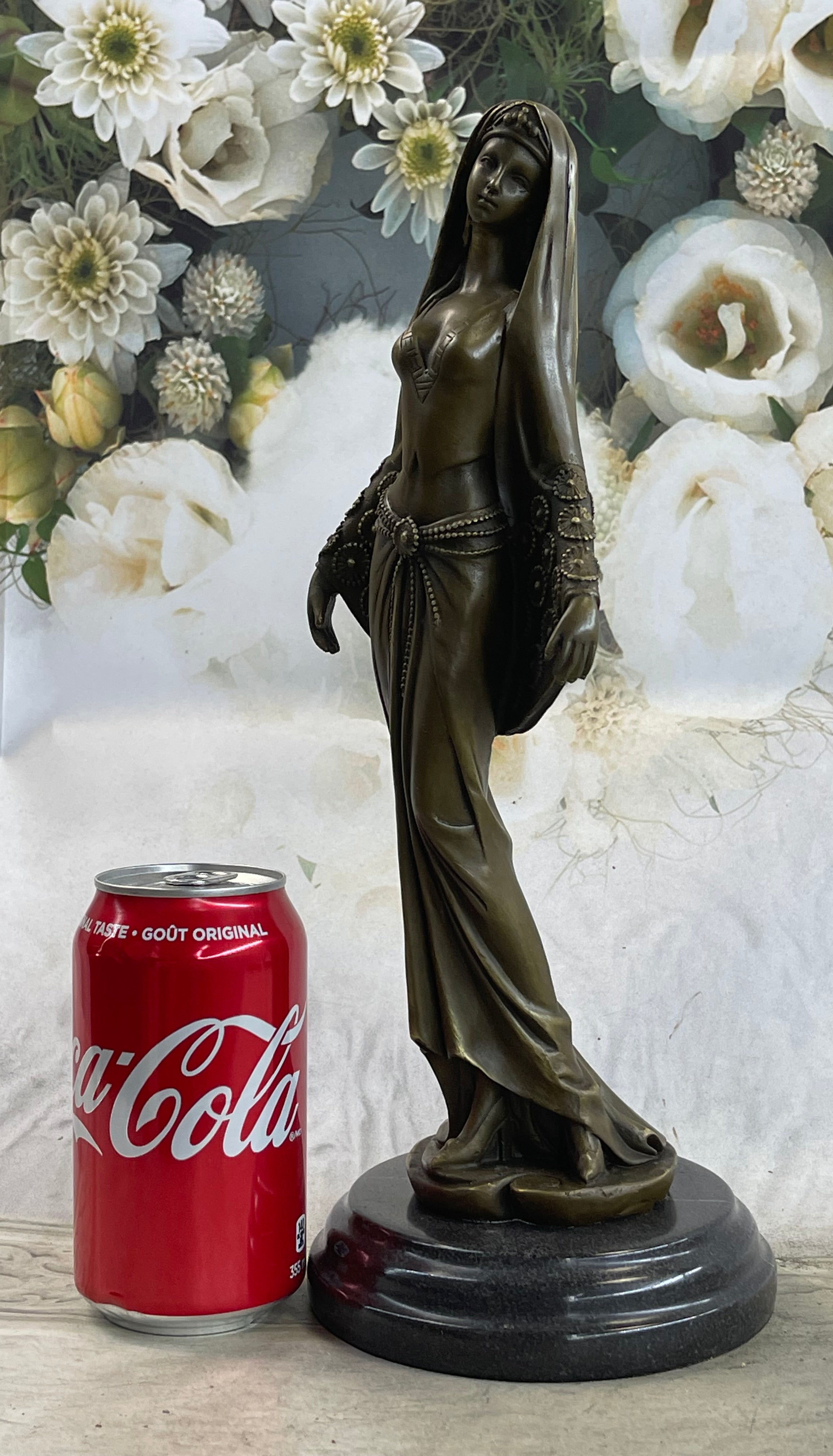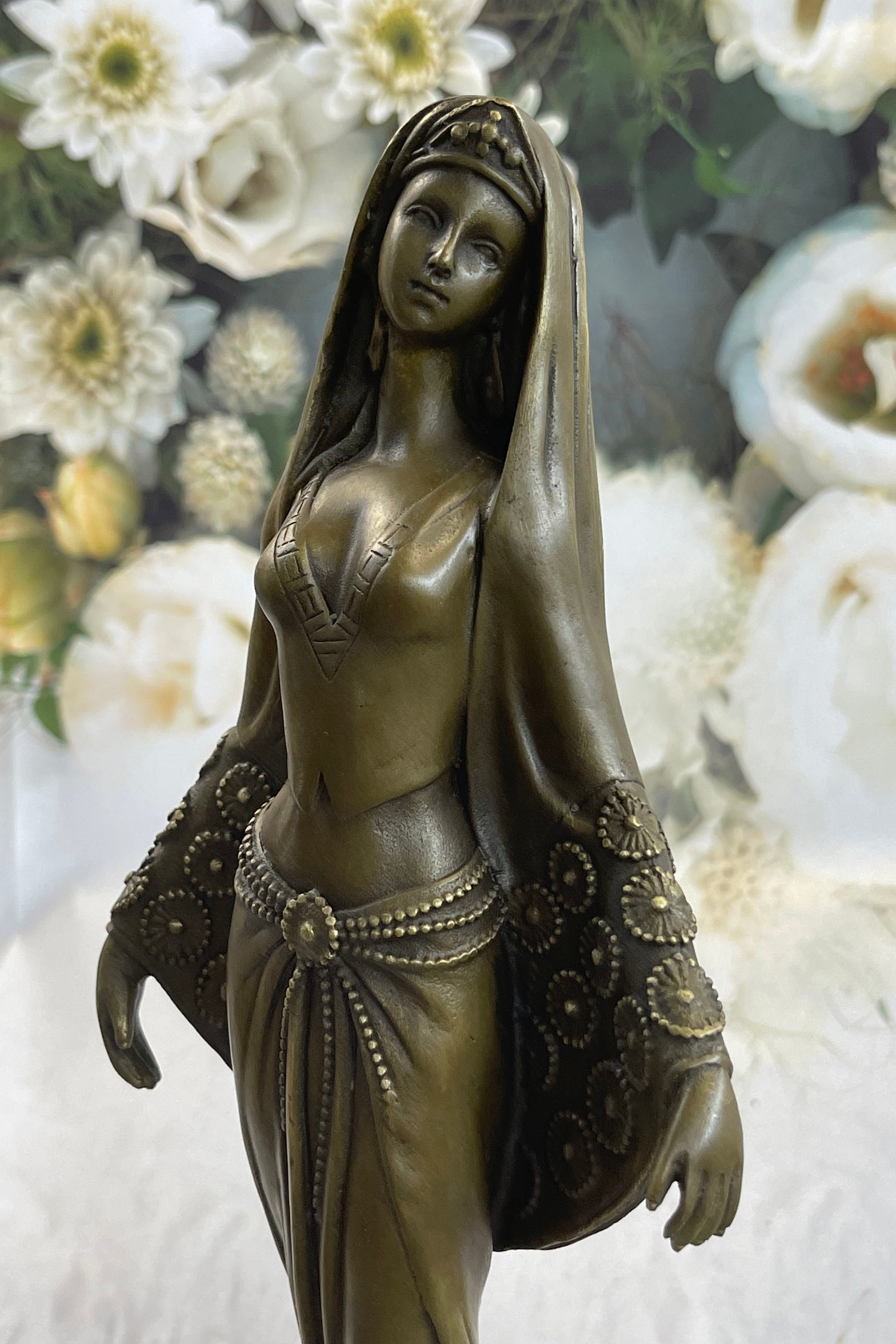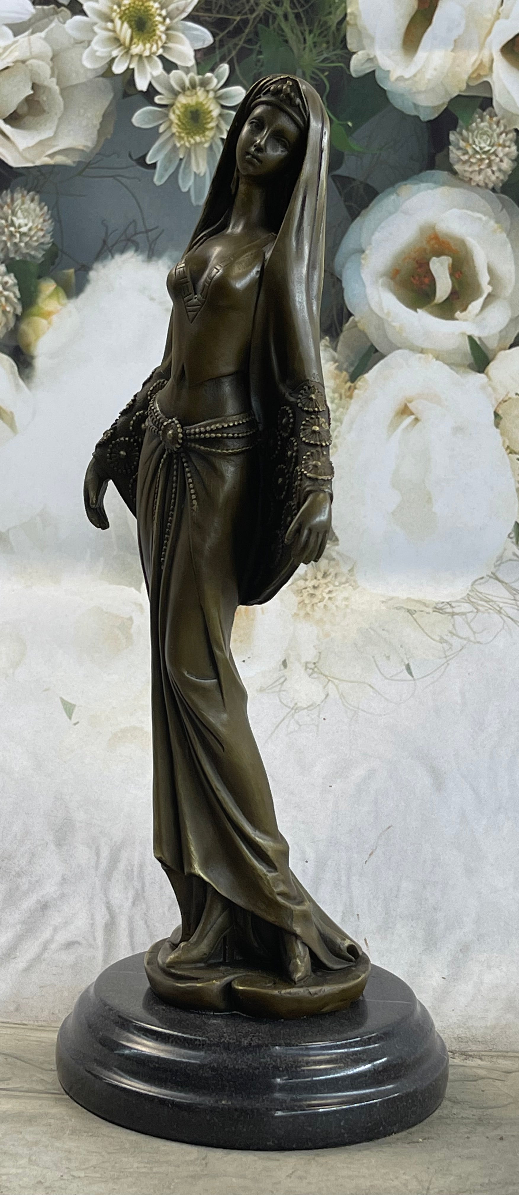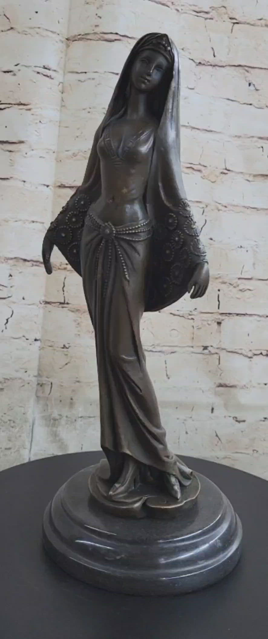 Elegance and artistry come together in this exquisite bronze sculpture, capturing the essence of an Arabian woman lost in the enchanting rhythm of music. With graceful poise and a touch of anticipation, she stands as a testament to the beauty of dance and the power of music to transport the soul. Her focus is unwavering, every detail of her movement attuned to the music that flows from the radio.