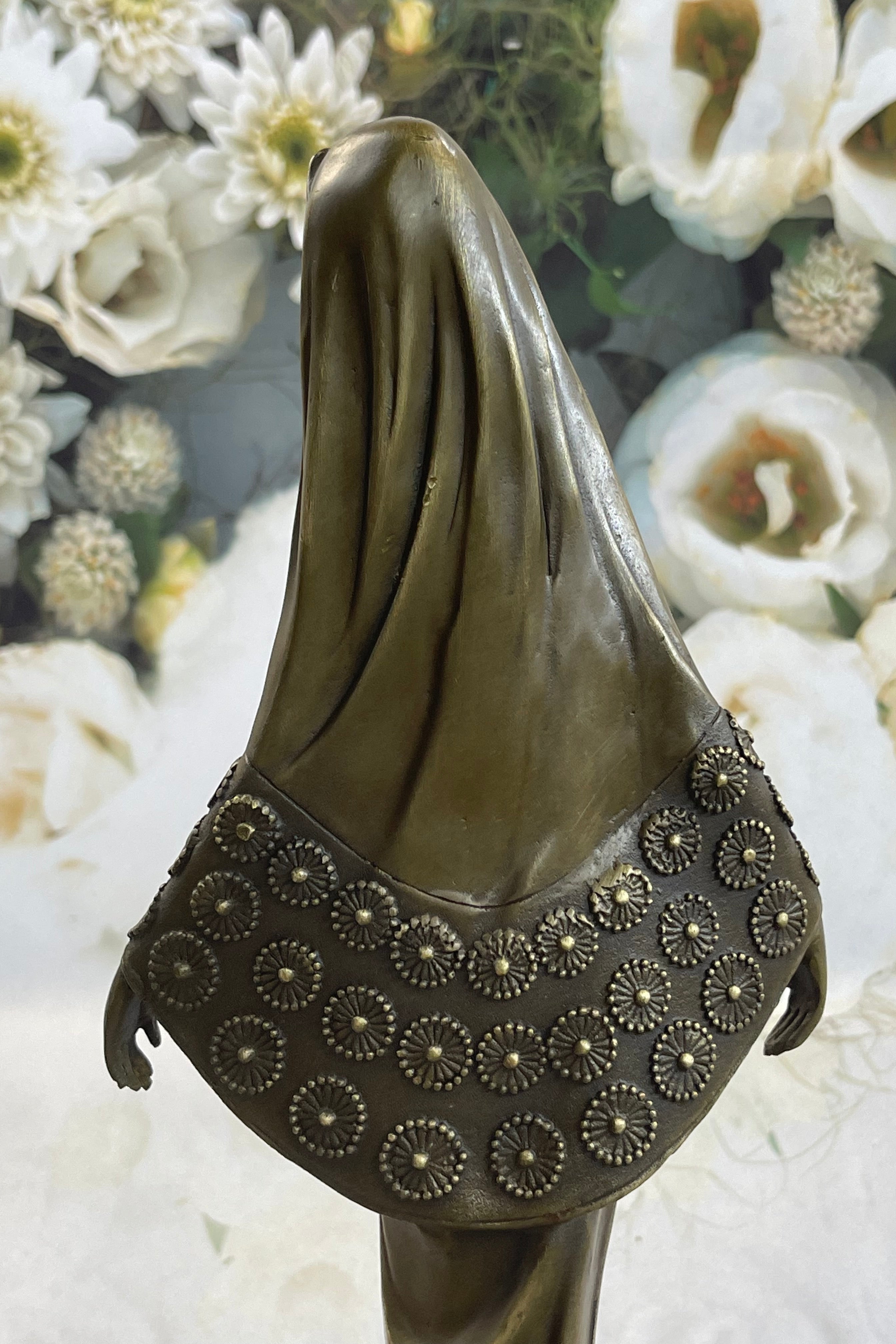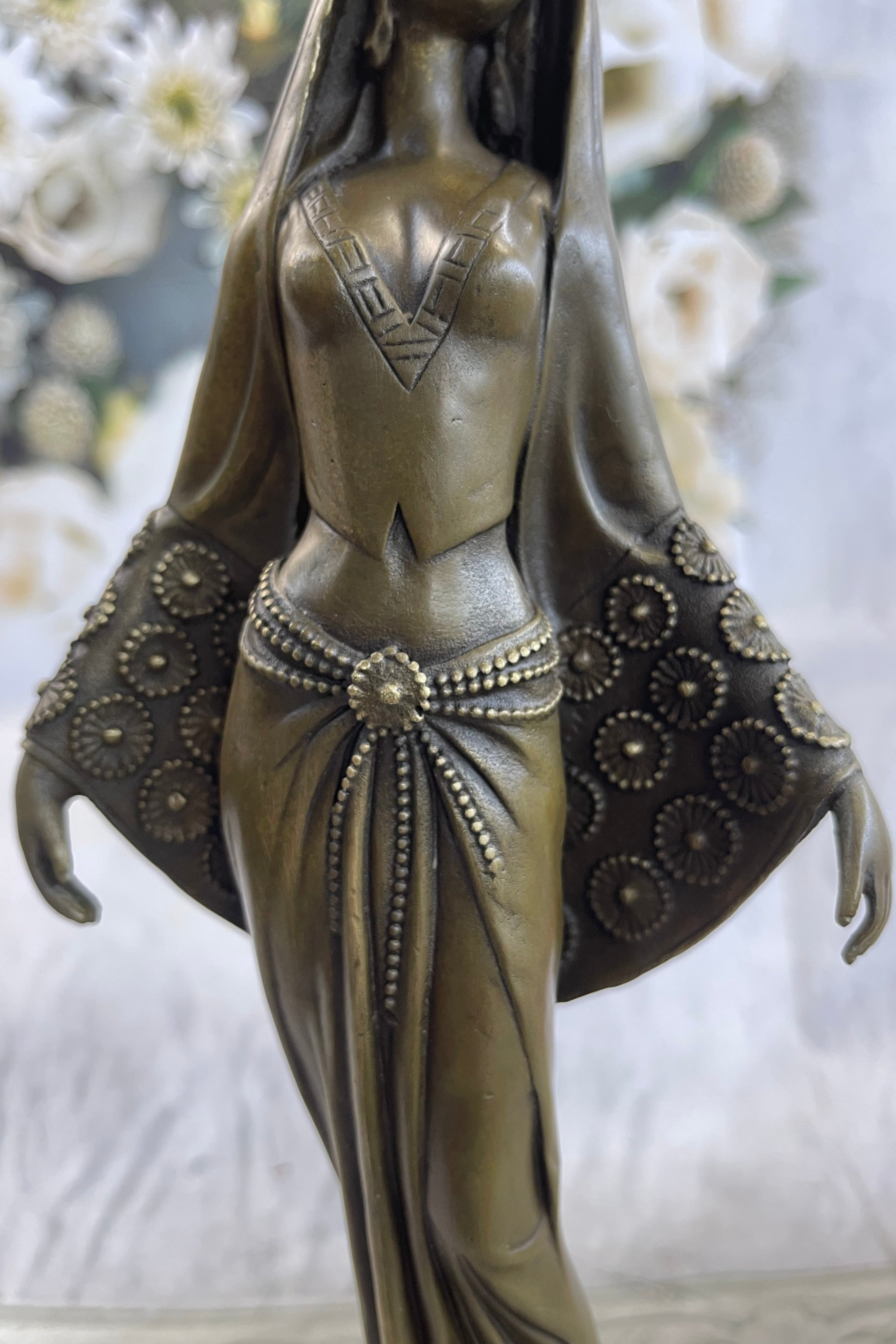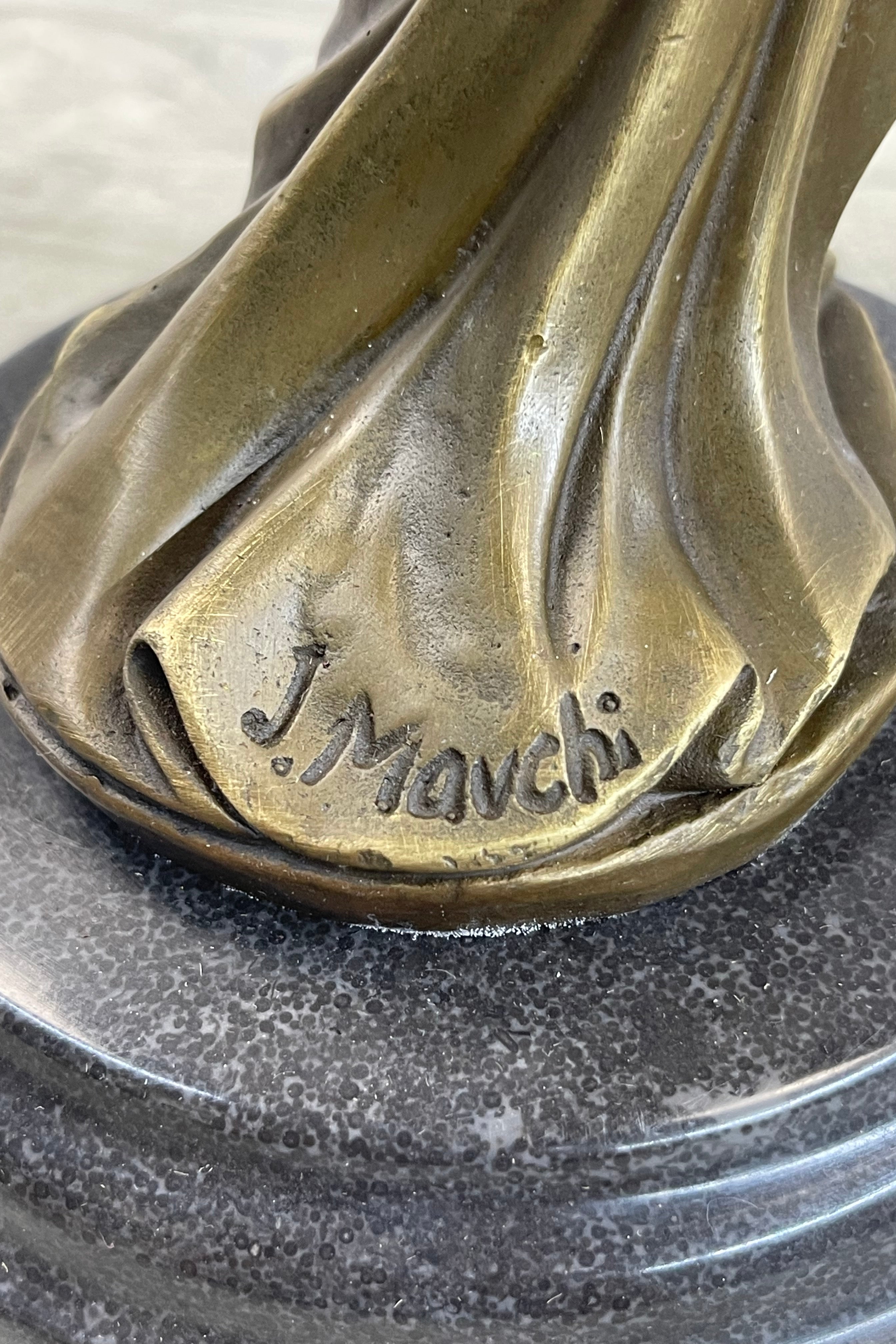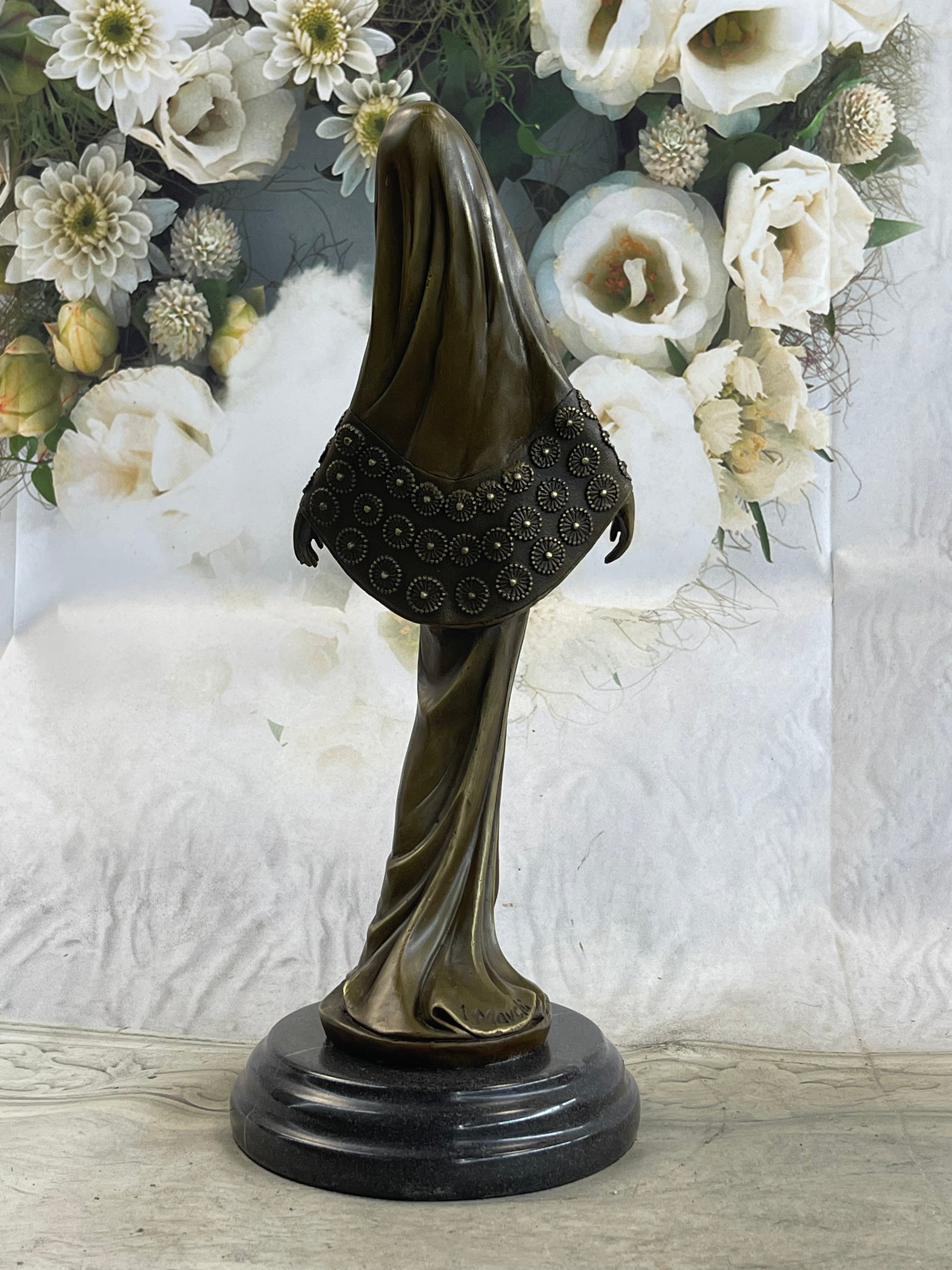 This captivating sculpture is a product of meticulous artistry, handcrafted in 100% bronze using the revered "Lost Wax Method." The resulting brown patina finish not only preserves its beauty but also enhances its intricate detailing. The sculpture rests on a sleek rectangular black marble base, adding a touch of sophistication to its presentation. Artist Mavchi's signature serves as a seal of authenticity, affirming the origins of this mesmerizing artwork.Bronze Dimensions with Marble Base: Height 13.5" X Width 5.5"