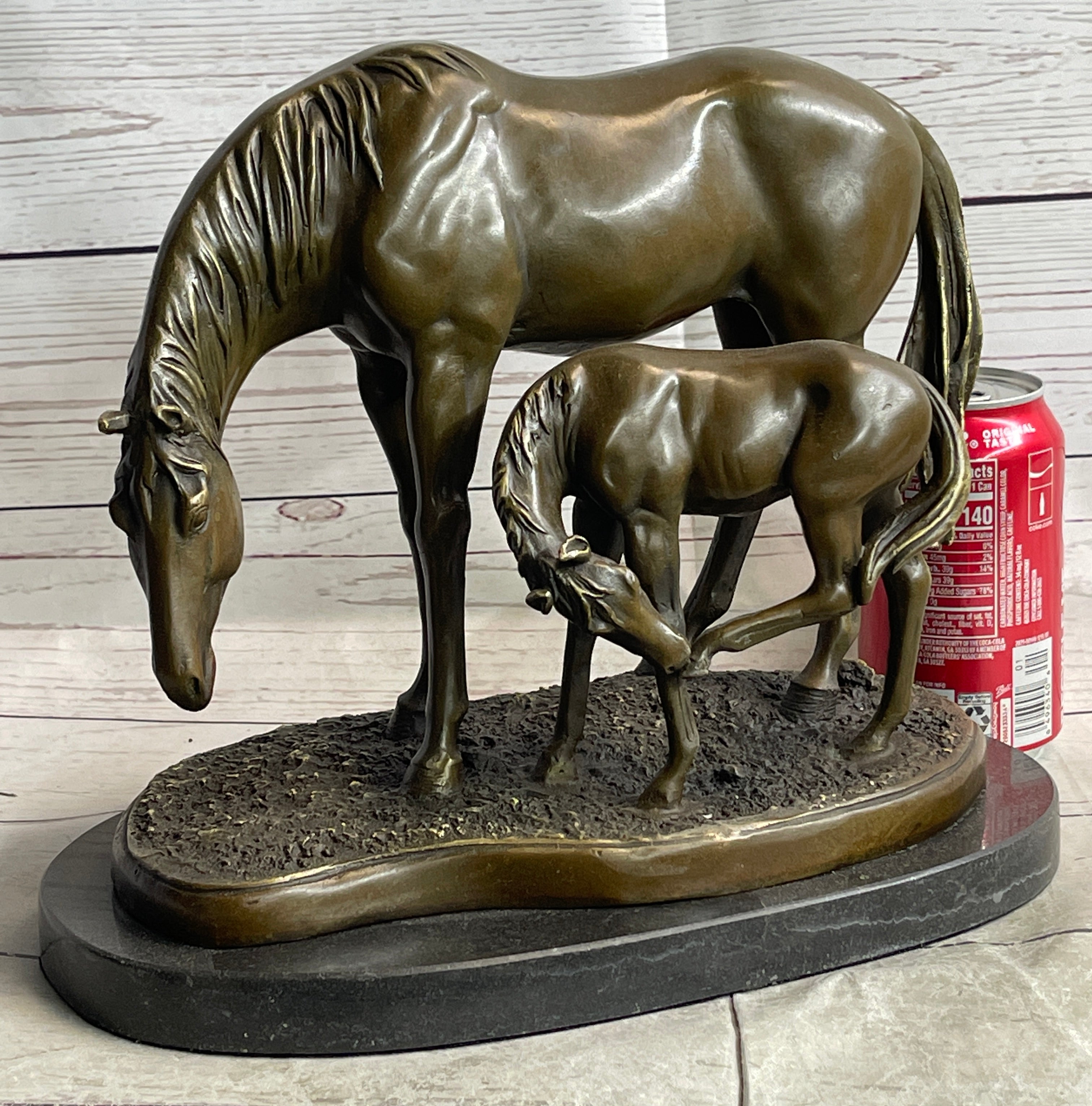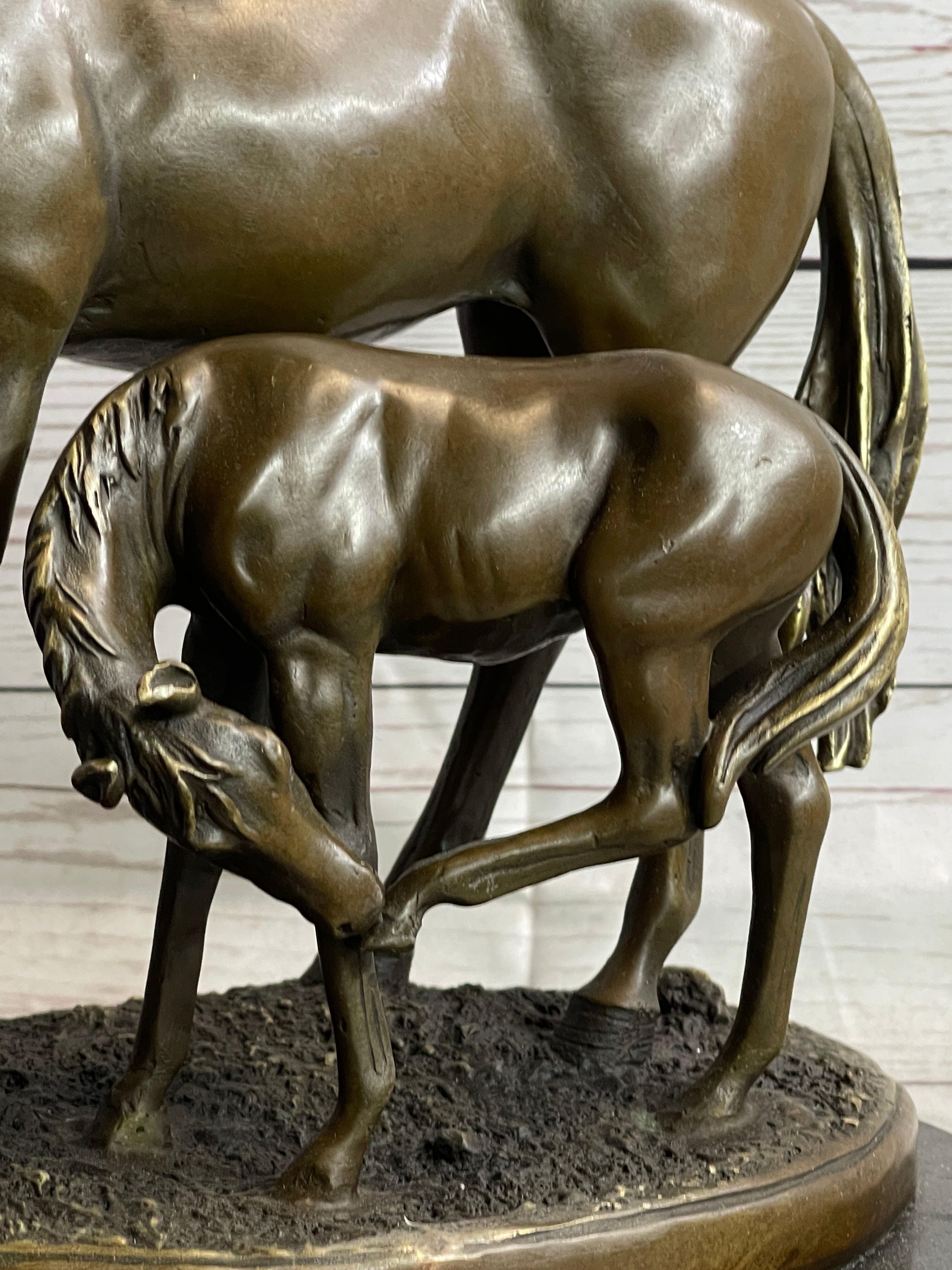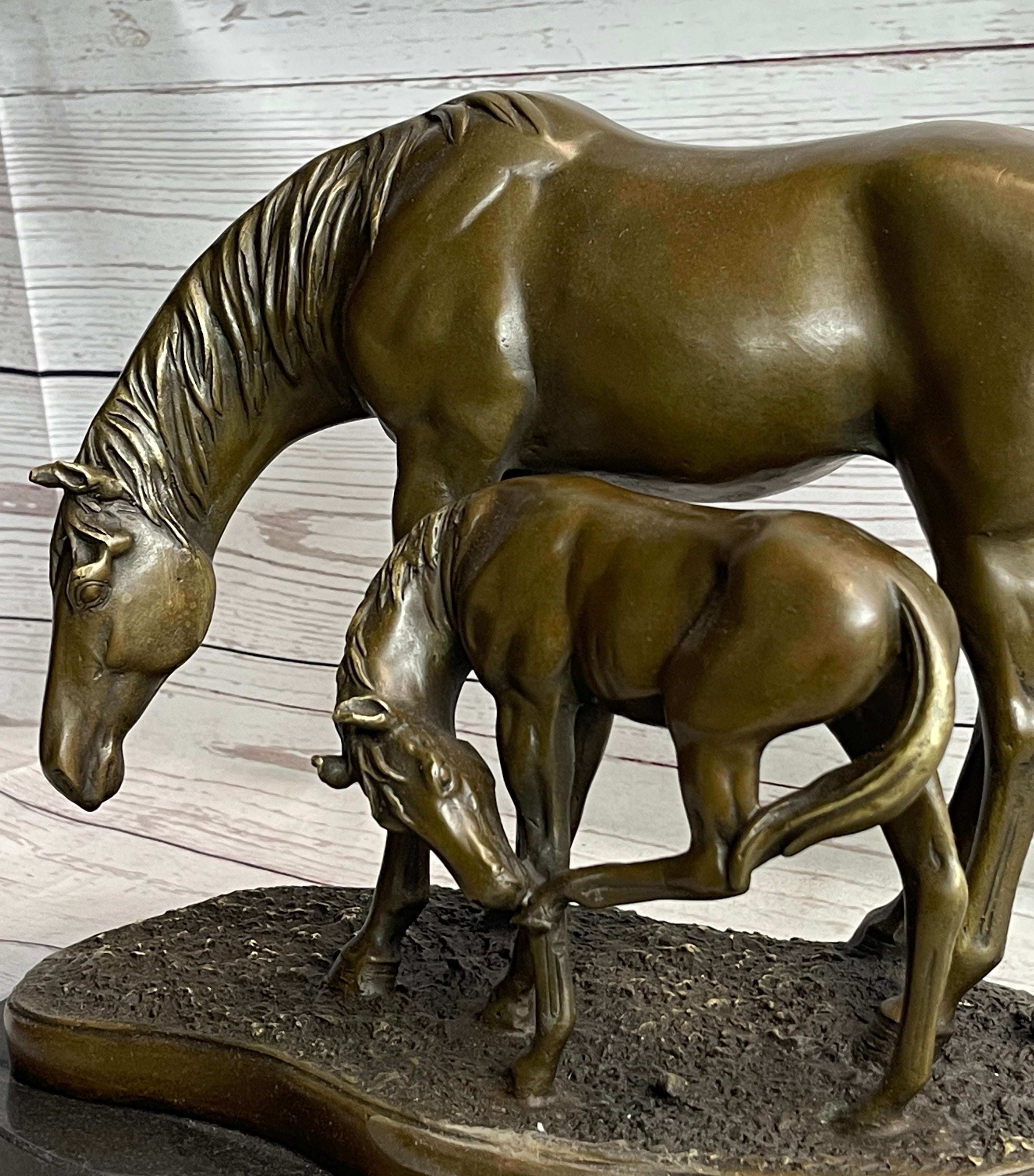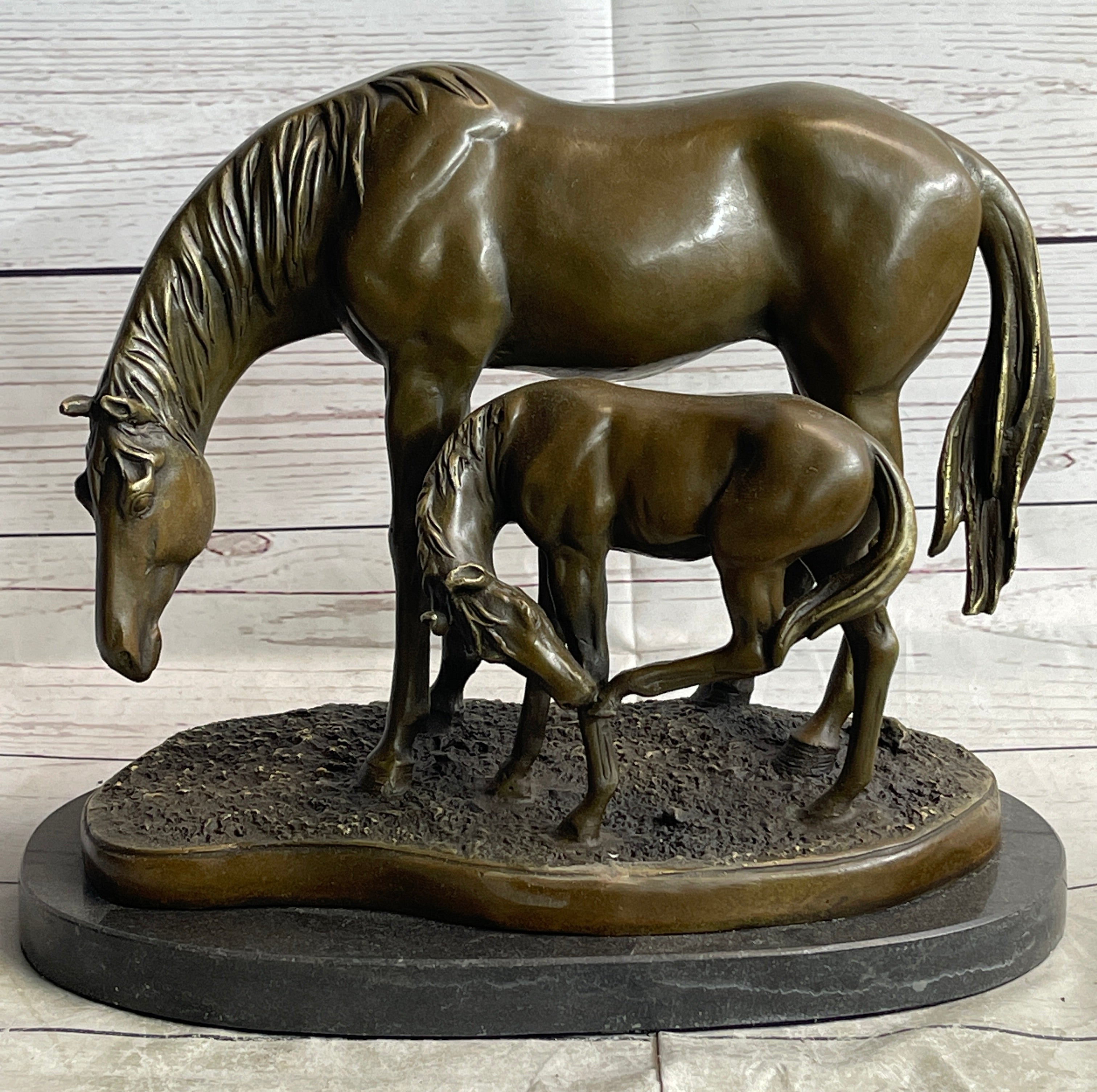 In this touching depiction, the mother mare tenderly leans down, her legs slightly wobbling, to gently touch noses with her newborn foal. The foal, with its legs sprawled, symbolizes the promise of vibrant adventures and boundless potential. This poignant scene captures the profound bond between mother and offspring, immortalizing a timeless moment of connection and love. Crafted using the ancient lost-wax casting method, the sculpture features a rich brown patina that ensures its enduring beauty and authenticity.