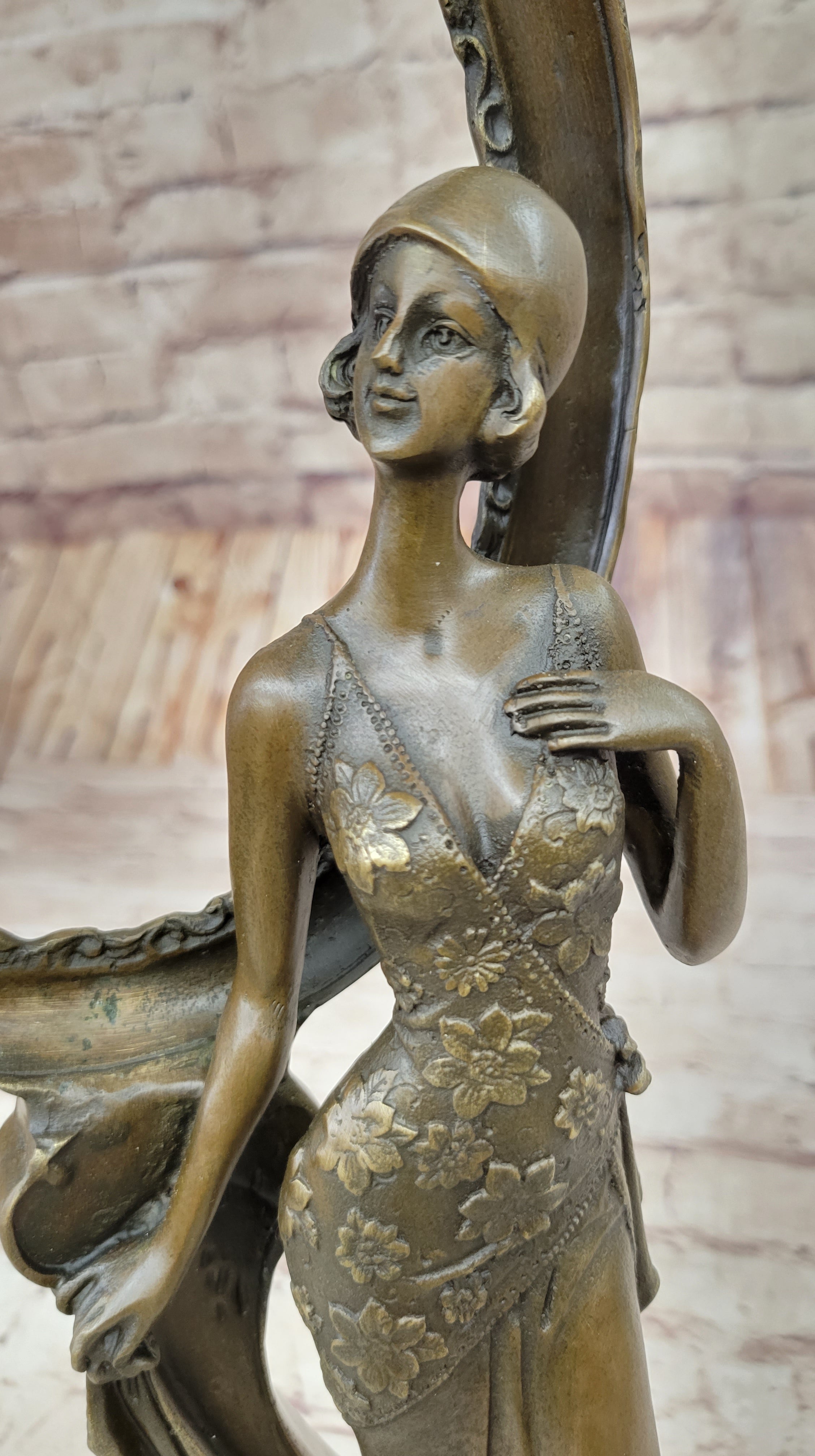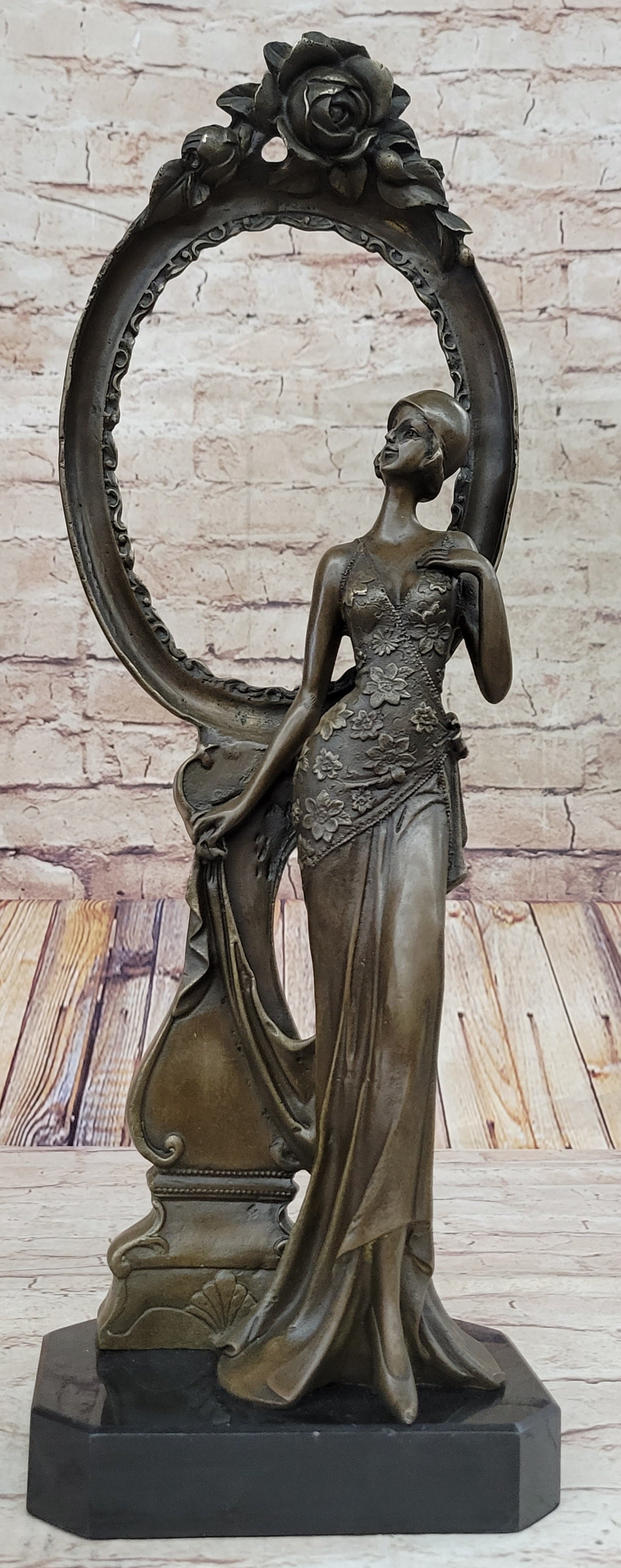 The sculpture features a graceful woman in a timeless design, showcasing Milo's exceptional skill and attention to detail. The bronze figure rests on a sleek black marble base, providing stability and a touch of elegance. The brown patina finish adds depth and character to the piece, making it a visually stunning addition to any space.