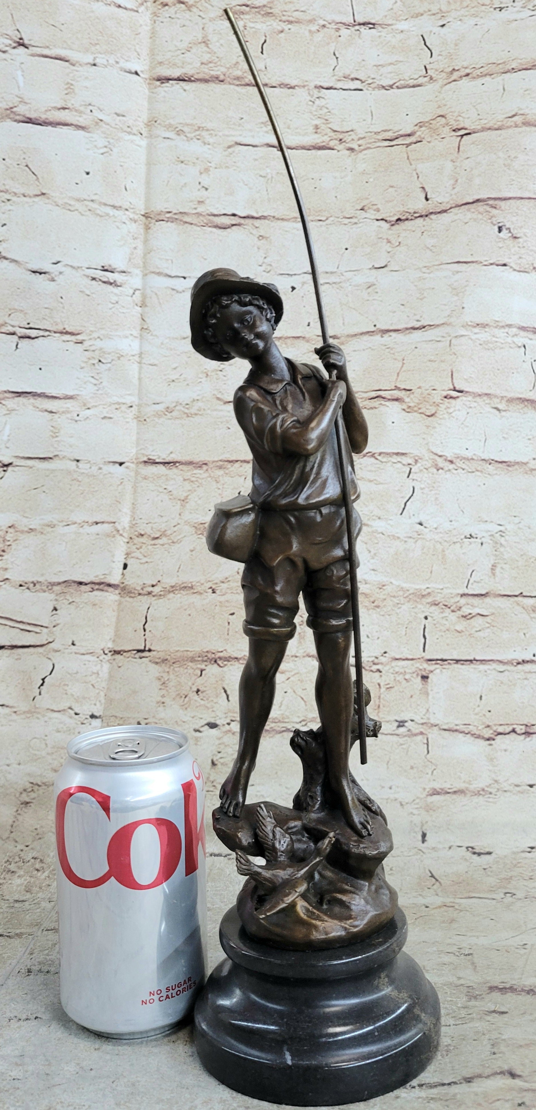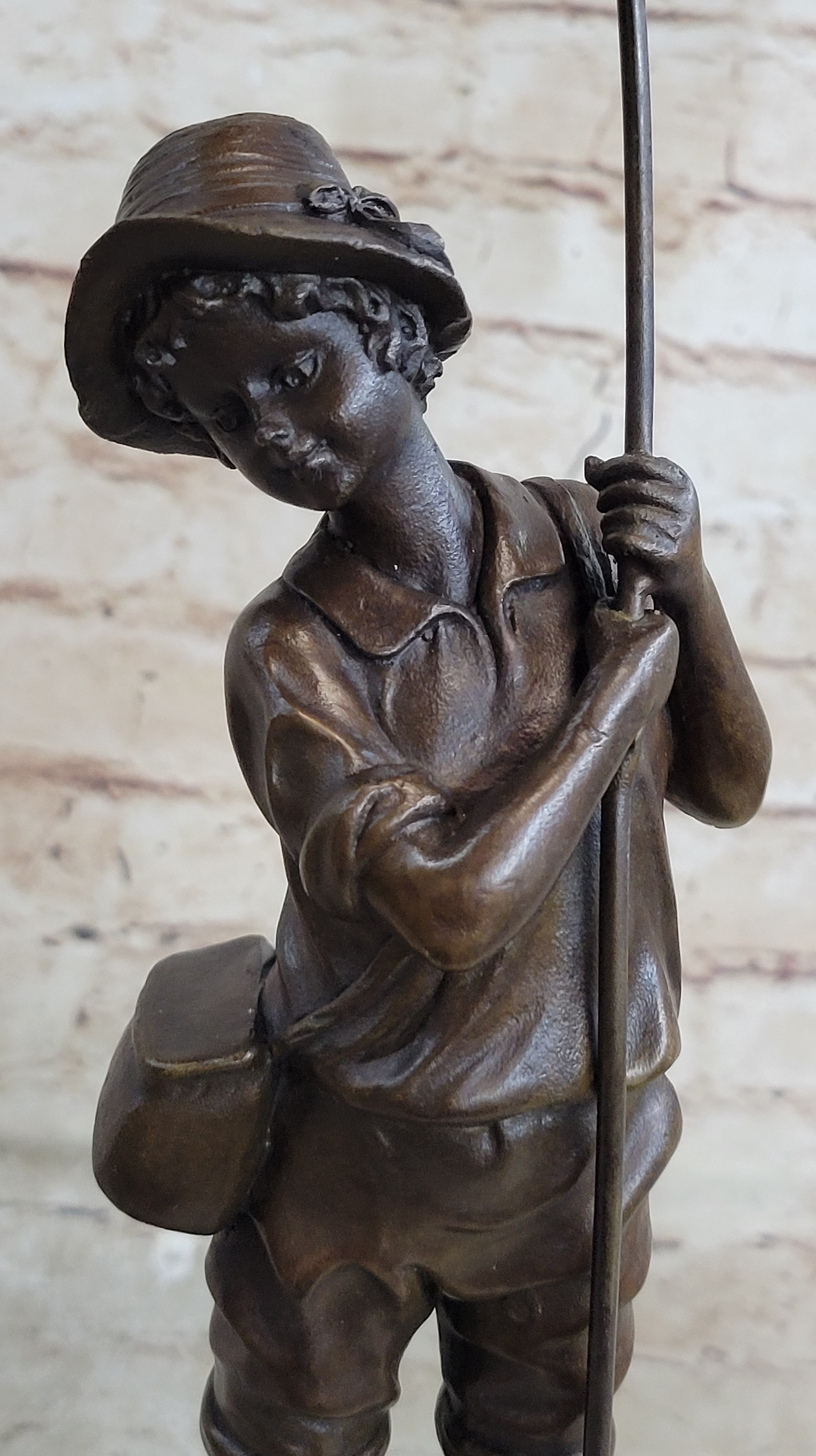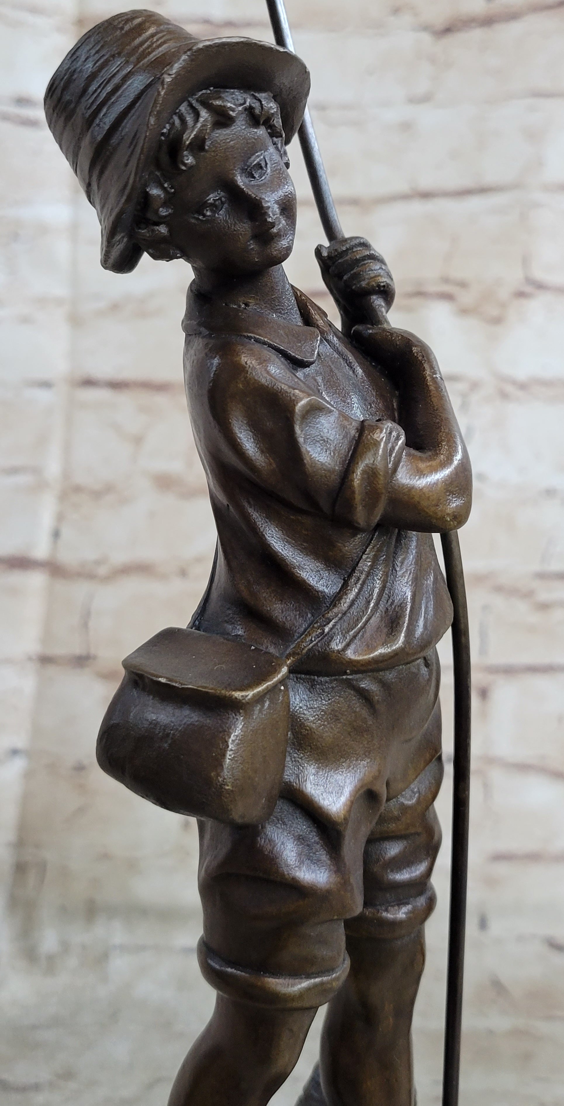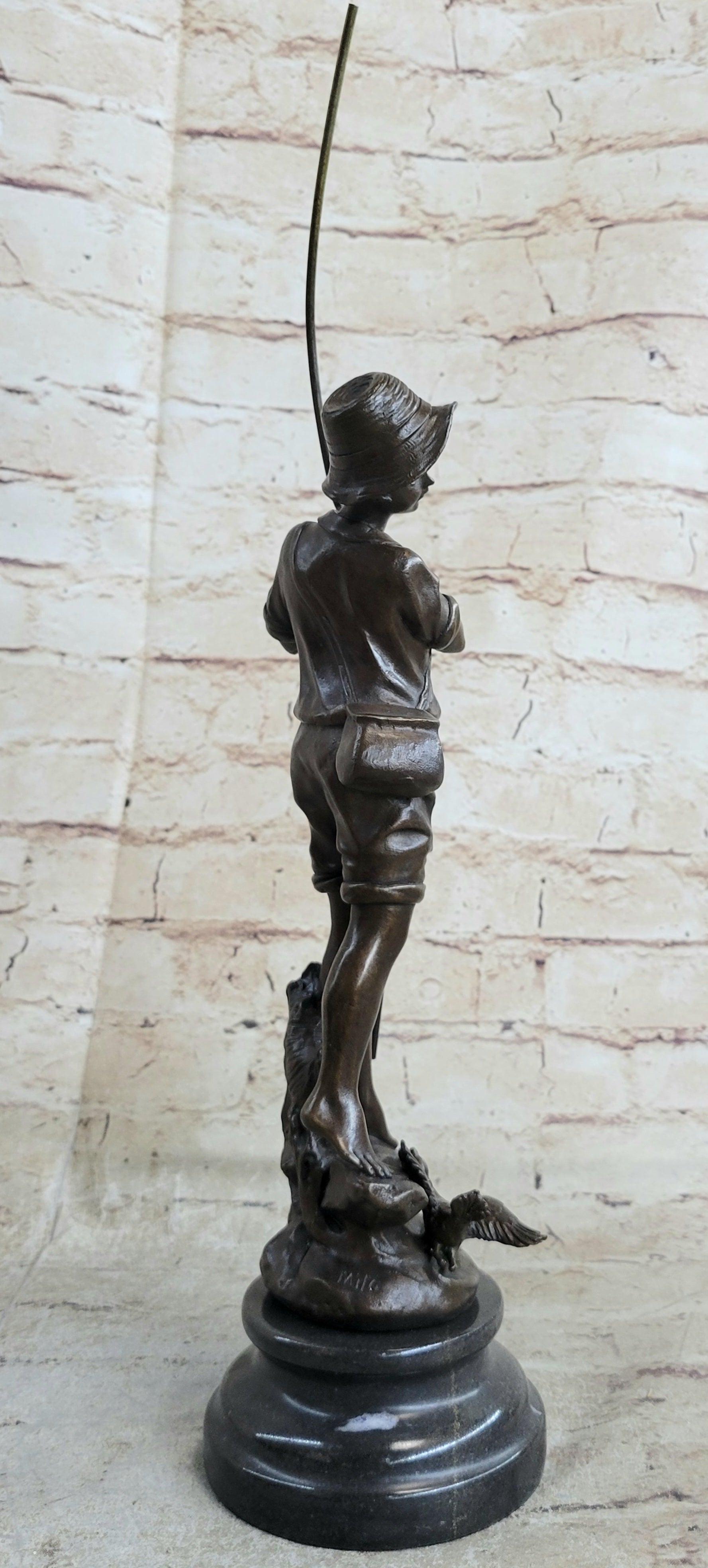 Signed Original Milo Boy Fishing With Duck Bronze Sculpture Statue Figurine Art