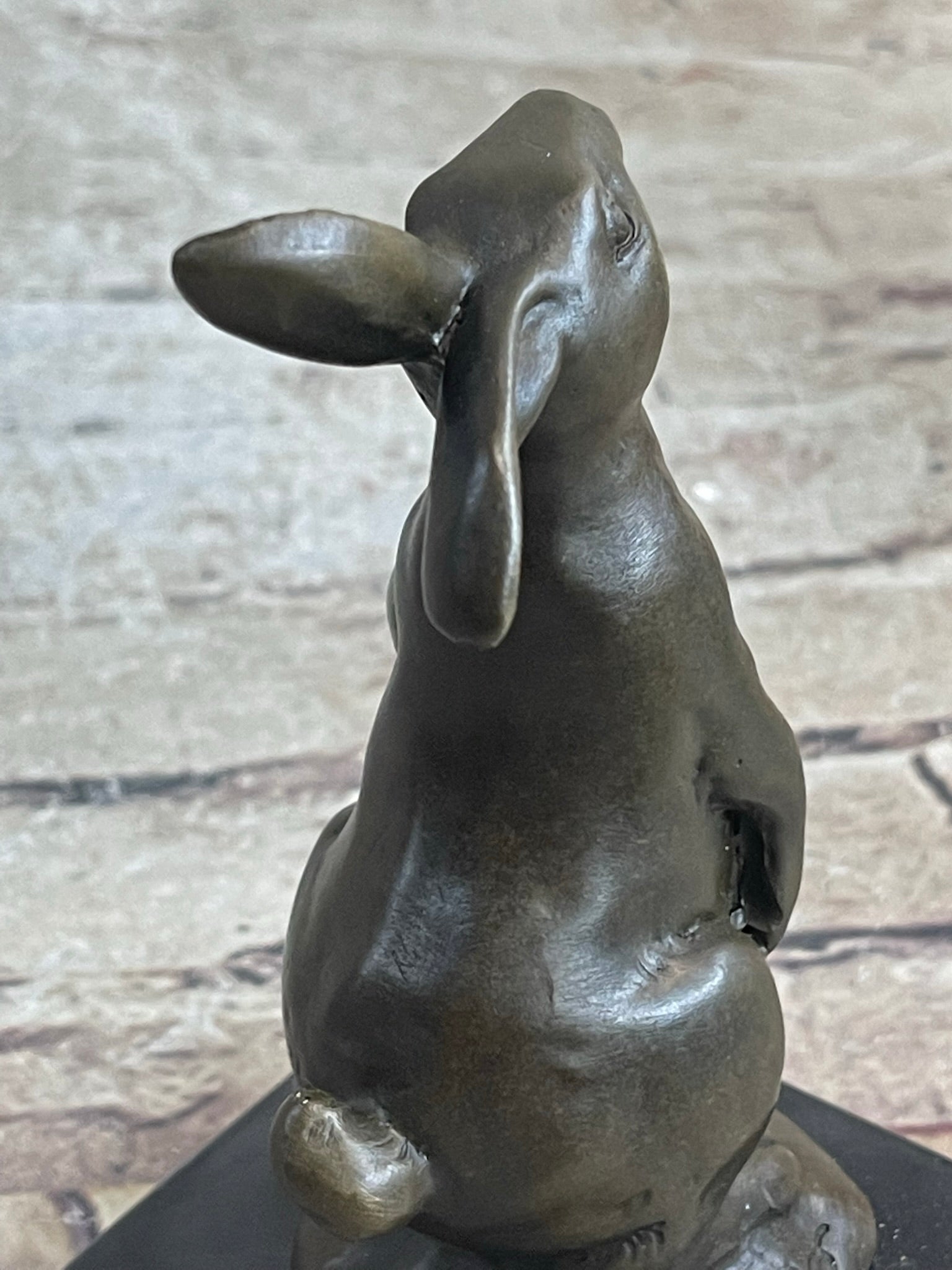 This adorable bunny sculpture captures the essence of sweetness and innocence, making it a perfect addition to any loving home. With a carrot held gently in its tiny arms, the cute bunny gazes up with a heartwarming expression, its long ears adding to its charm. Standing on its legs, the sculpture exudes a sense of curiosity and attention, making it an ideal decor piece for springtime and Easter-themed settings. The attention to detail in this sculpture is remarkable, with the artist skillfully crafting the bunny's facial features to give it a unique character and an endearing look. The two-tone brown patina finish adds depth and realism to the piece, enhancing its overall appeal. Mounted on a sleek black marble base, the sculpture is not only aesthetically pleasing but also showcases the artist's signature, Milo, ensuring its authenticity and quality. Whether displayed as a decorative accent or gifted to someone special, this bunny sculpture created using the "Lost Wax Method" embodies the joy and charm of the spring season, making it a delightful addition to any collection of fine art sculptures.