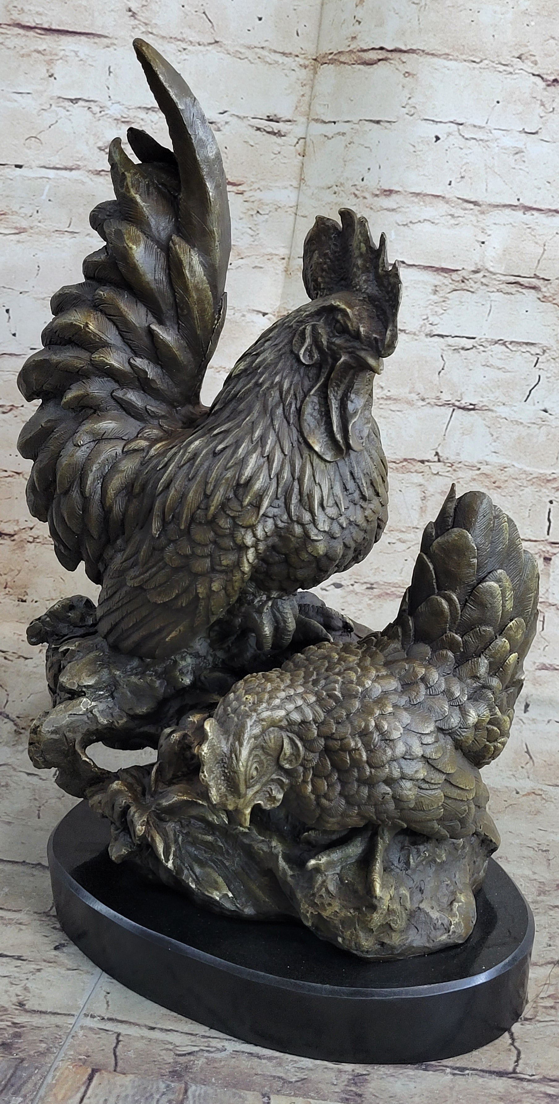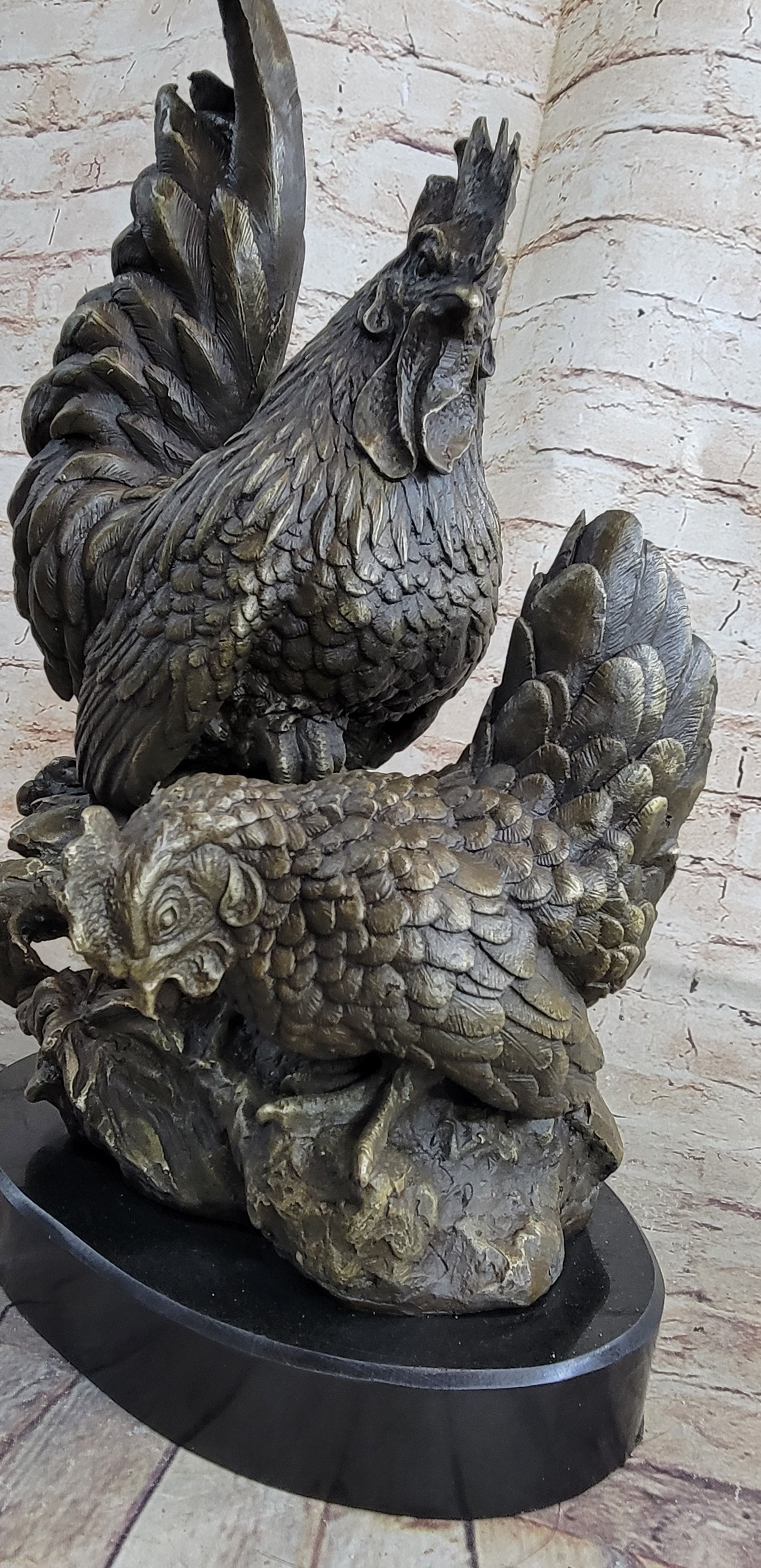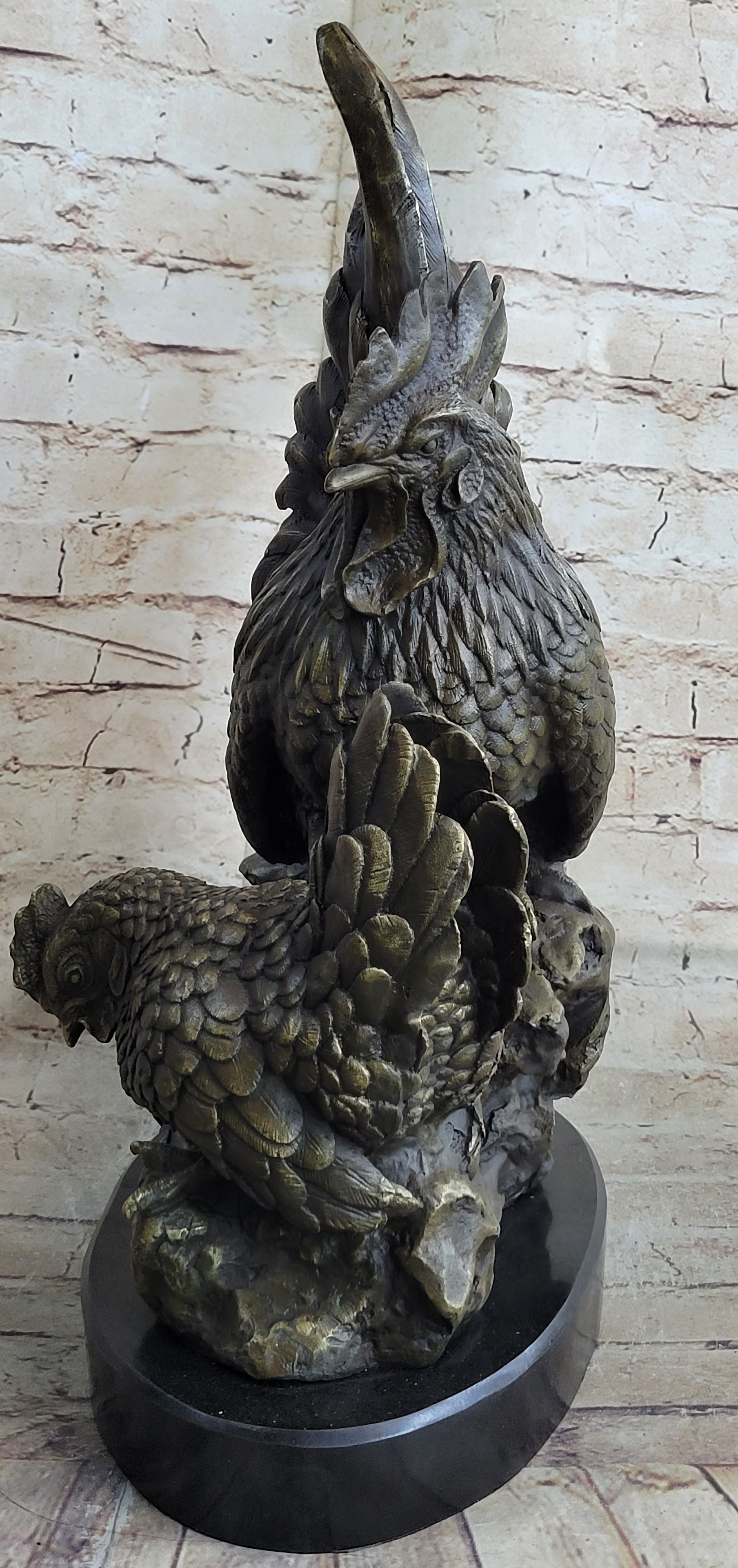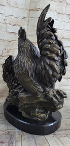 Two Roosters Chickens Bronze Metal Statue Sculpture Figure on Marble Base