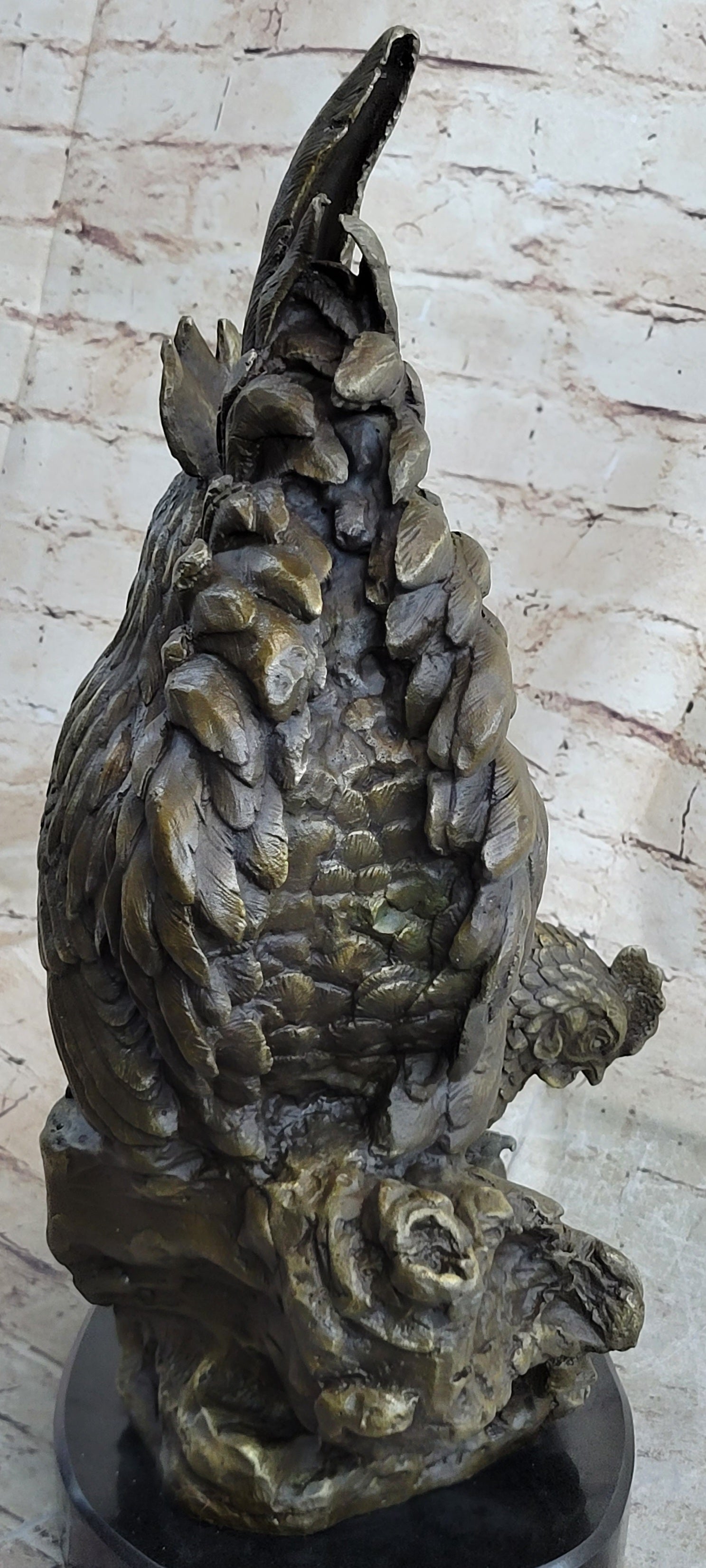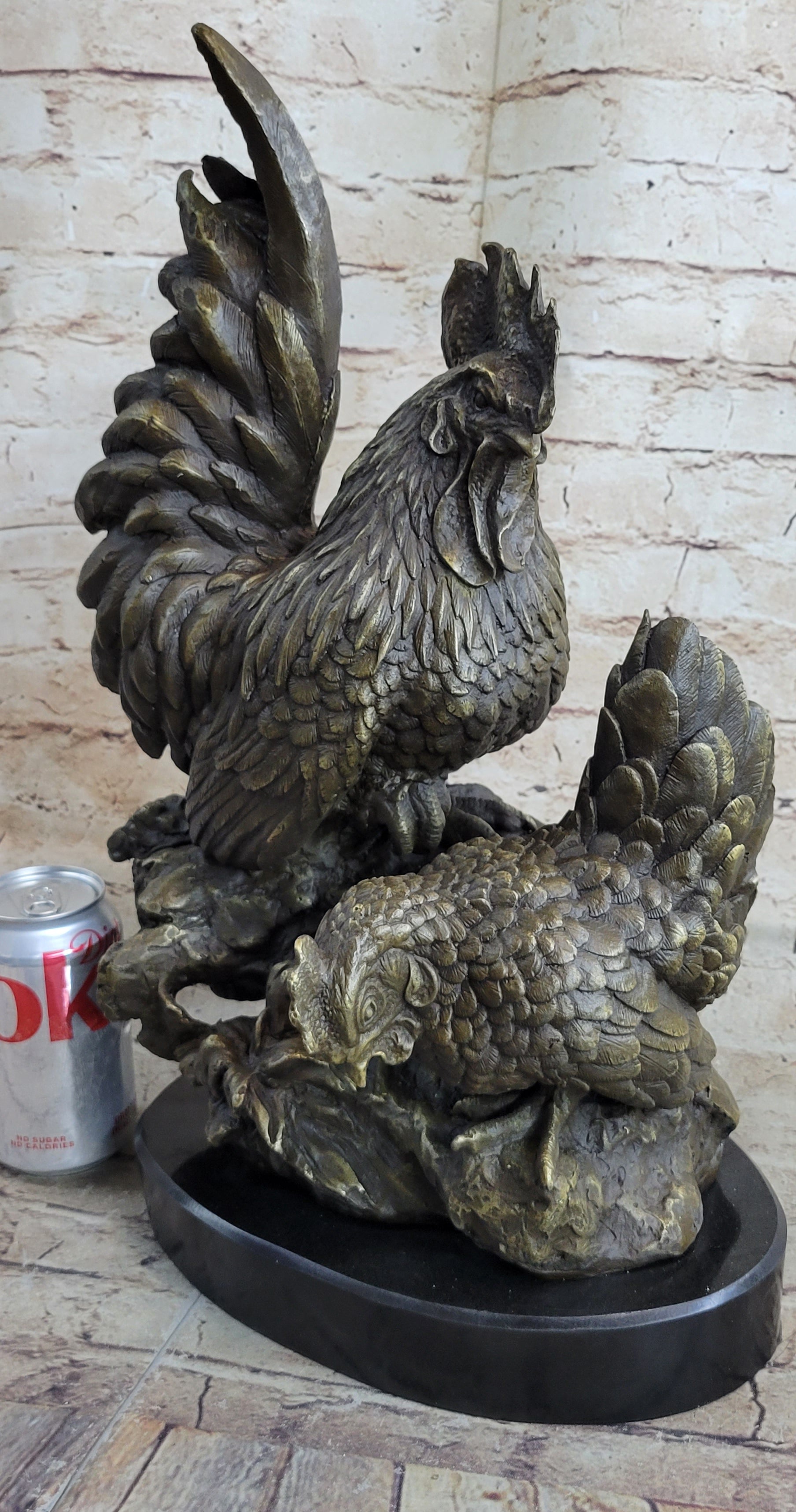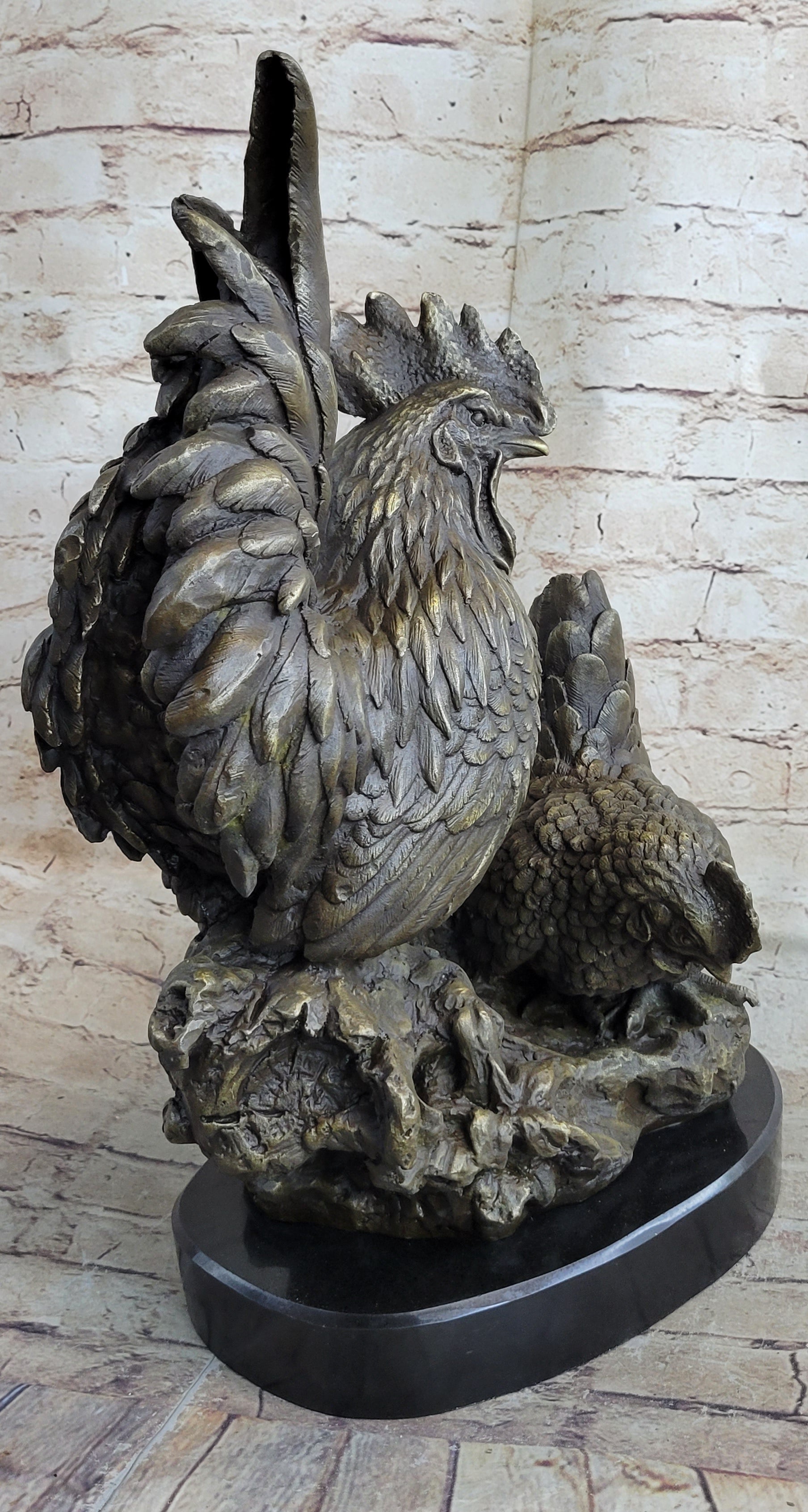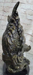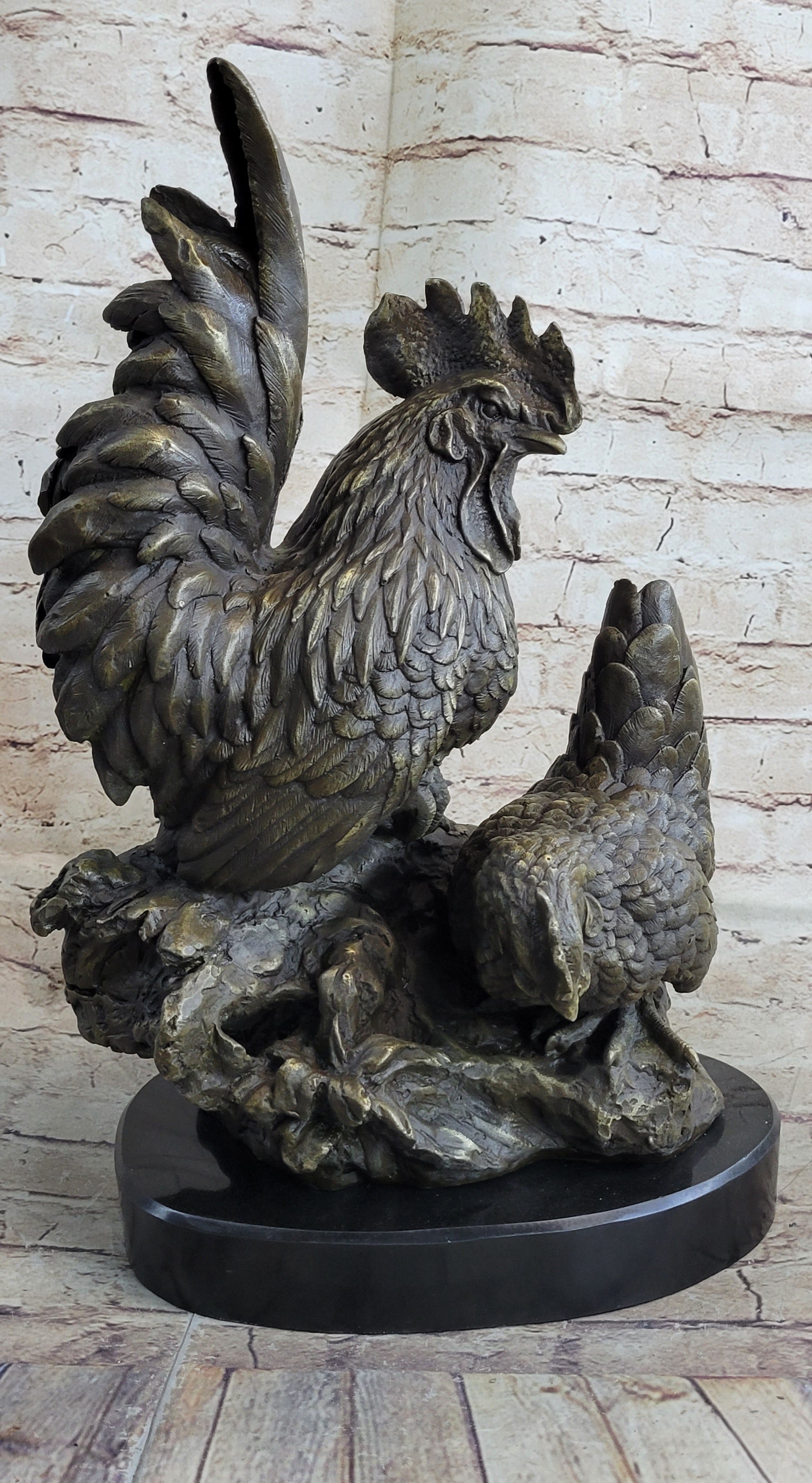 Two Roosters Chickens Bronze Metal Statue Sculpture Figure on Marble Base