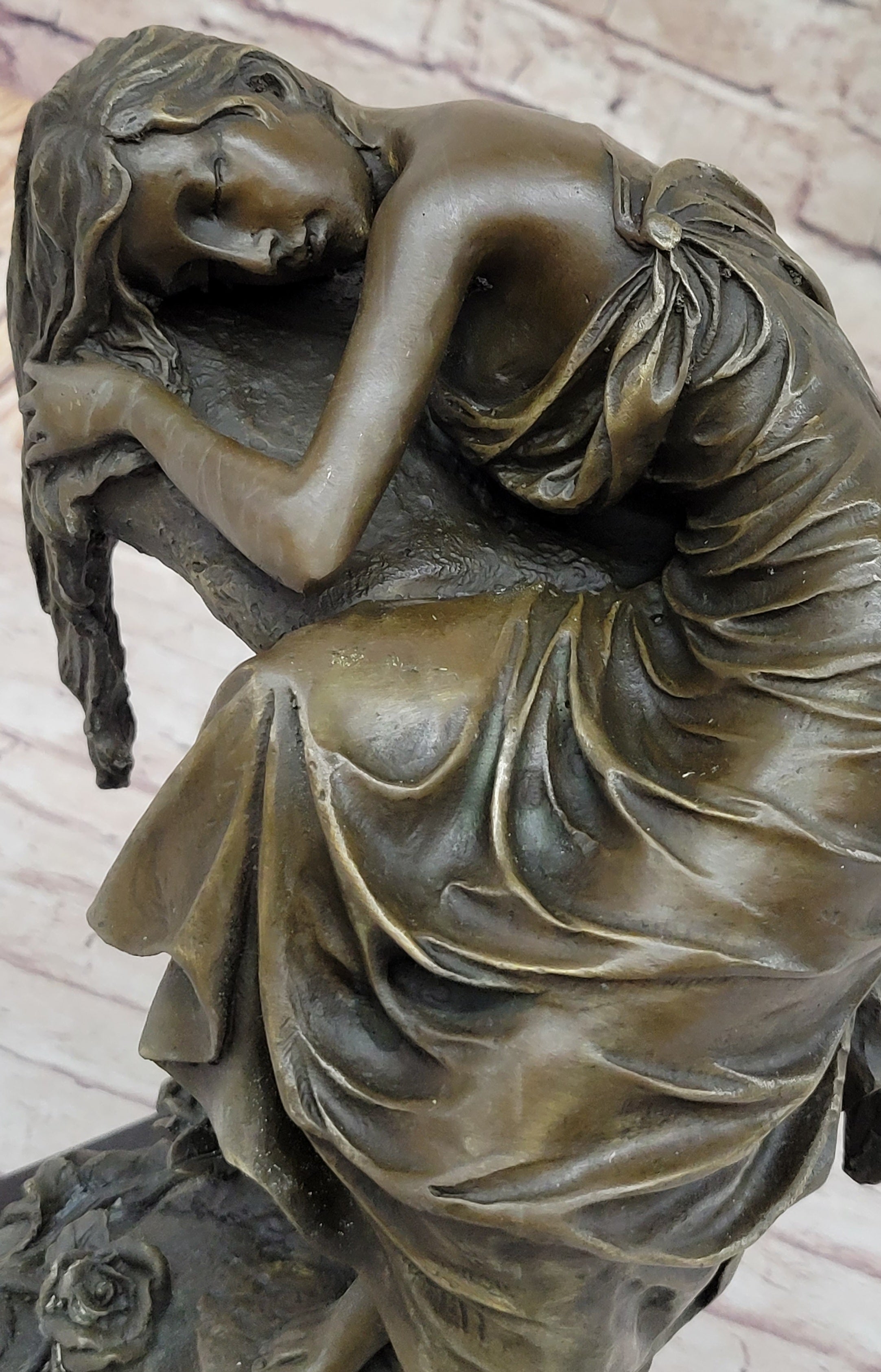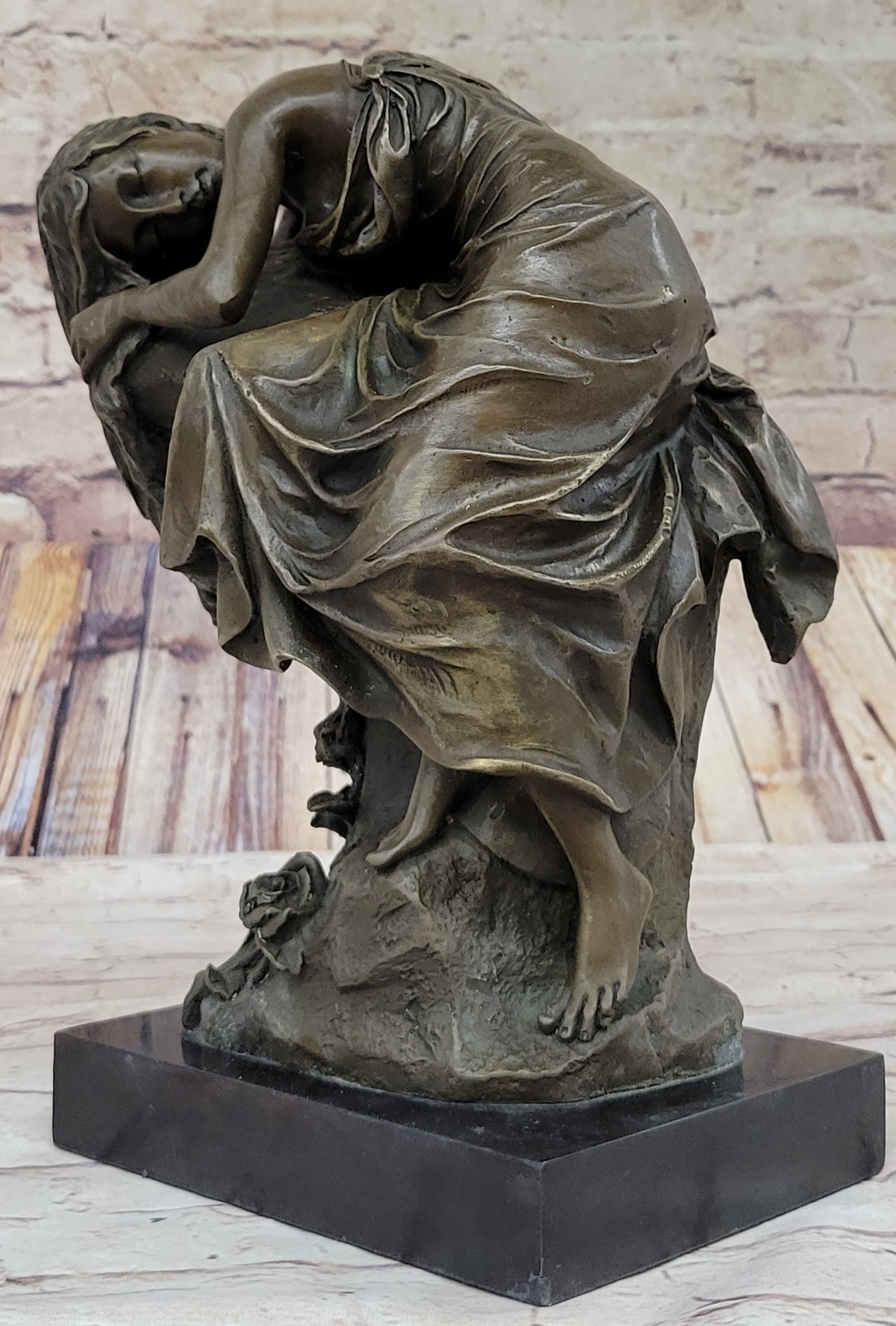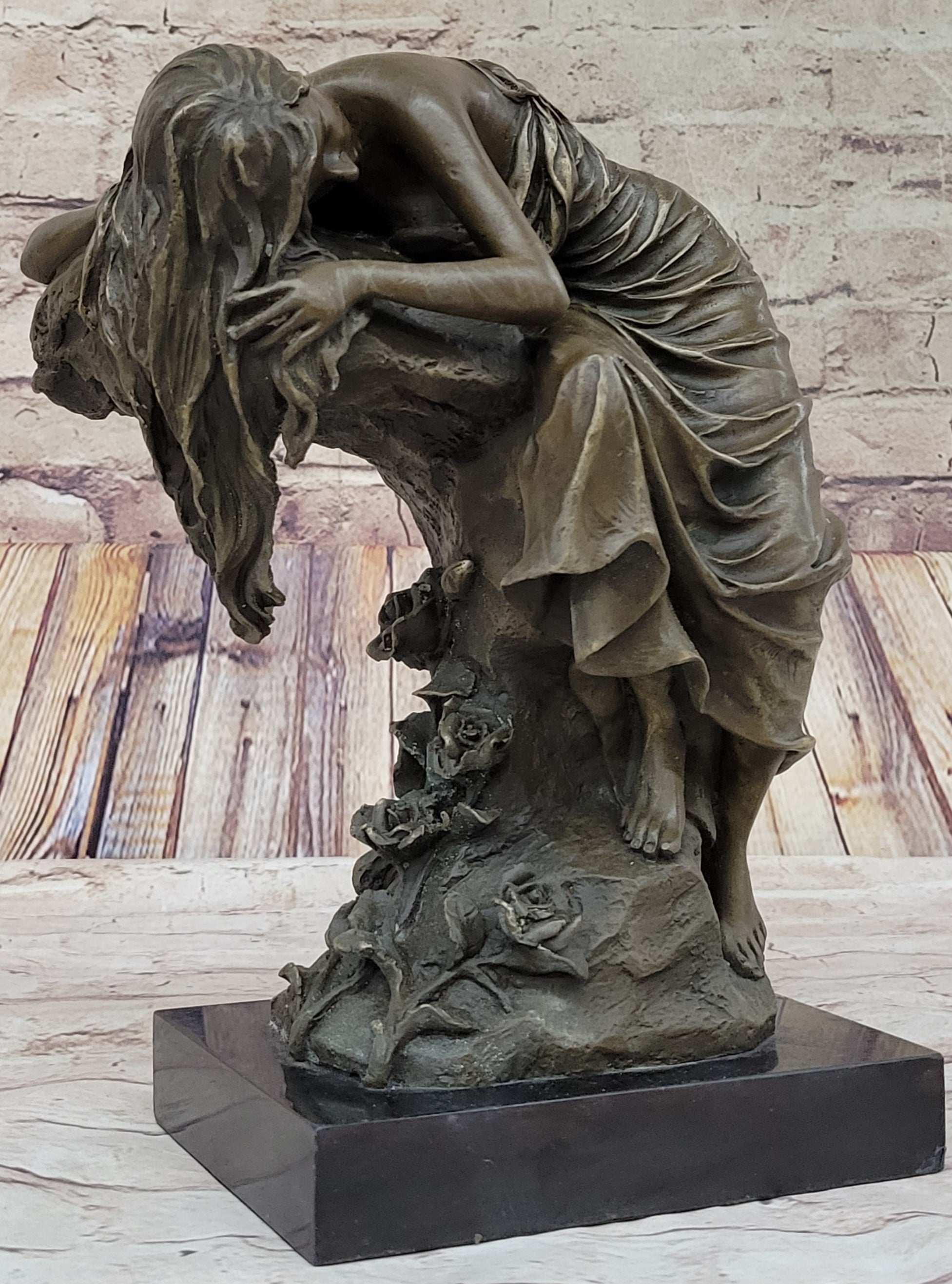Every detail of this sculpture is a testament to the artist's mastery and attention to nuance. The flow of her hair, cascading like a waterfall over her face and the rock, adds an element of dynamism to the composition. Her form pressed against the rock conveys an intimate connection with nature, accentuated by the careful craftsmanship evident in her fingers and toes, each etched with intricate precision.