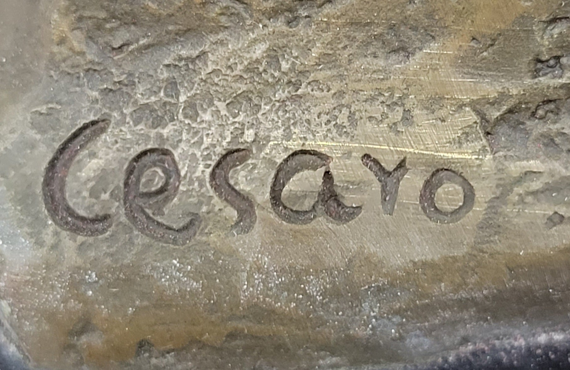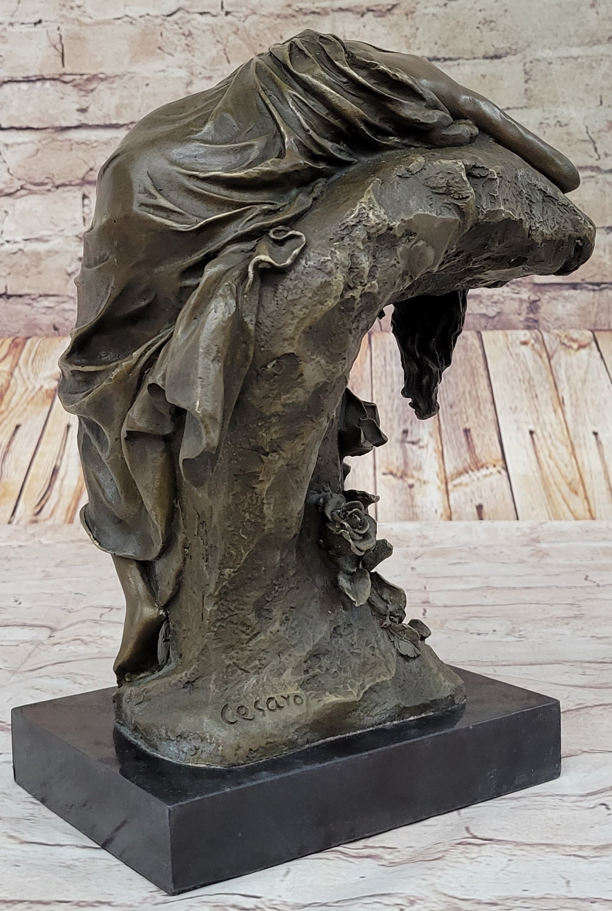 Crafted through the revered "Lost Wax Method," this sculpture stands as a true embodiment of artistic finesse. The warm brown patina that envelops its surface not only lends it a timeless beauty but also pays homage to the sculpting tradition. Artist Cesaro's signature adds the final touch, symbolizing both authenticity and quality. This masterpiece is not merely a sculpture; it's an expression of sensuality and sophistication that will undoubtedly enrich any art collection it graces.Bronze Dimensions with Marble Base: Height 11" X Width 9"